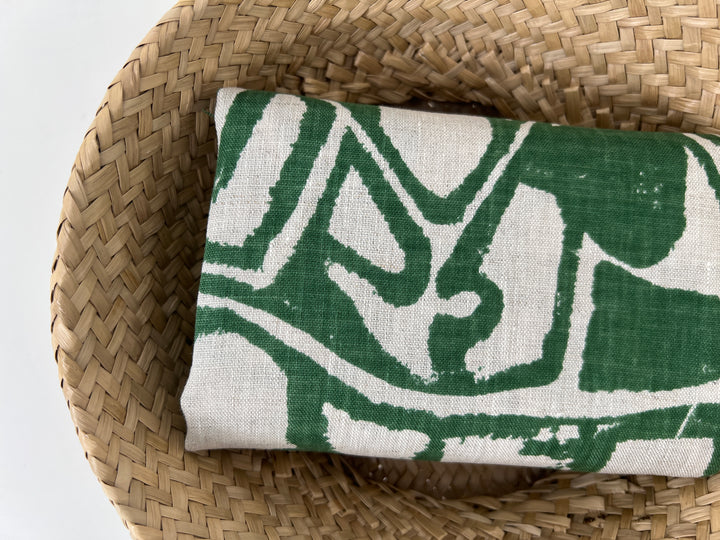 Bring an artistic touch to your projects with this 100% linen fabric featuring a bold green abstract print on a light natural base. Woven with fine 14s linen yarn in both warp and weft, the cloth offers a refined texture with a lightweight to medium body (187 g/sqm).