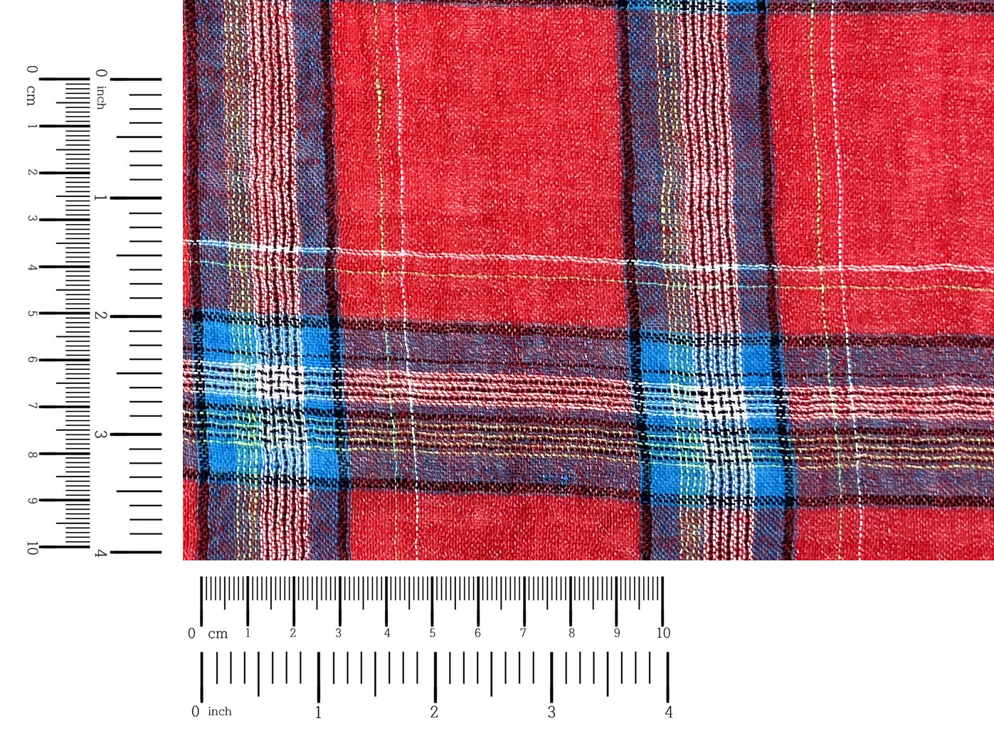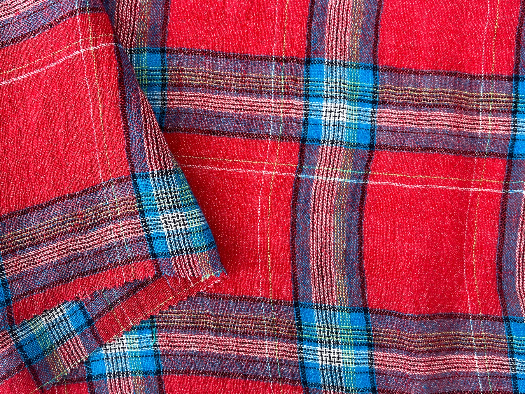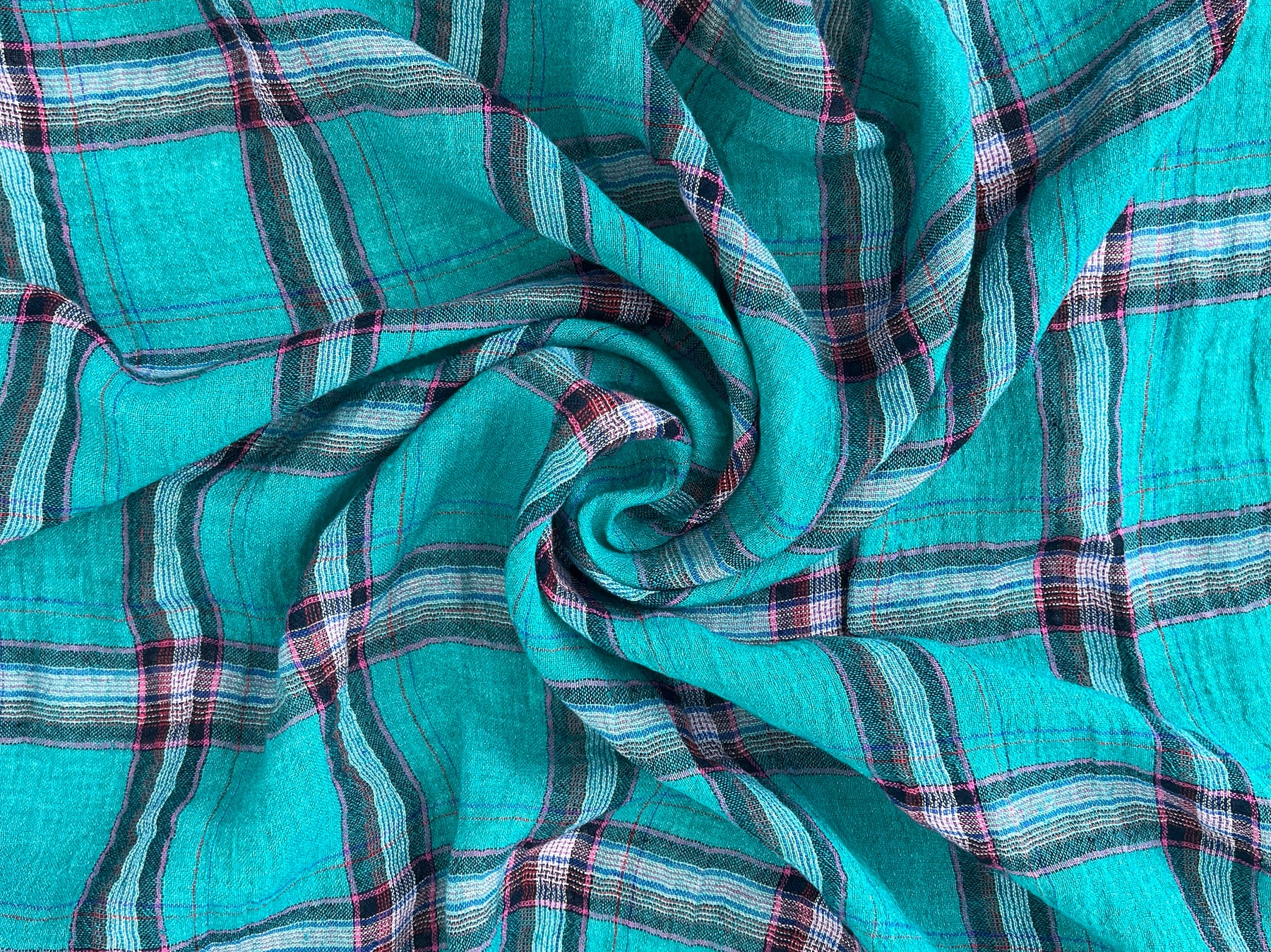 This plaid linen blend fabric comes in two vibrant colors – classic red and teal green – making it a versatile choice for both clothing and home projects.