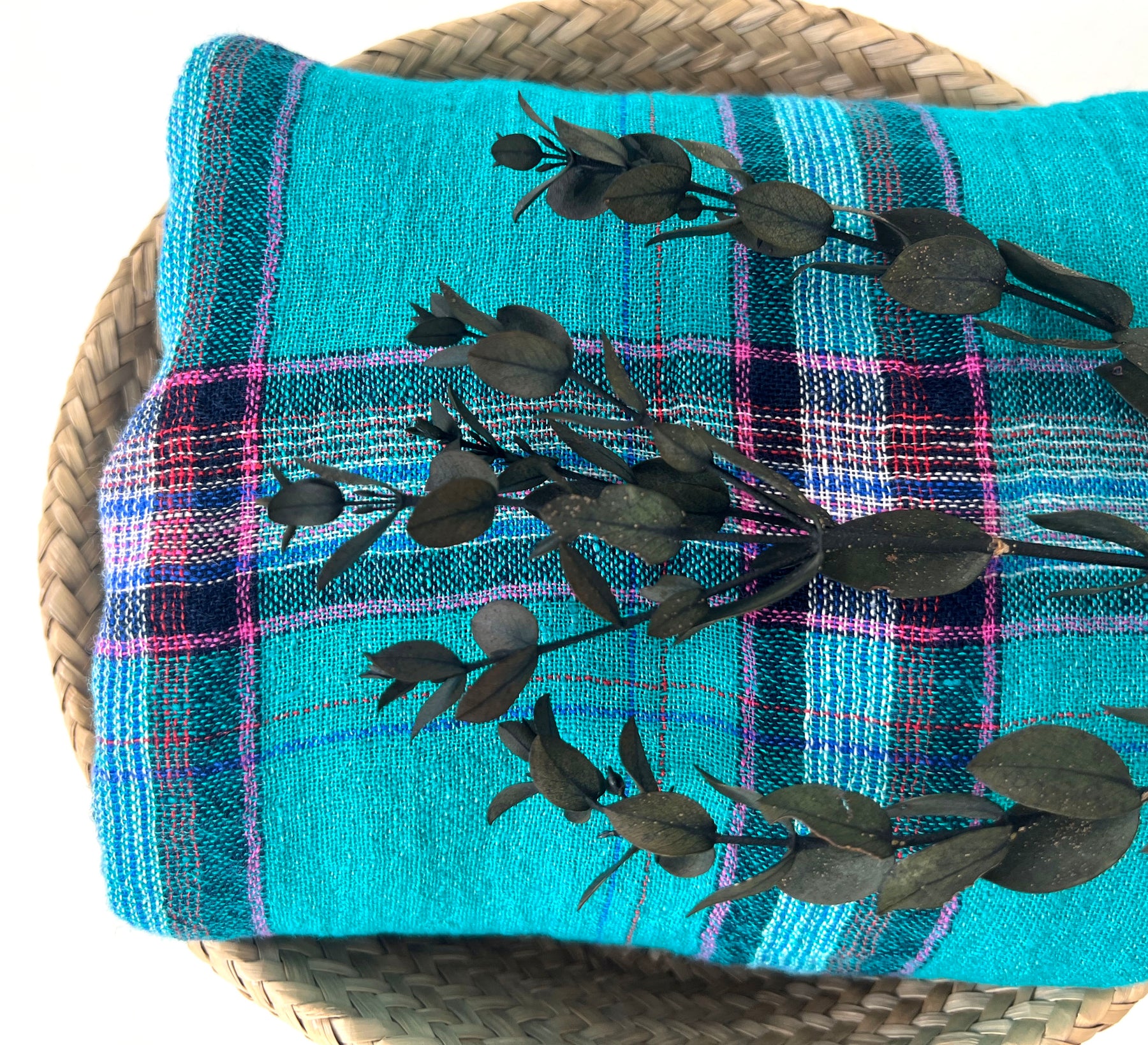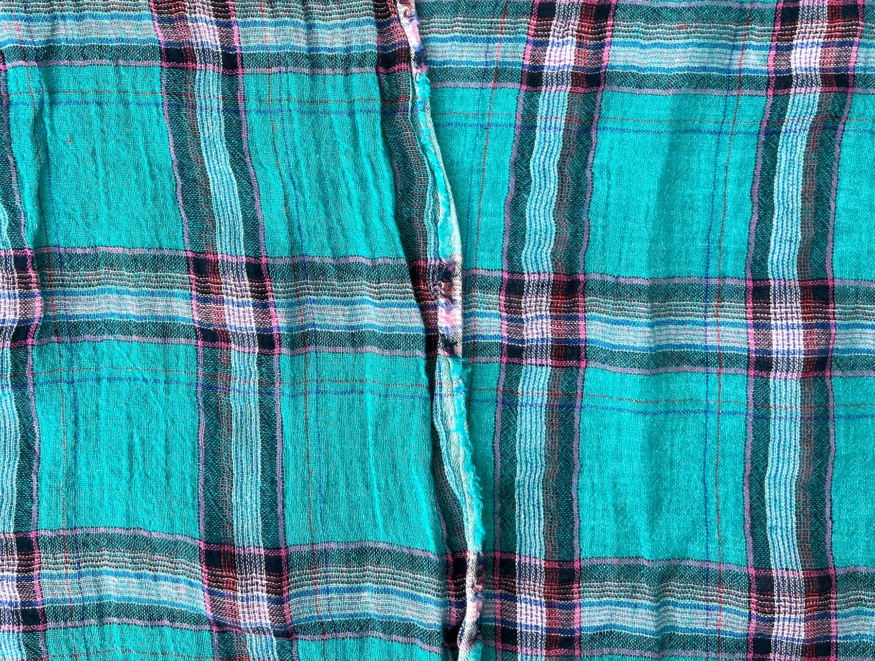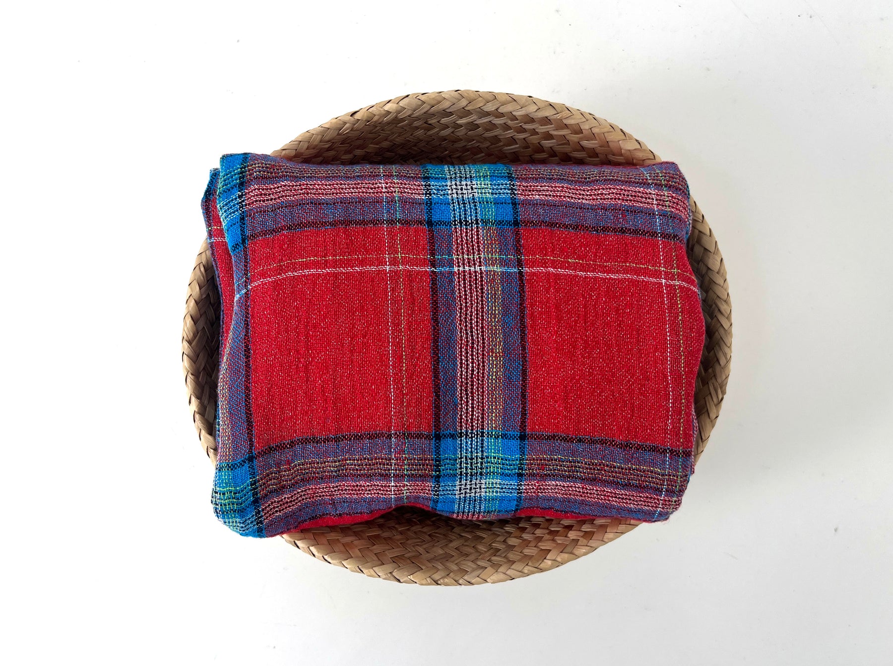 This plaid linen blend fabric comes in two vibrant colors – classic red and teal green – making it a versatile choice for both clothing and home projects.
