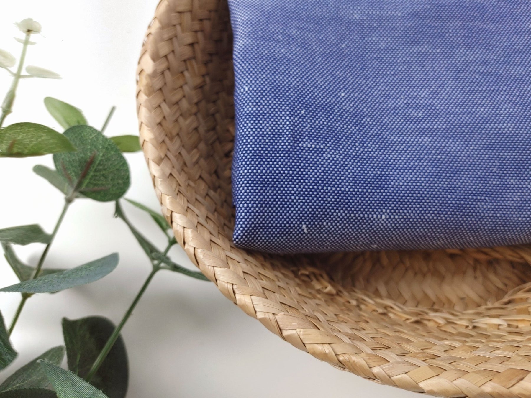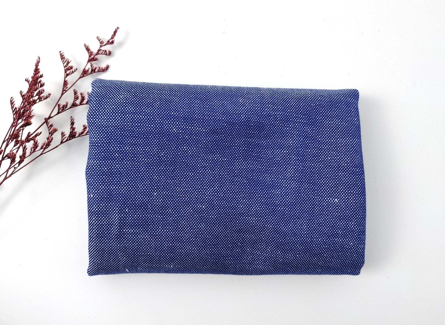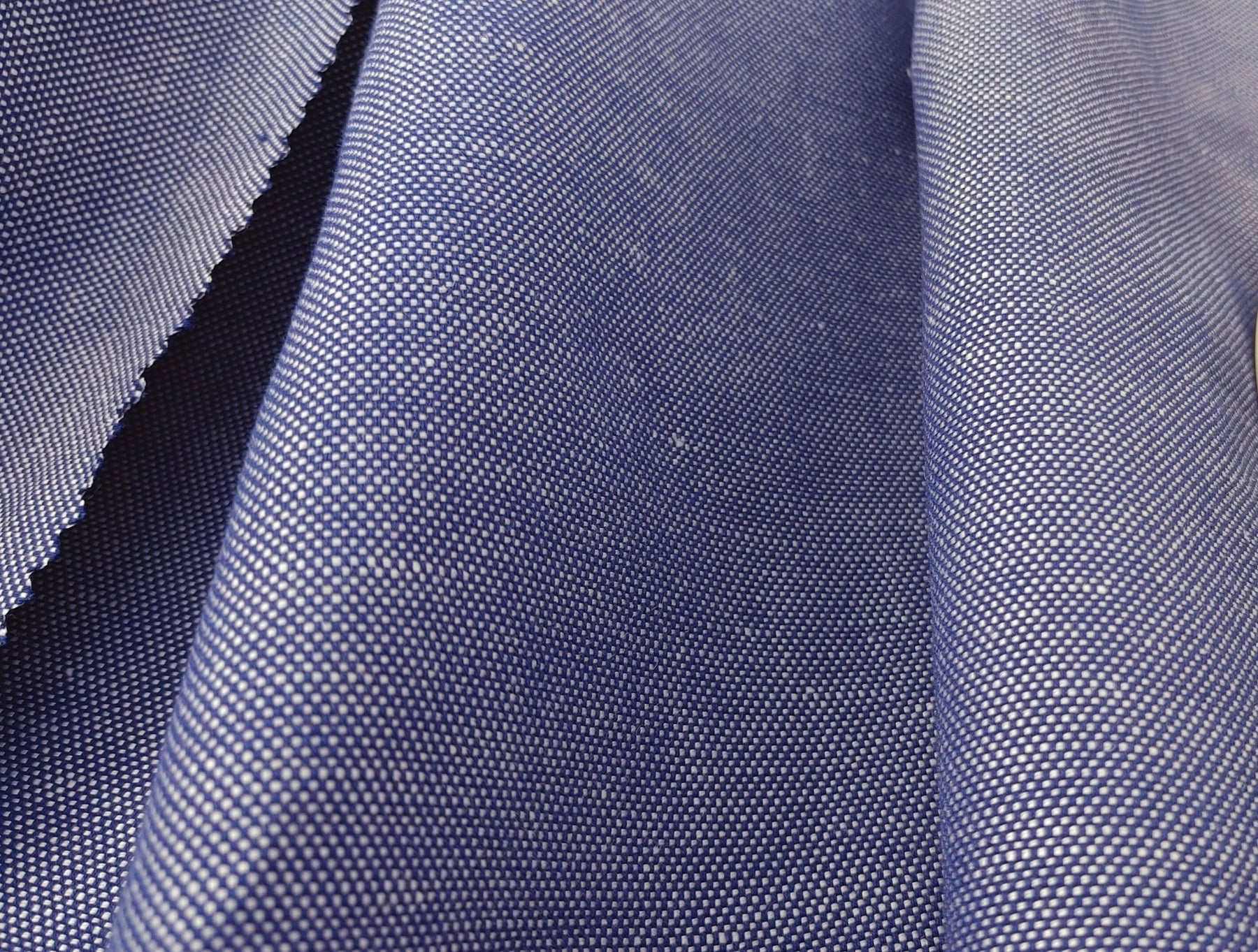 Introducing a linen cotton navy chambray canvas fabric with a canvas weave, specifically a 4:2 MAT weave. The warp is crafted from compact cotton yarn CM60/2, while the weft elegantly features linen yarn.