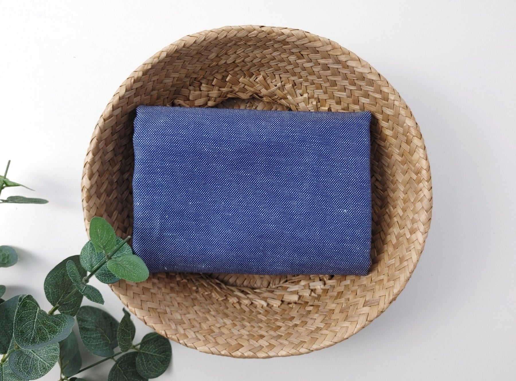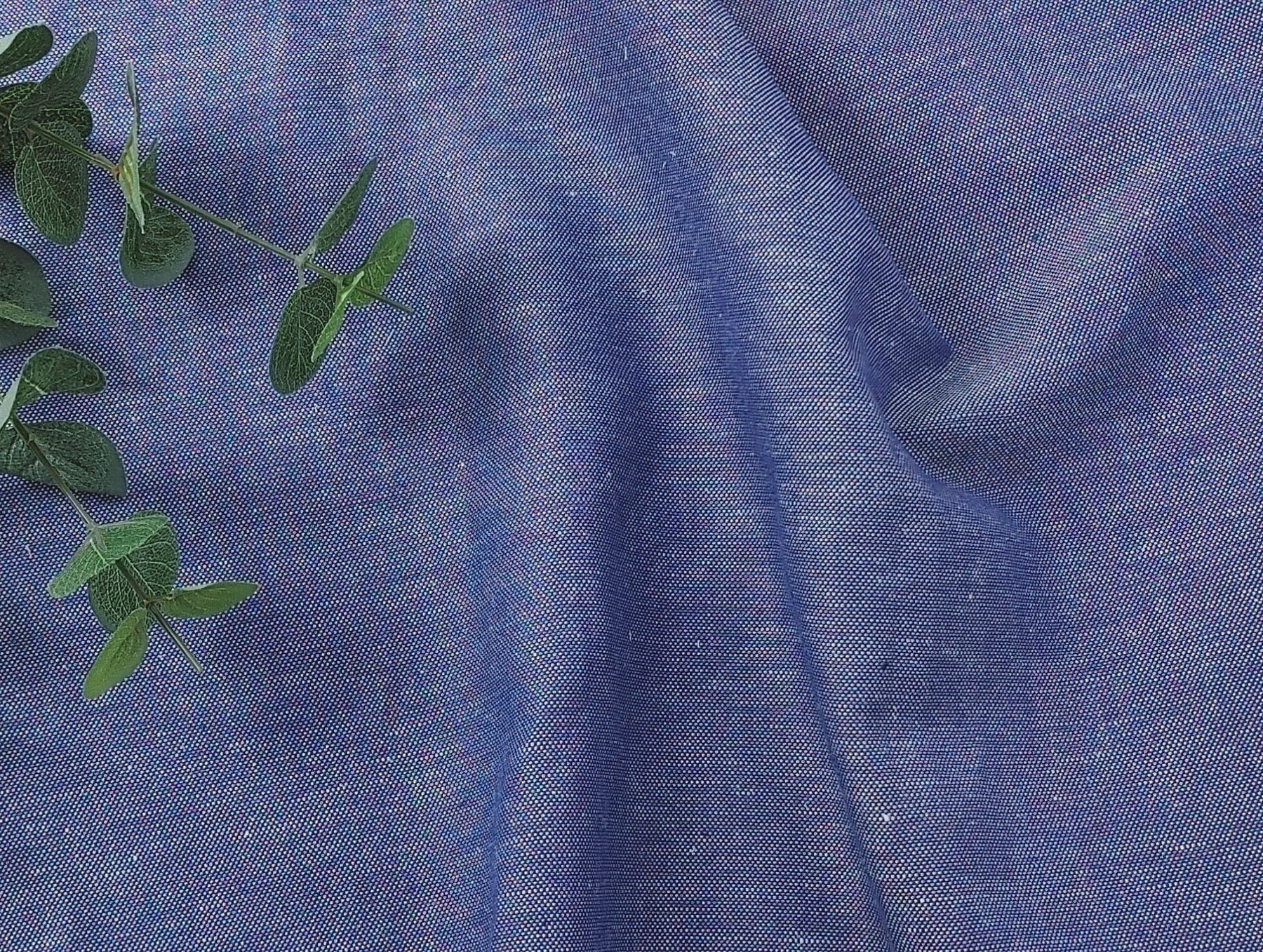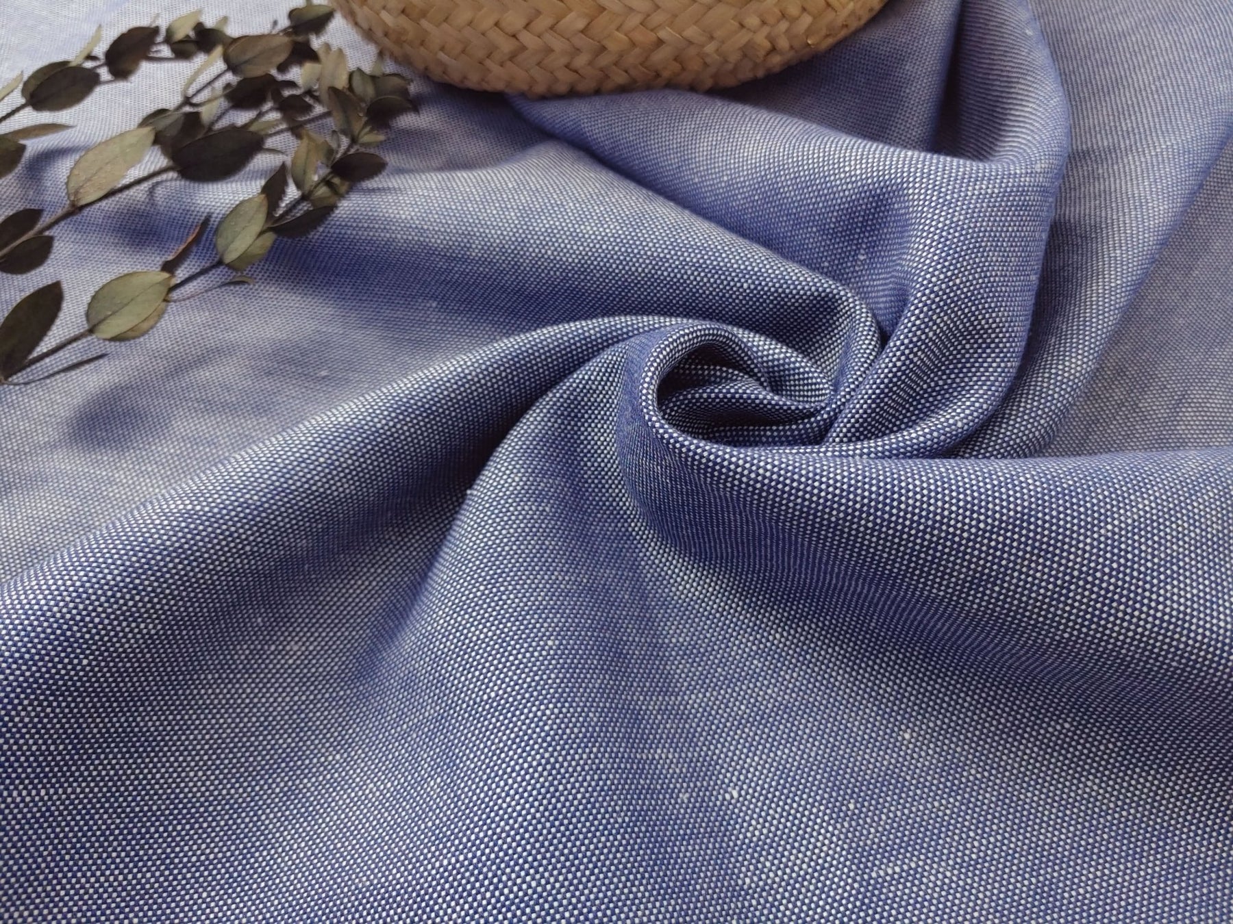 Introducing a linen cotton navy chambray canvas fabric with a canvas weave, specifically a 4:2 MAT weave. The warp is crafted from compact cotton yarn CM60/2, while the weft elegantly features linen yarn.