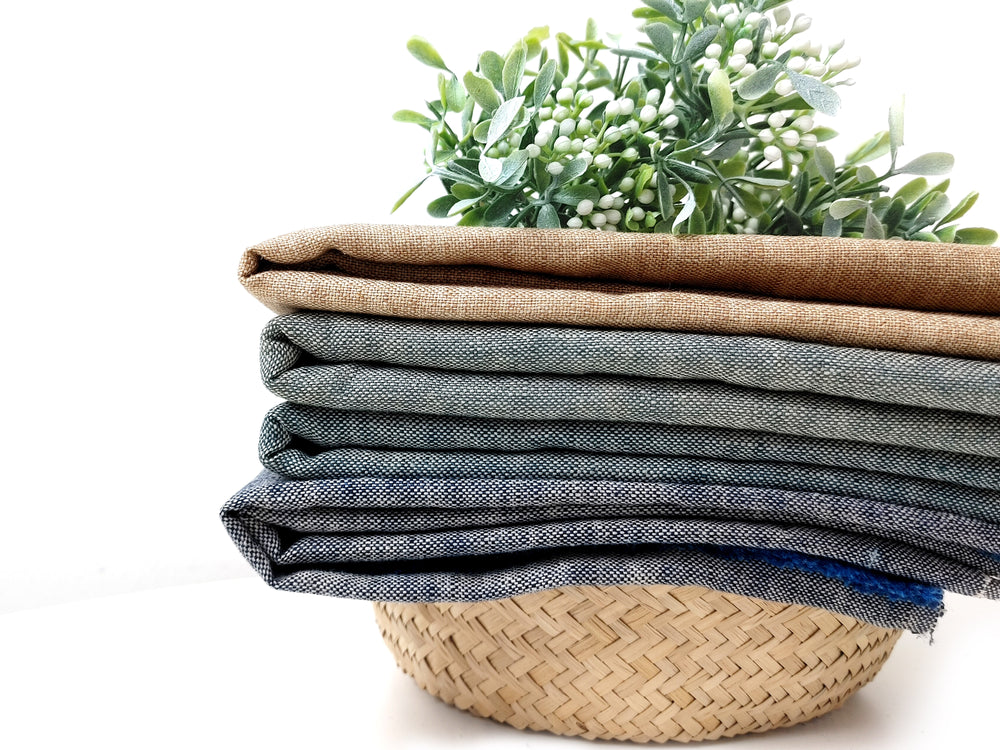 This linen-cotton blend chambray fabric features a unique mat weave with contrasting yarns for a textured, dimensional look. The warp combines linen and cotton for a soft, breathable feel, while the weft uses a thick 5.6s linen yarn for added structure. With 82% linen and 18% cotton, this medium to slightly heavy fabric (267 g/sqm) offers natural stretch for extra comfort. Pre-washed for softness, it has a gentle, lived-in handfeel that’s perfect for versatile garments and home projects. Its 51-inch width provides ample fabric for creative designs.
