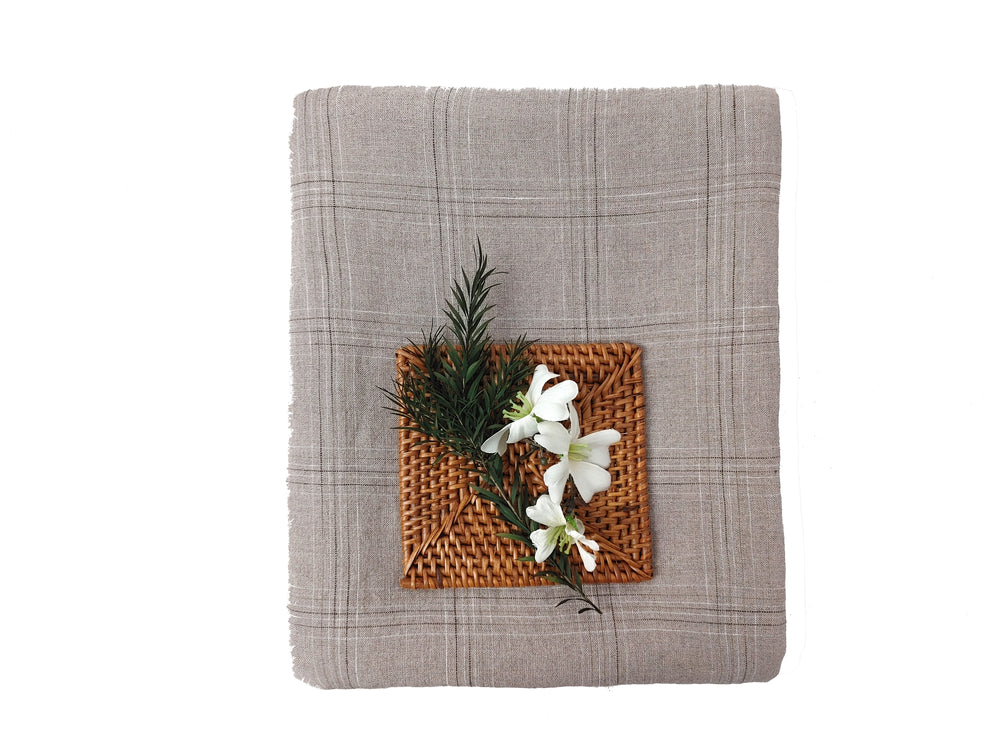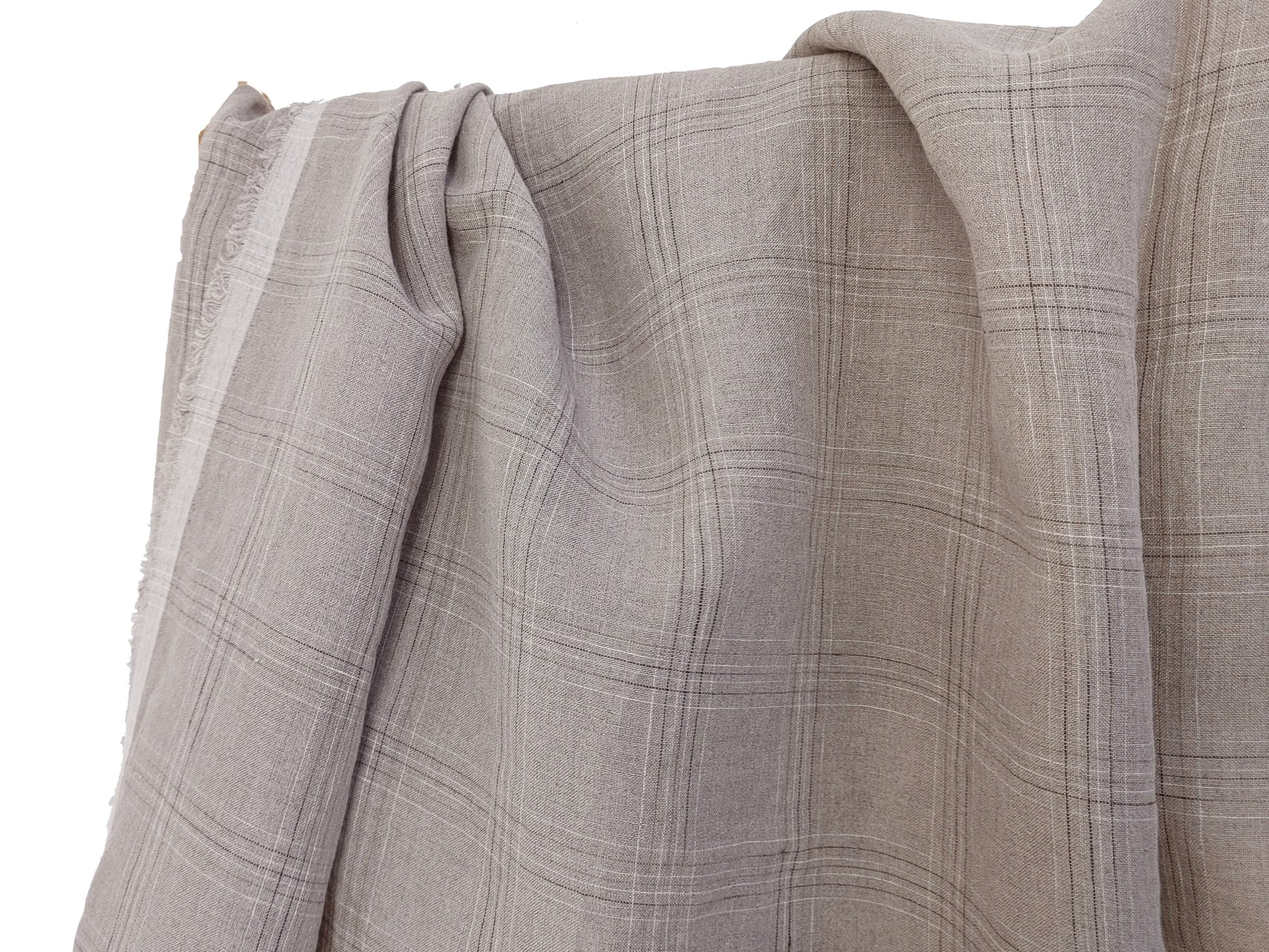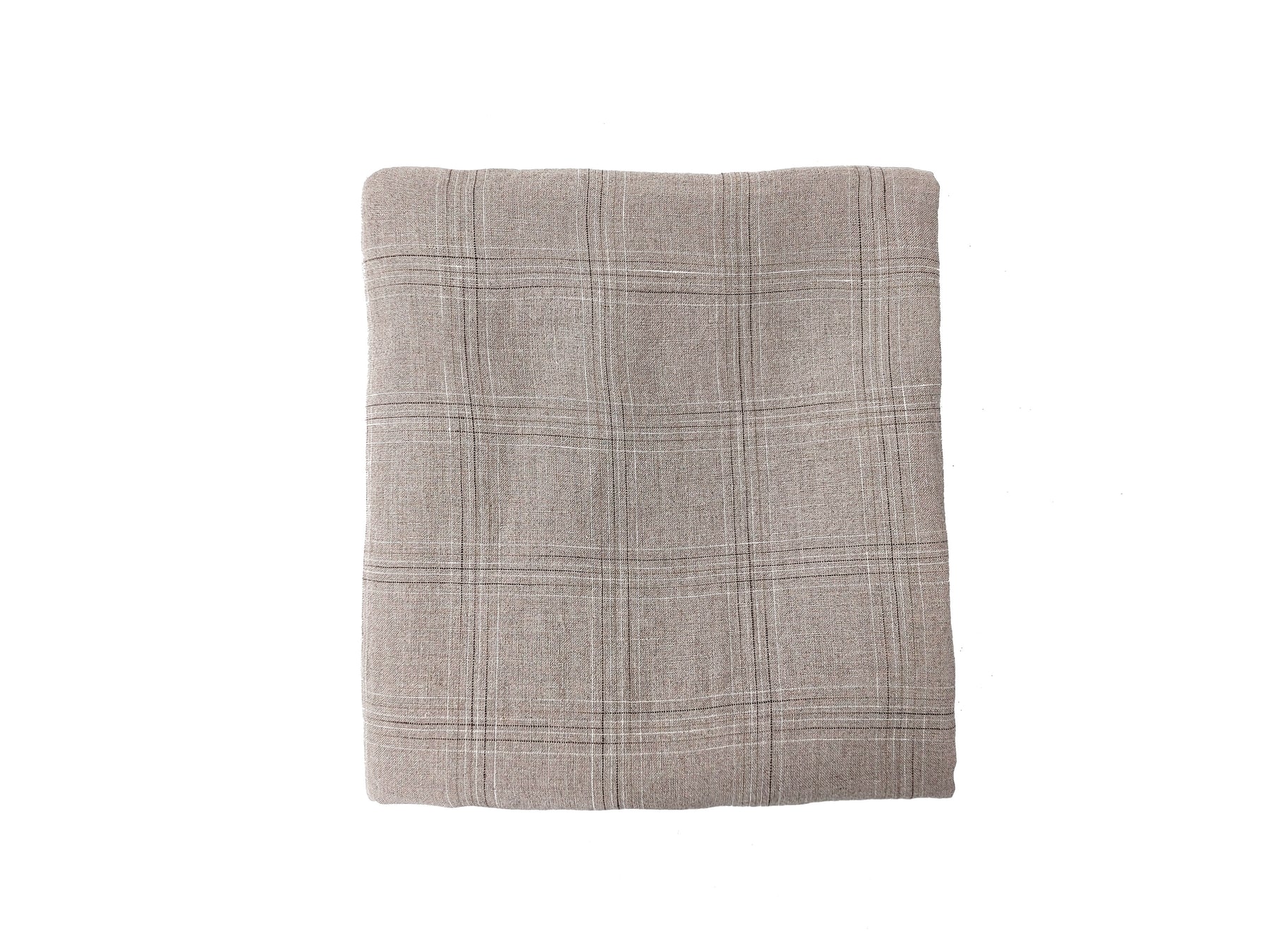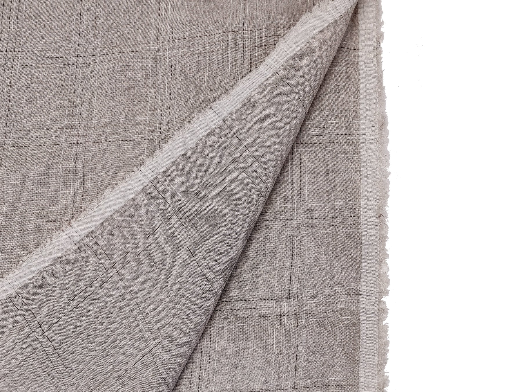 Discover the elegance of our 100% linen fabric, featuring a refined windowpane check pattern in natural tones. The base color is a timeless natural hue, complemented by delicate brown and white checks created through an intricate space-dyeing method. This technique allows the colors to subtly appear and fade across the yarns, giving the fabric a unique, sophisticated touch.
