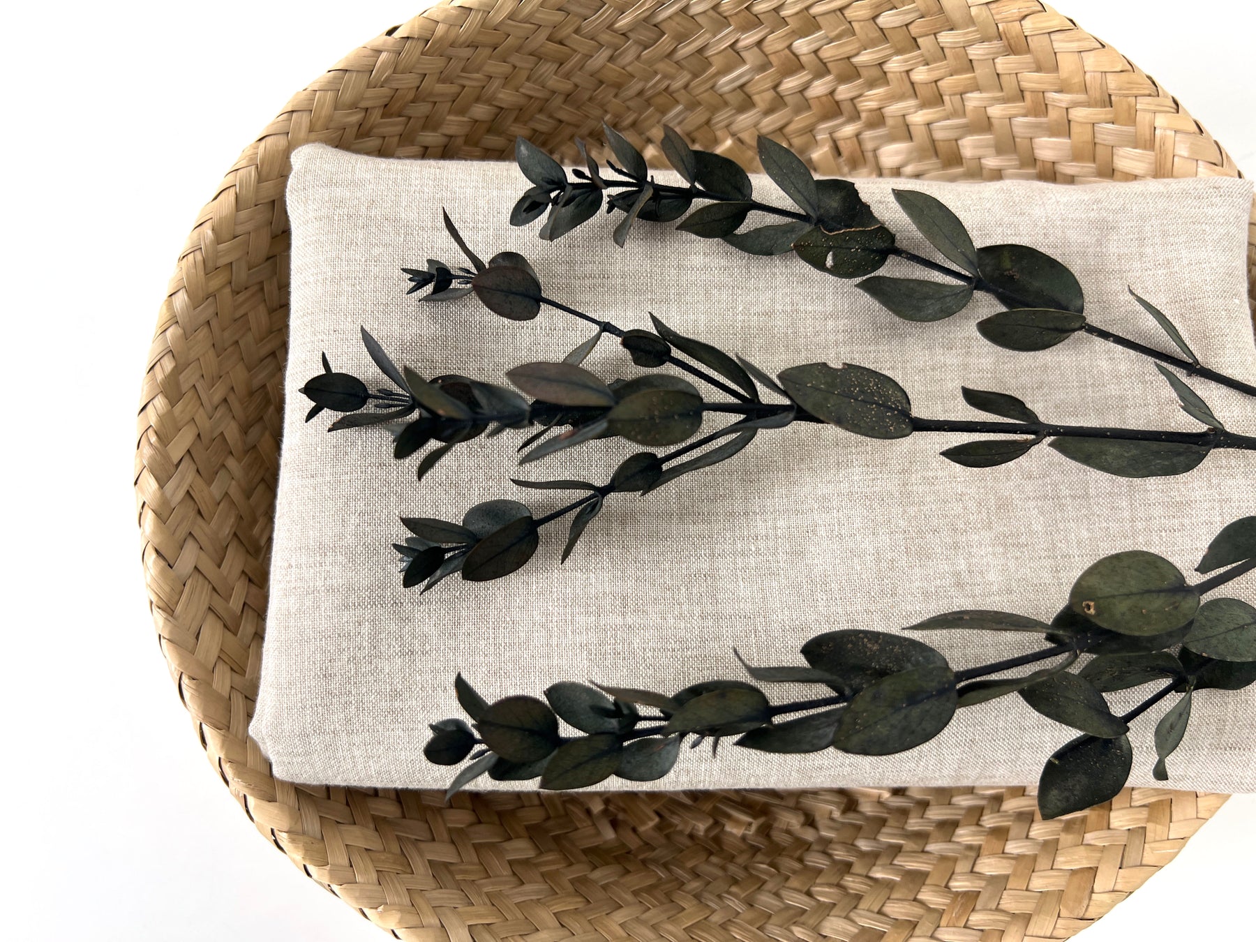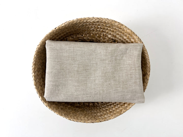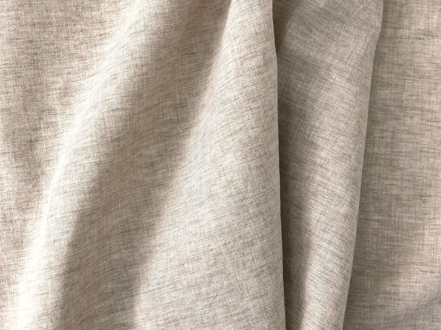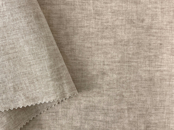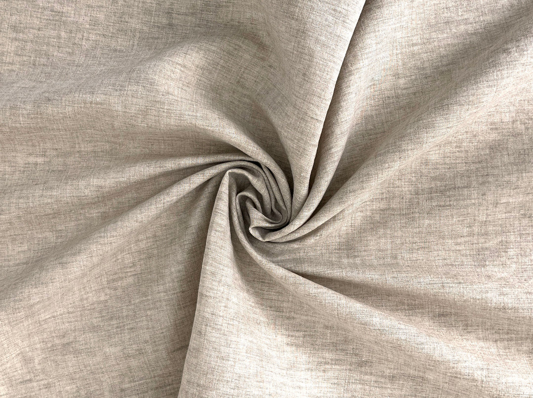This linen cotton blend fabric has a soft beige melange tone with a gentle chambray two-tone effect. The warp is made from 20s cotton melange yarn, while the weft uses 21s vintage yarn-dyed linen, creating a fabric with natural depth and character.