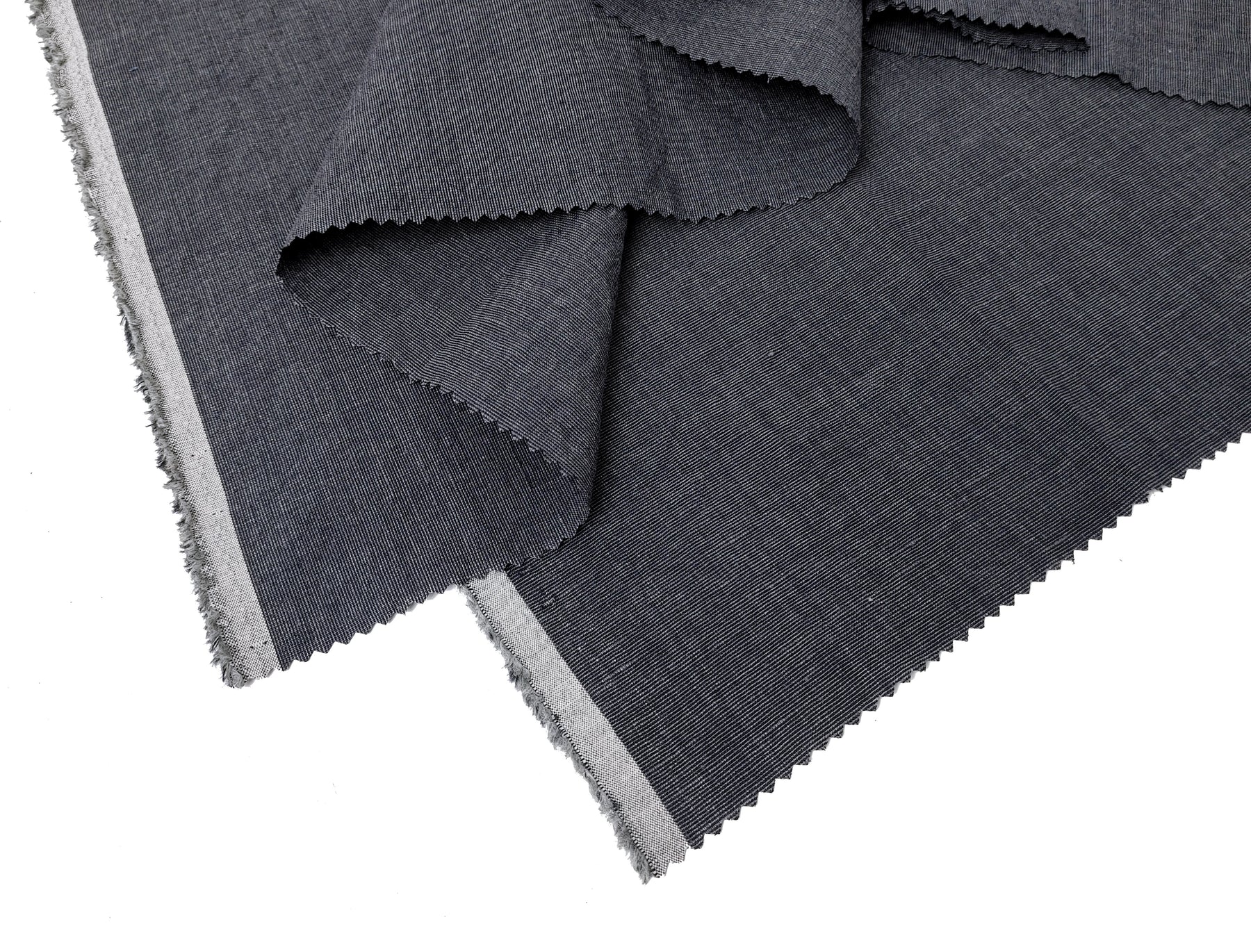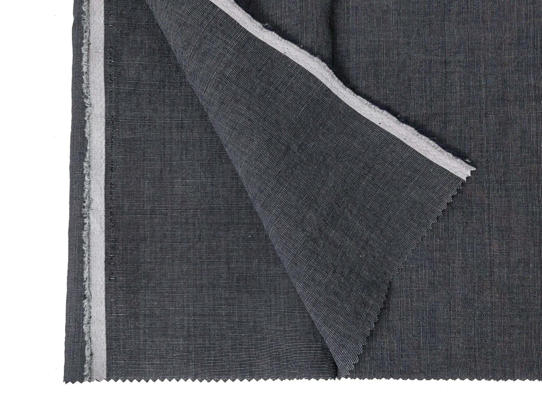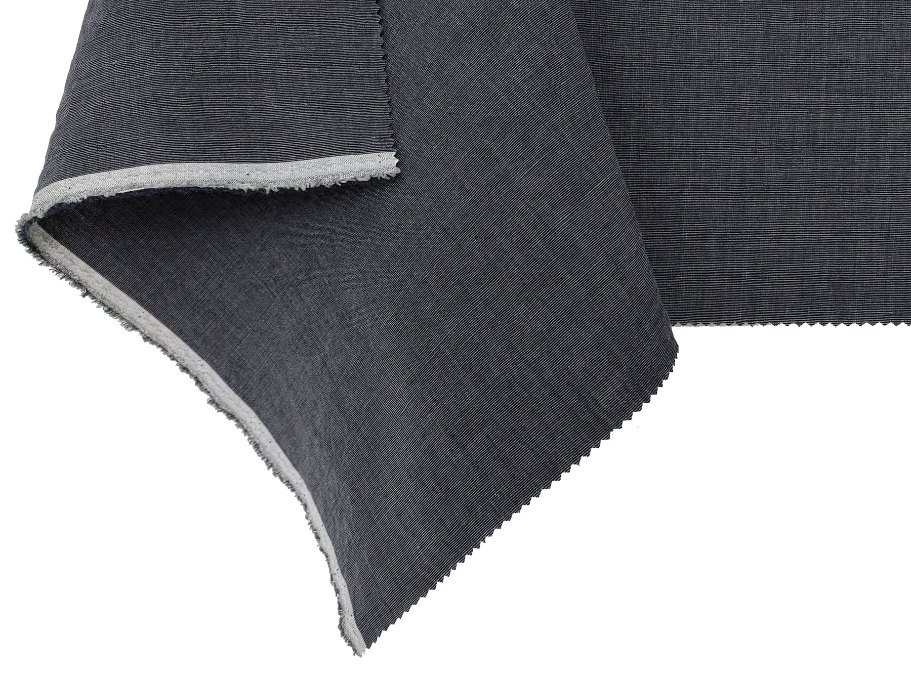 This fabric combines the natural qualities of linen and cotton, featuring a subtle chambray weave that creates a soft, textured appearance. The dark grey color is achieved by blending grey linen yarn with black cotton yarn, resulting in a sophisticated and versatile tone.