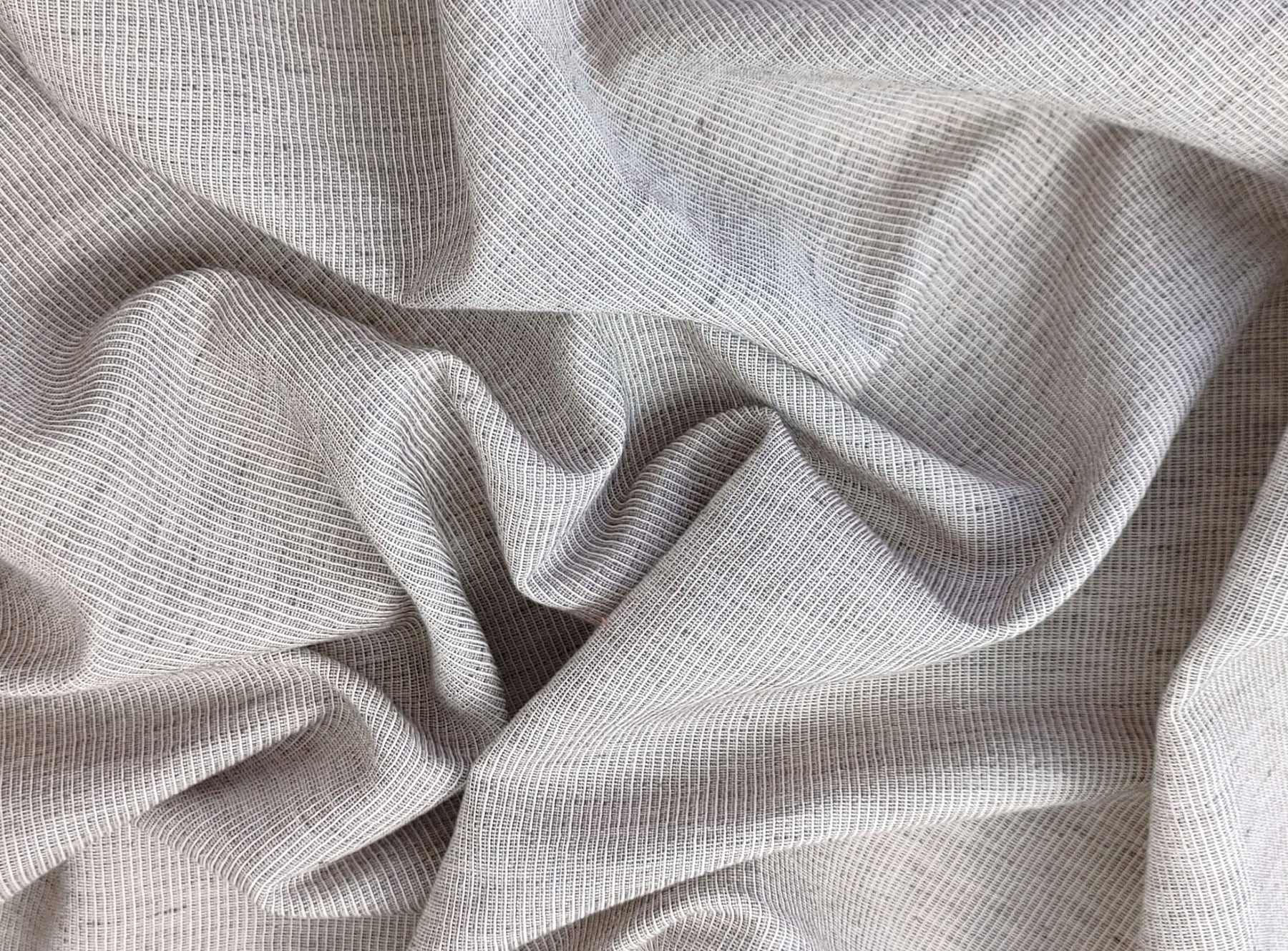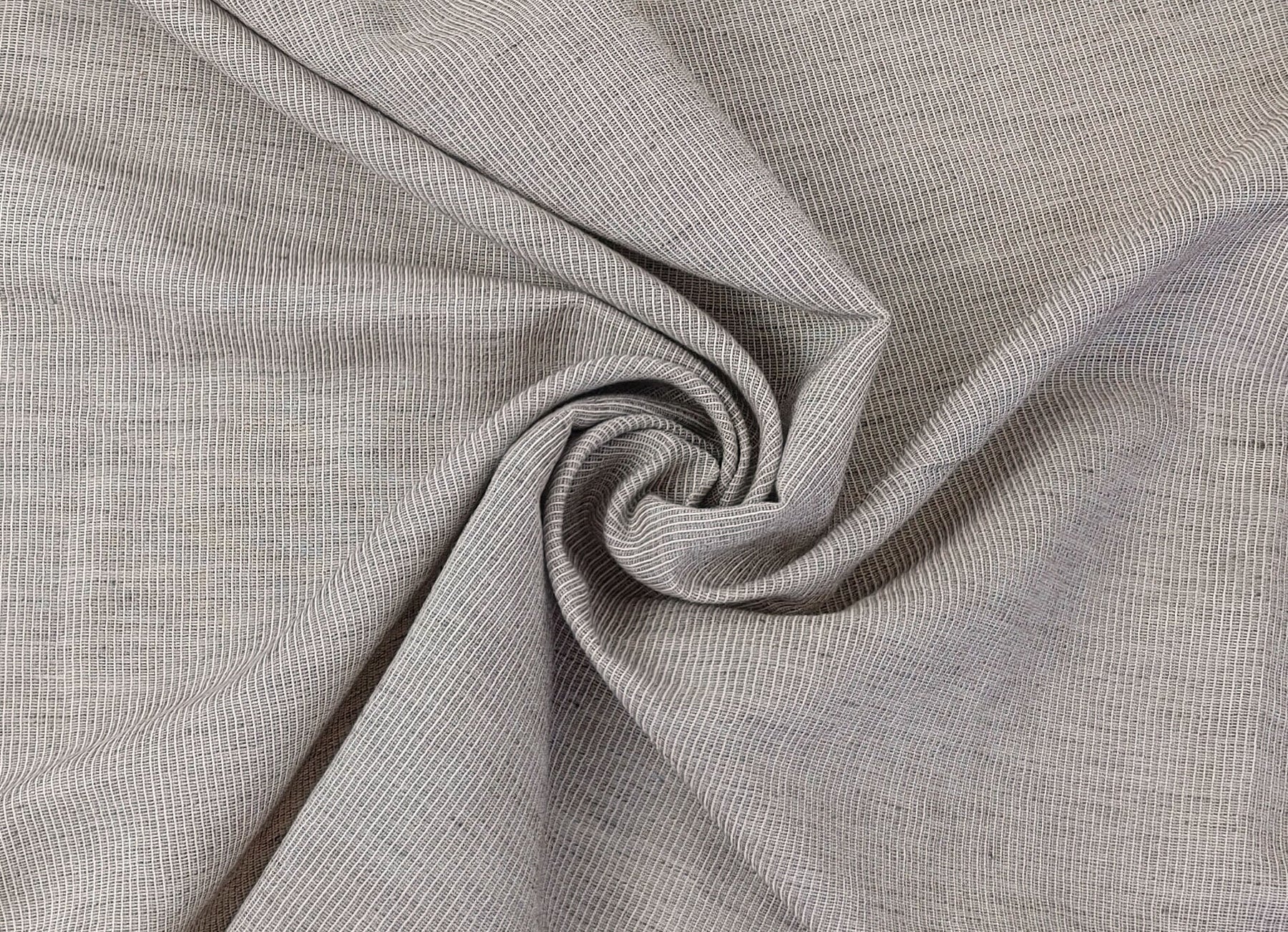 Crafted with care, this light-weight linen cotton stripe fabric embodies simplicity and elegance. The warp and weft feature compact cotton yarn 50s with additional twisting, while the warp includes cotton 30/2 and the weft comprises high twisted linen yarn. A special high-twisting technique adds a subtle wrinkle effect, enhancing the fabric's appeal.