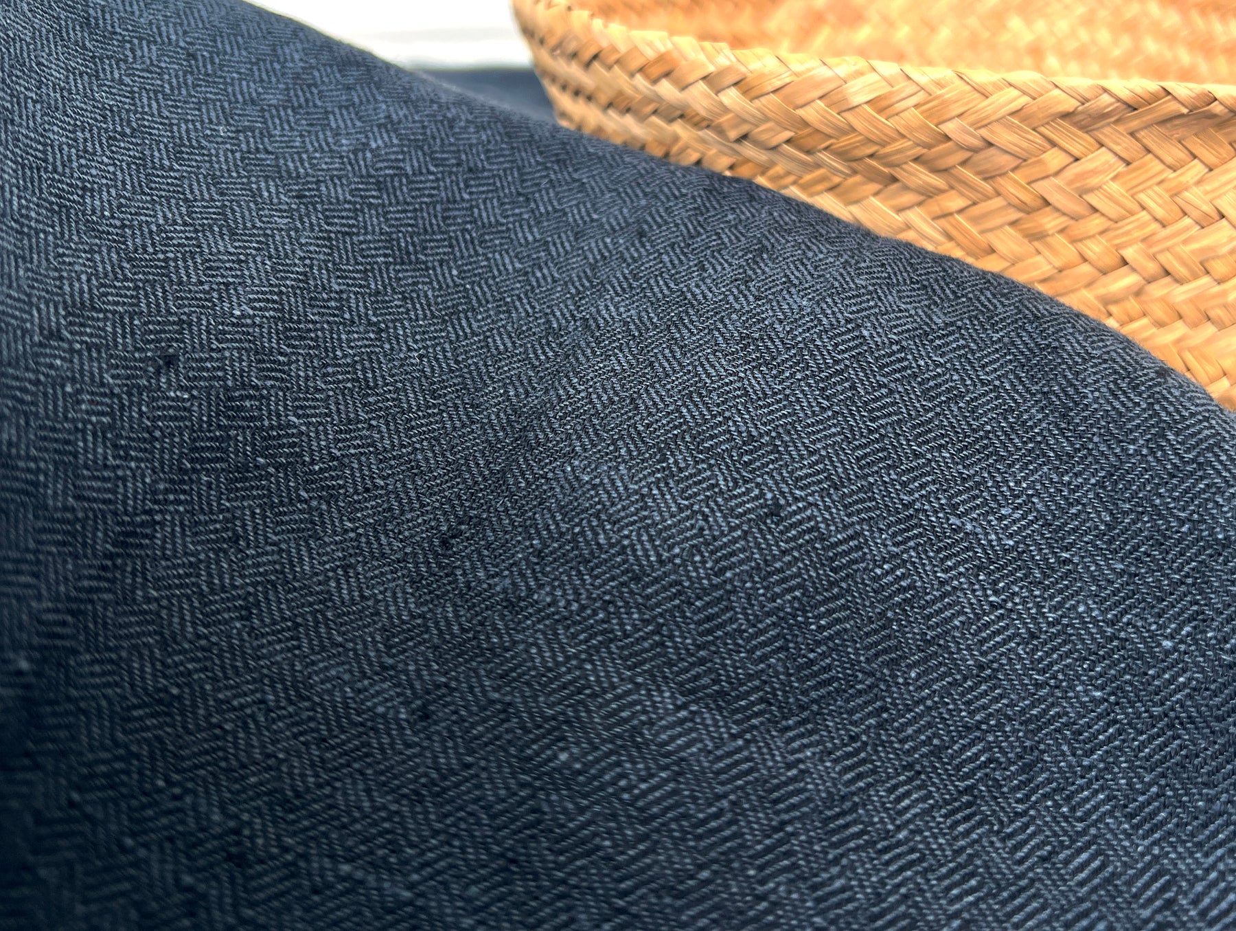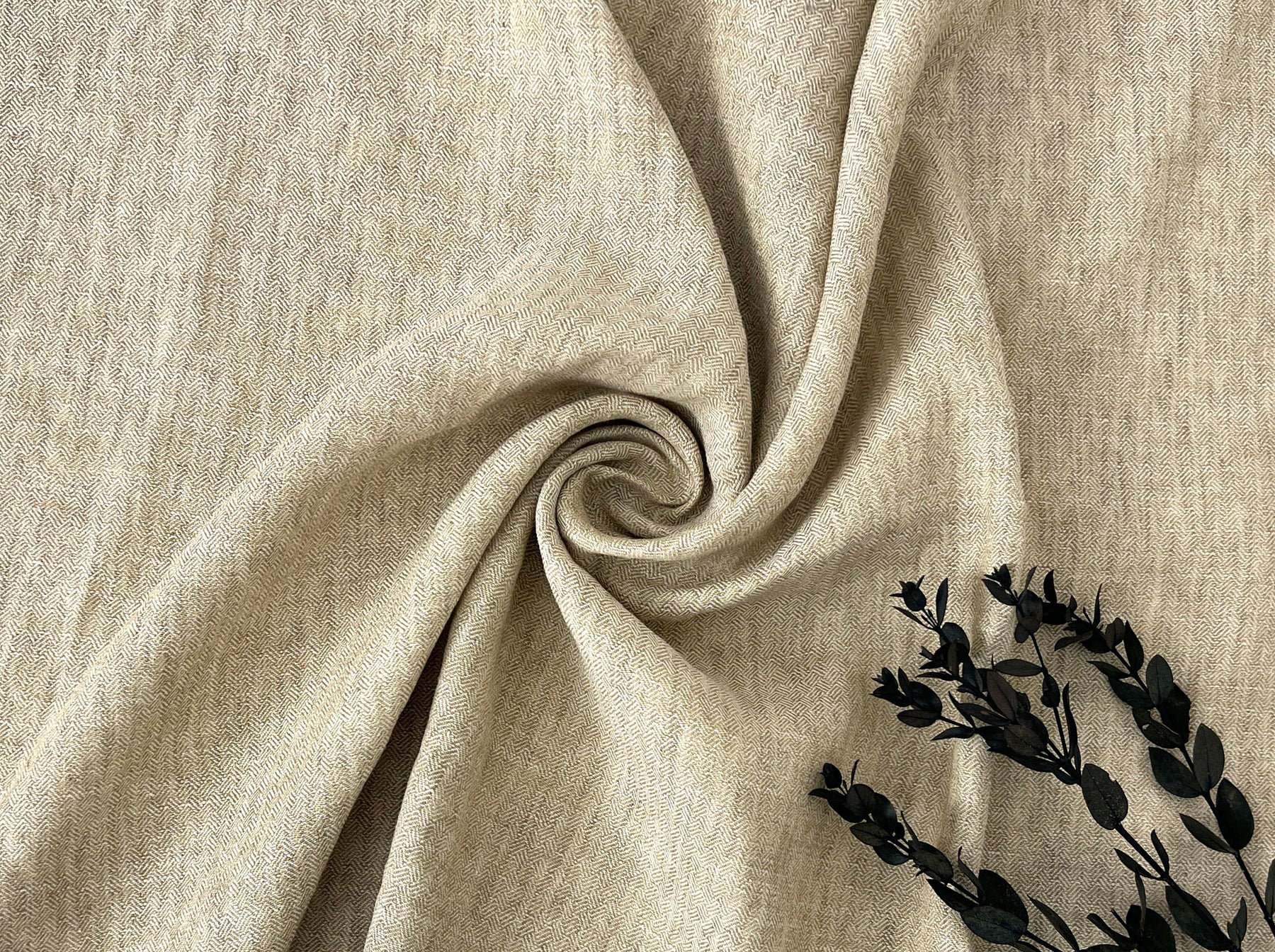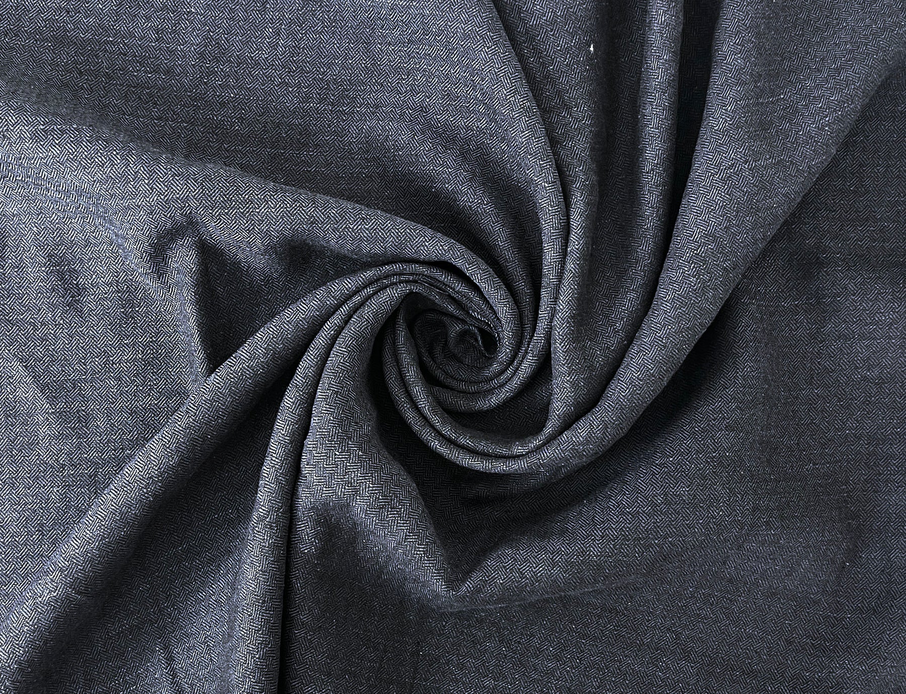 This linen–ramie–cotton blend fabric features a unique broken herringbone weave, a variation of the classic herringbone pattern. The warp and weft are woven in different colors, creating a subtle chambray two-tone effect with added depth and texture.
