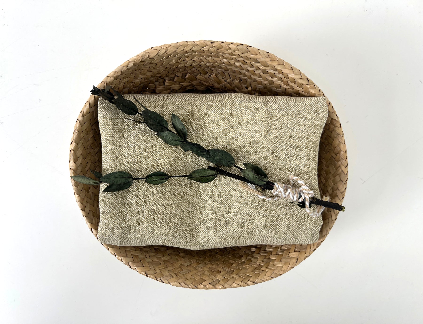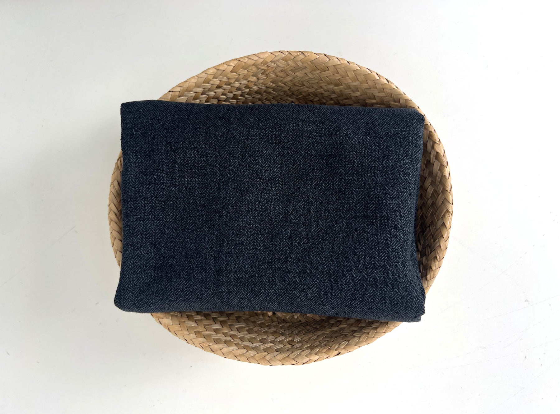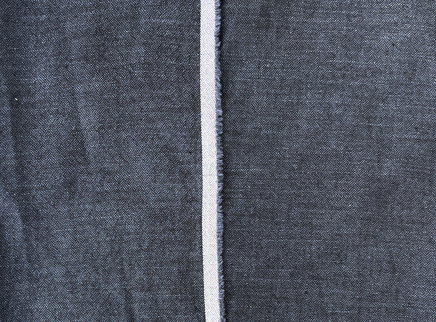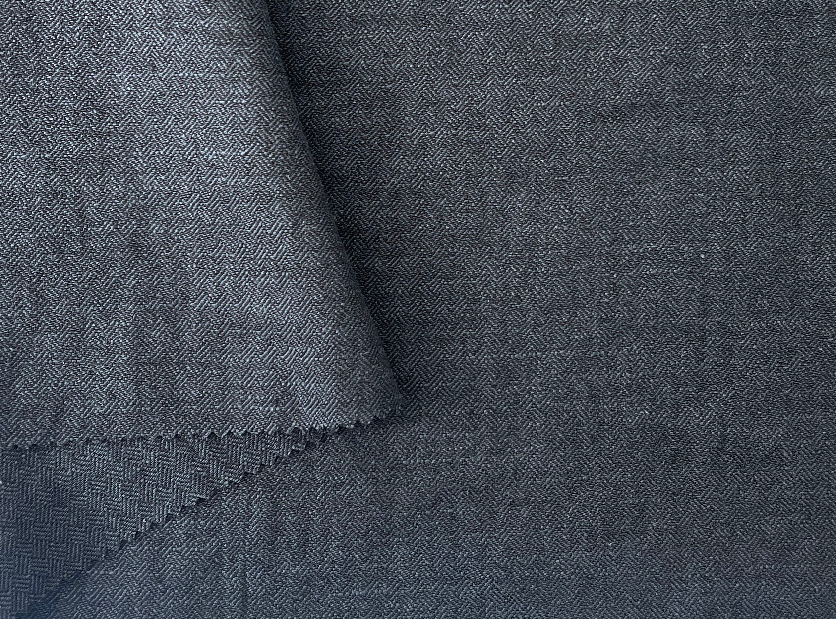 This linen–ramie–cotton blend fabric features a unique broken herringbone weave, a variation of the classic herringbone pattern. The warp and weft are woven in different colors, creating a subtle chambray two-tone effect with added depth and texture.