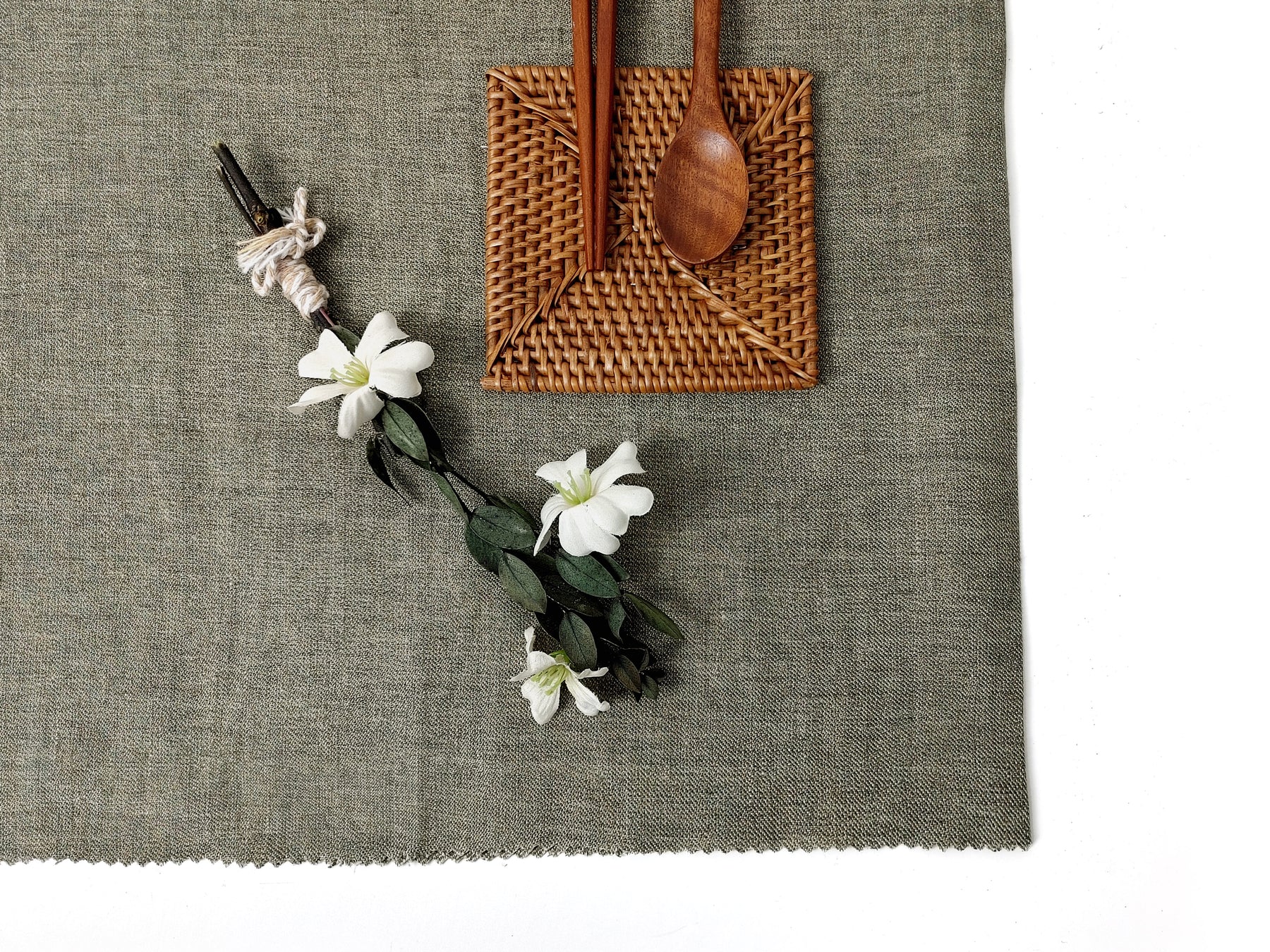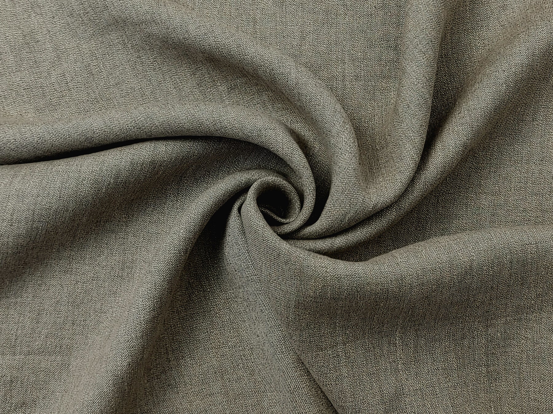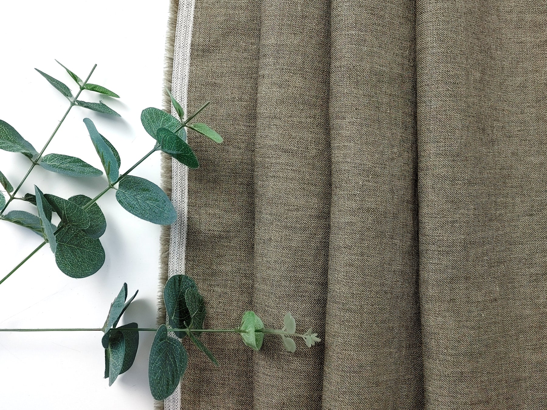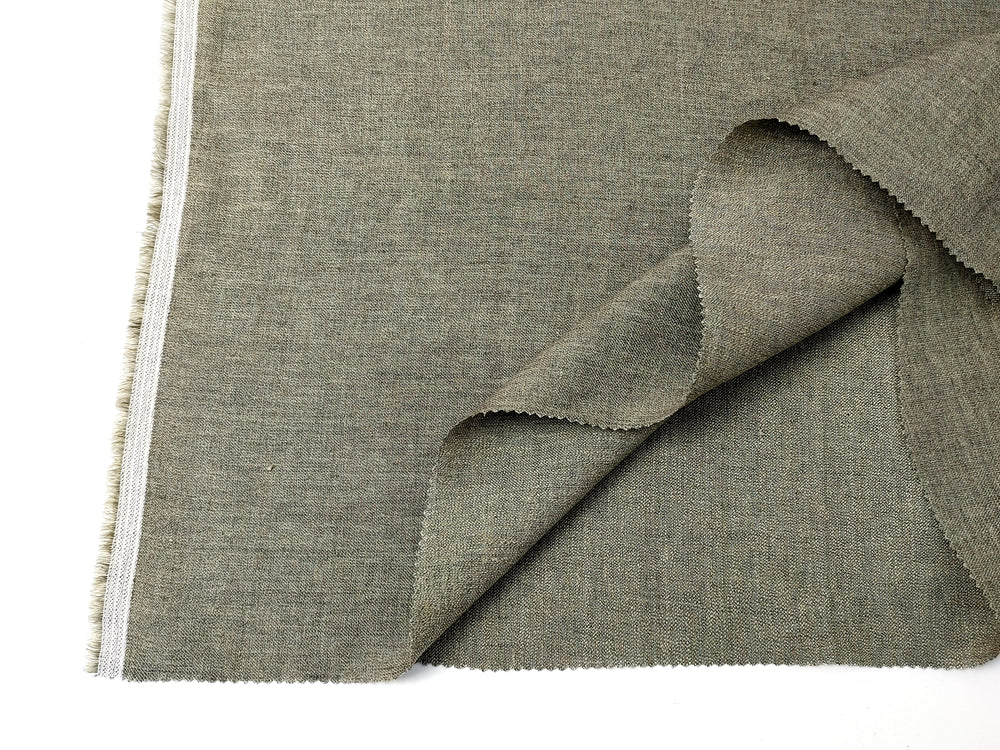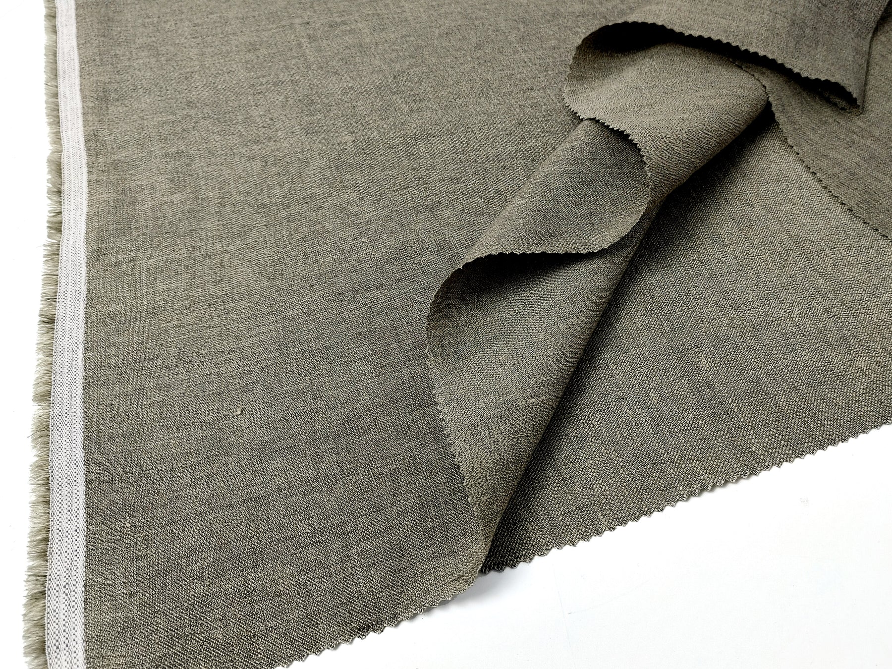 This khaki chambray fabric features a durable twill weave made from a premium blend of 95% linen and 5% nylon, delivering the natural texture of linen with enhanced strength. The fabric’s dual-tone yarn construction creates visual depth: khaki-colored linen weft yarns contrast with a beige linen warp yarn that’s intricately twisted with a thin black nylon thread. This innovative combination not only increases durability but also gives the fabric a smoother, more refined handfeel.