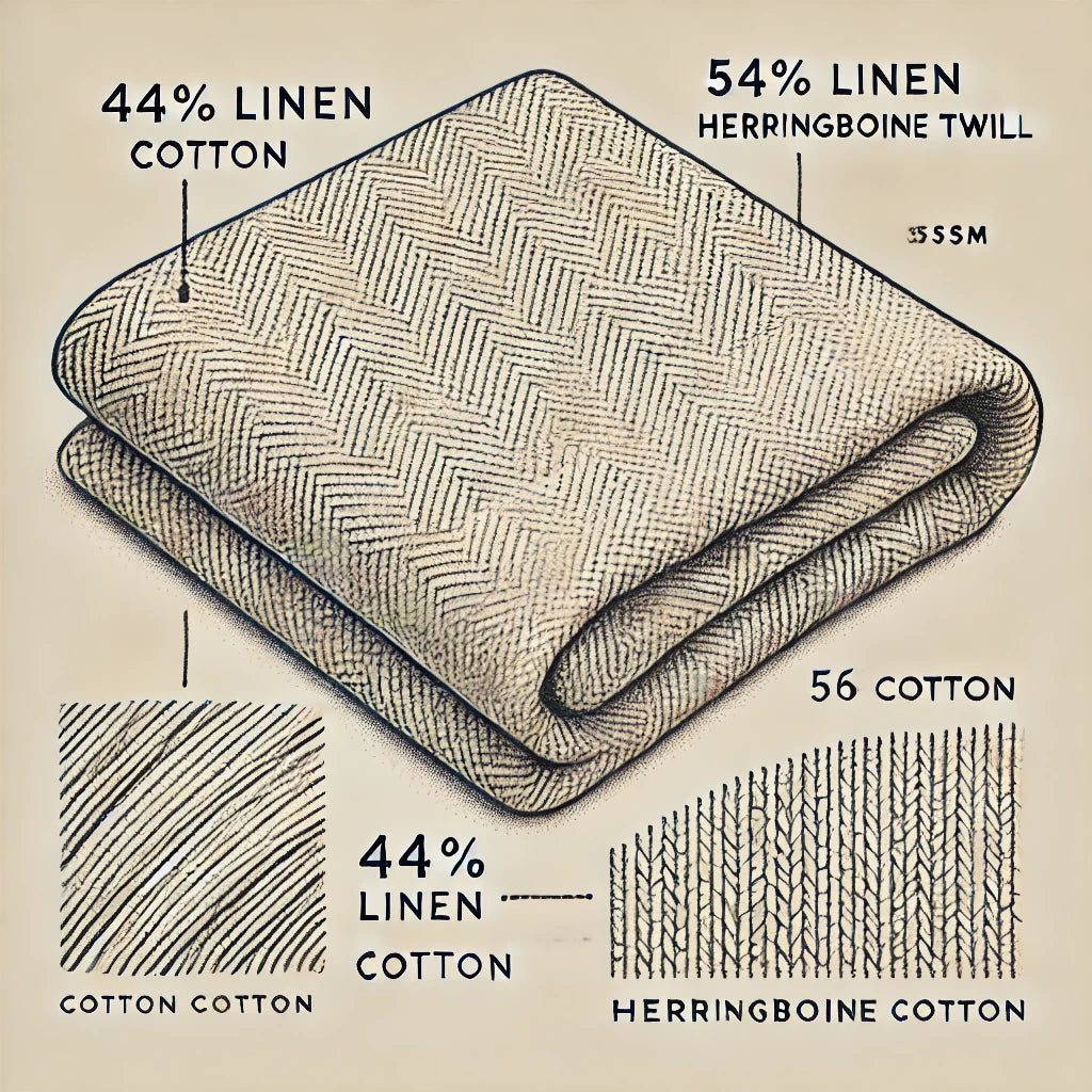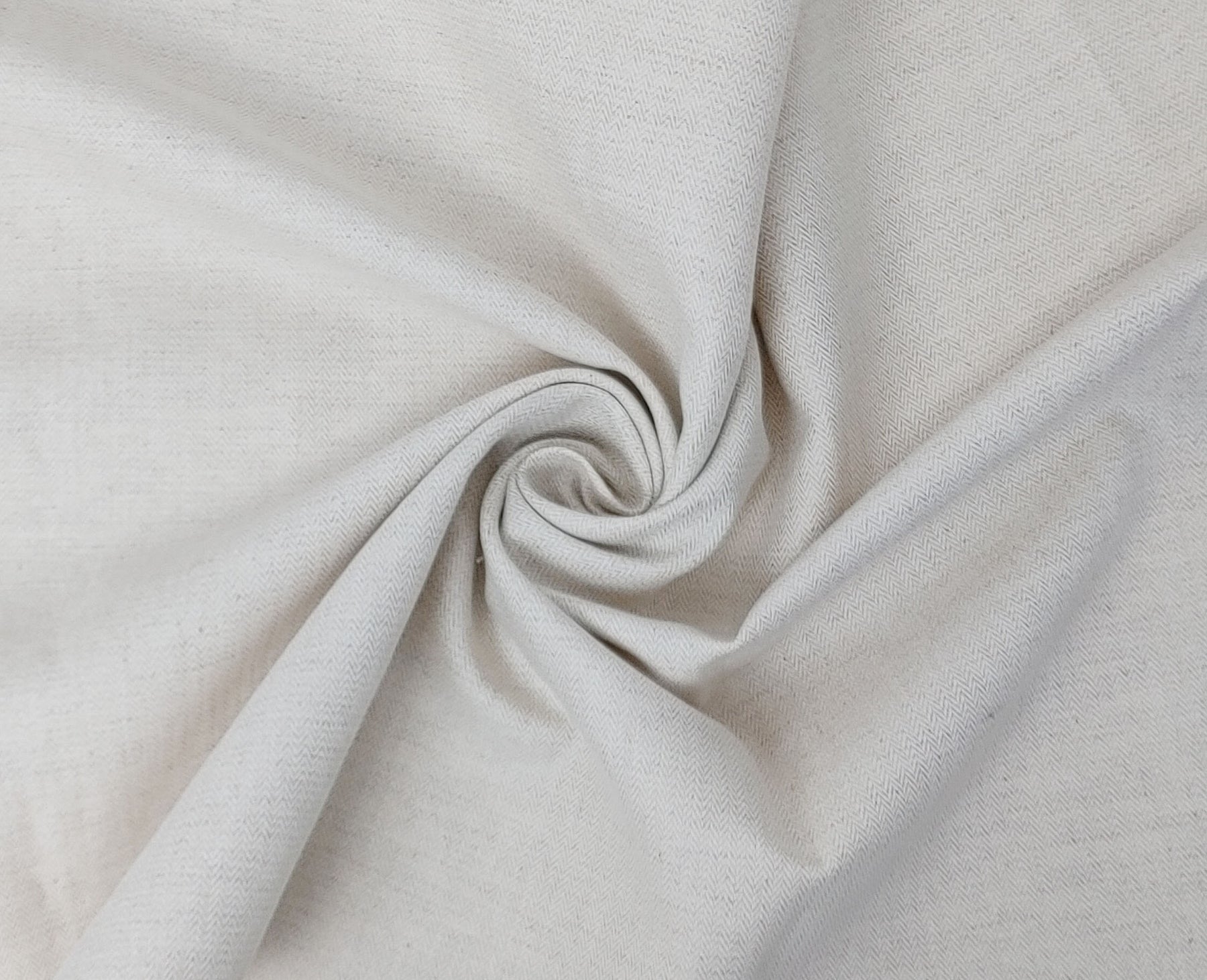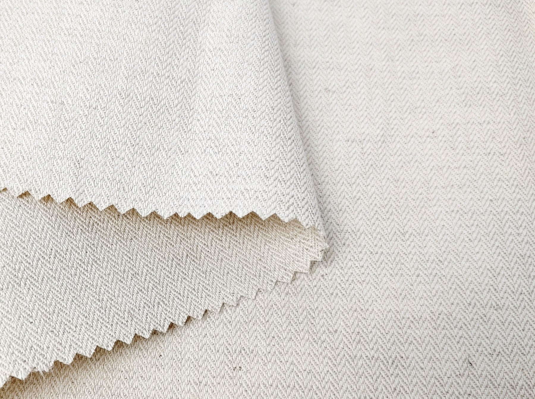 The warp is made from a mix of cotton 10s and cotton 20s, while the weft features natural color linen yarn 14s, resulting in a fabric with excellent texture and visual depth. The herringbone twill weave adds a sophisticated, subtle pattern, making this fabric stand out for both casual and formal designs.
