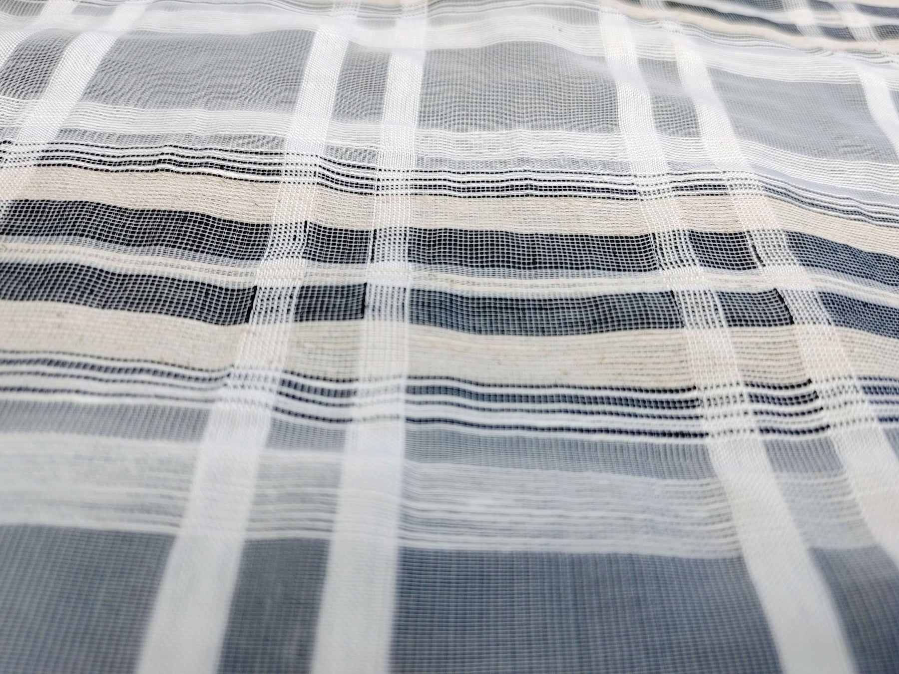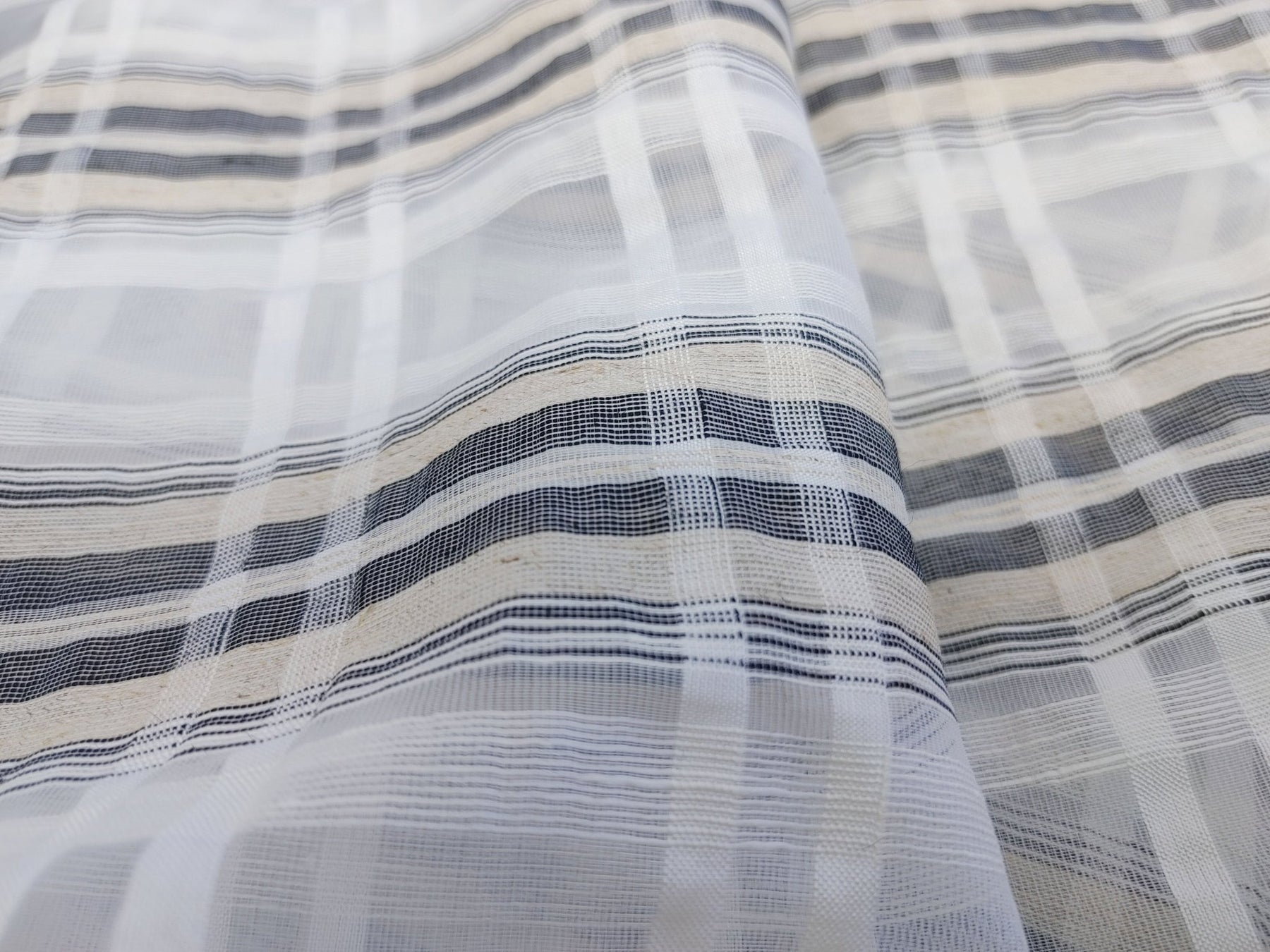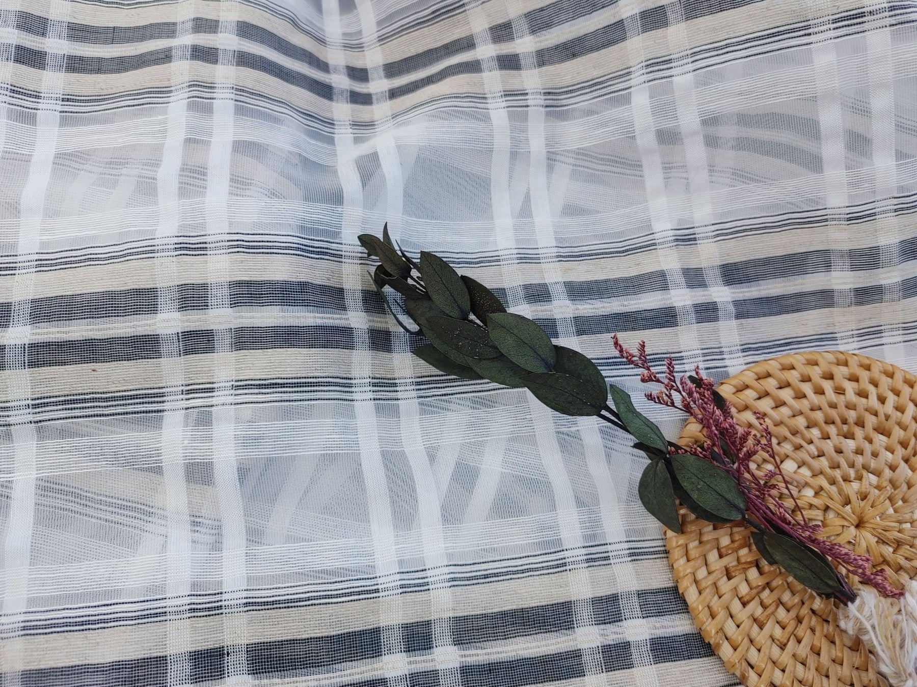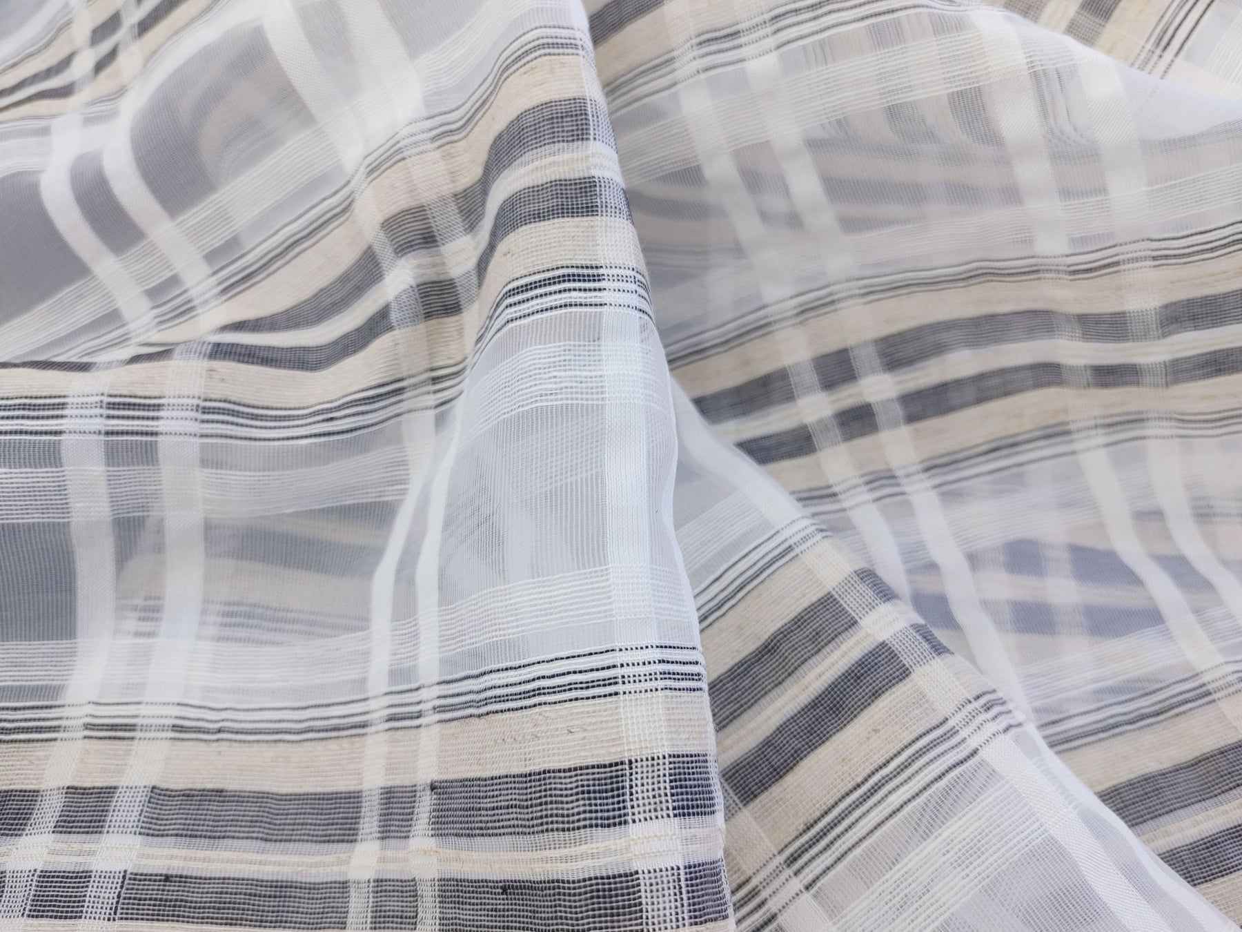 Immerse yourself in the understated allure of our grey melange plaid fabric, a masterpiece of textile artistry. Crafted with precision, this fabric seamlessly combines the delicate transparency of thin polyester filament yarn with the sophistication of black-colored melange linen yarn and the natural elegance of neutral-colored yarn. The result is a visual symphony that brings modernity to the timeless charm of a classic plaid pattern.