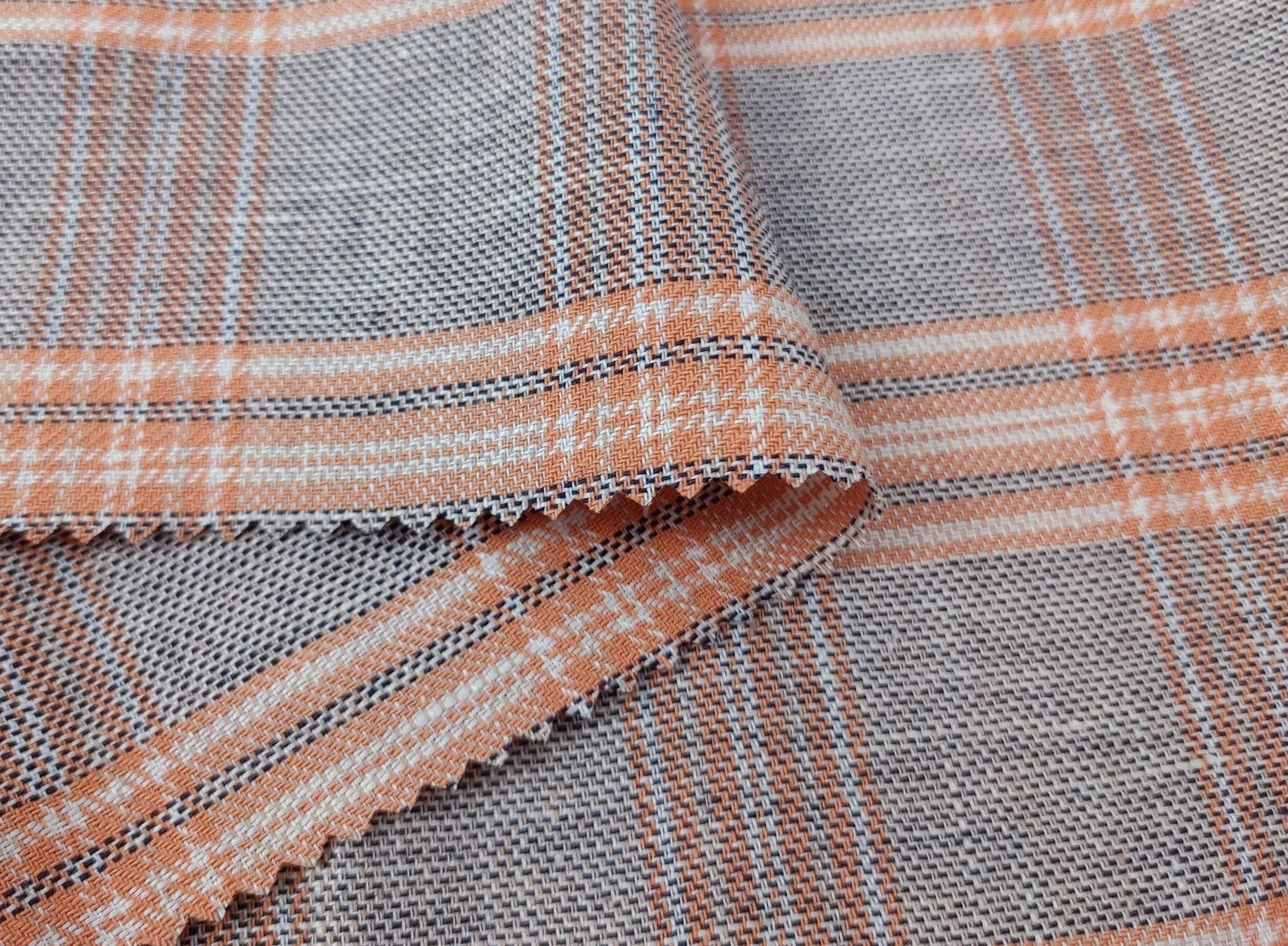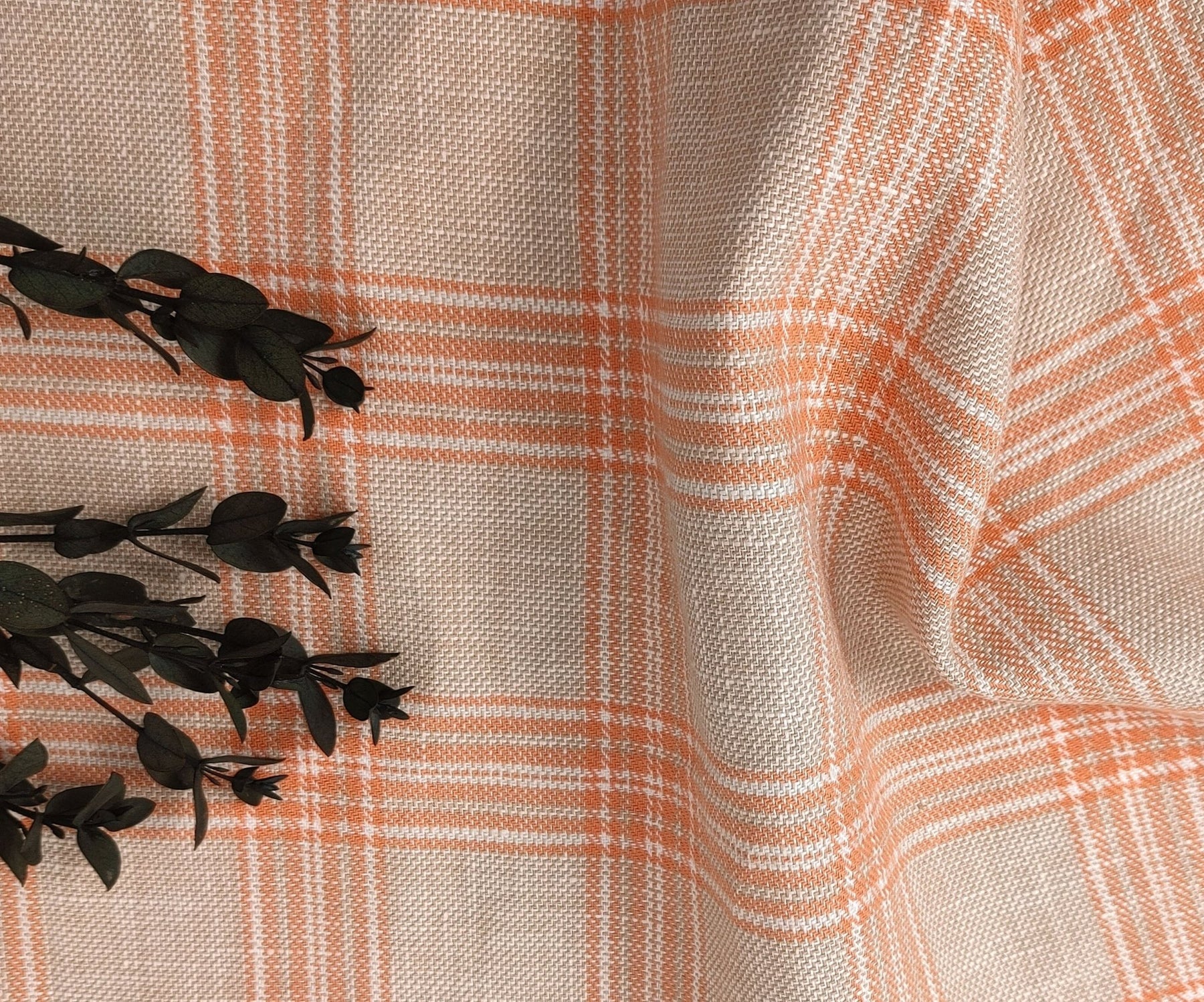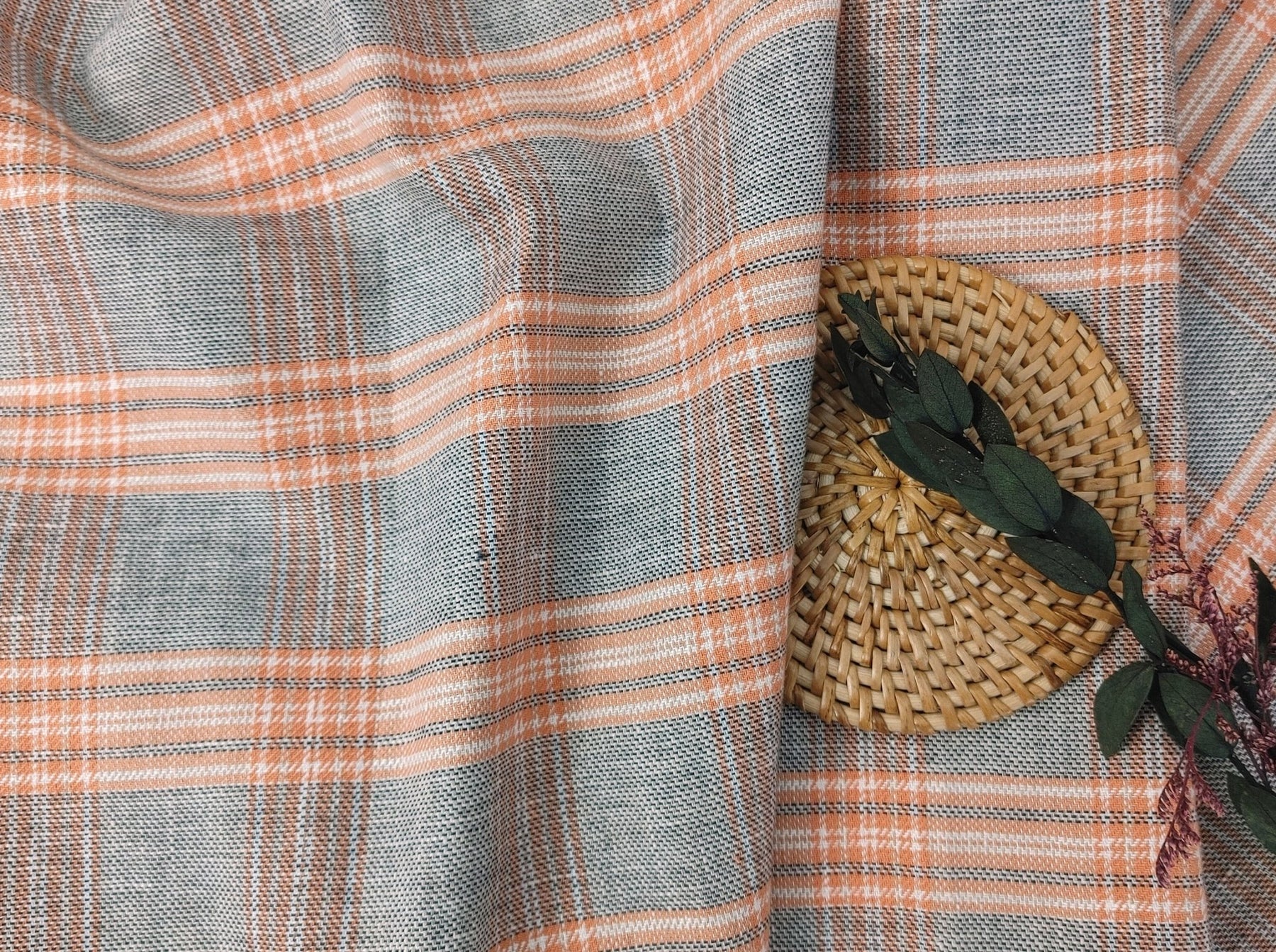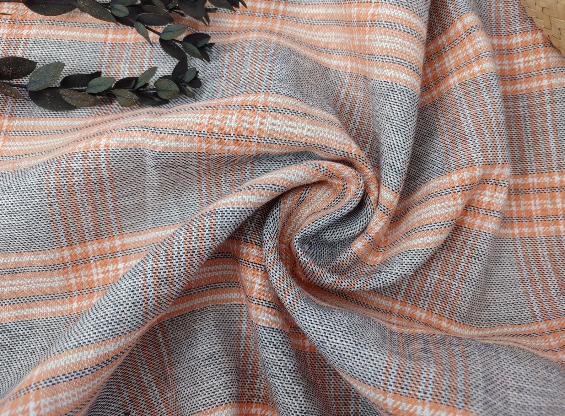 Introducing Linen Cotton Twill Plaid Fabric, available in orange and navy colors. This medium-weight fabric, composed of 45% linen and 55% cotton, strikes a balanced combination of natural elegance and softness.