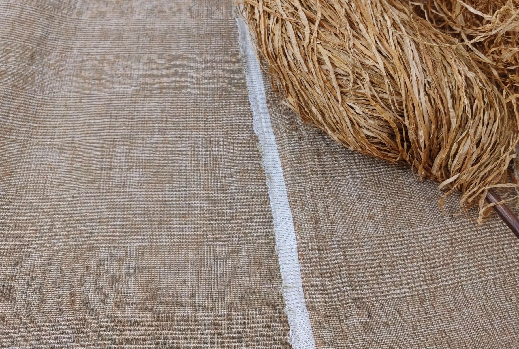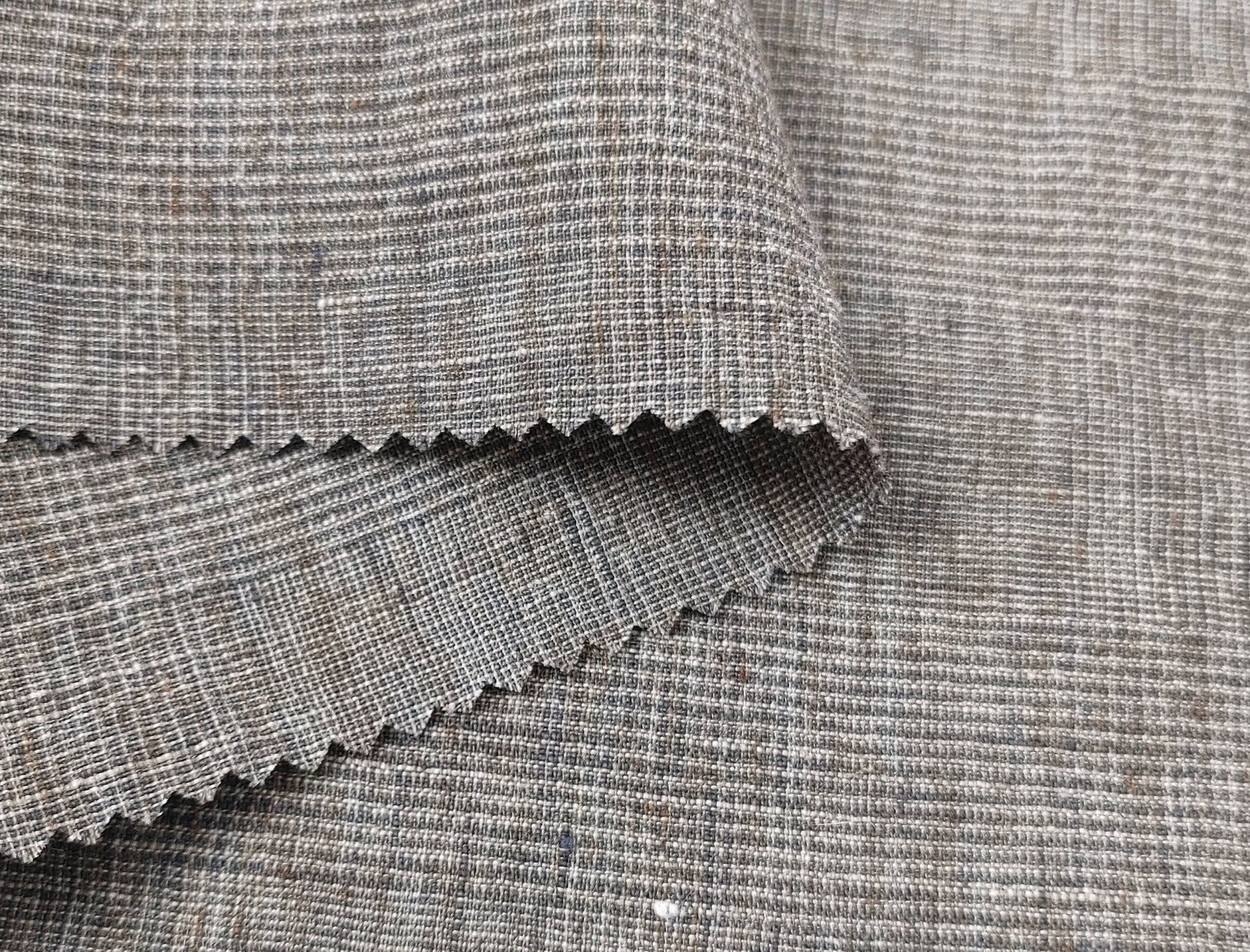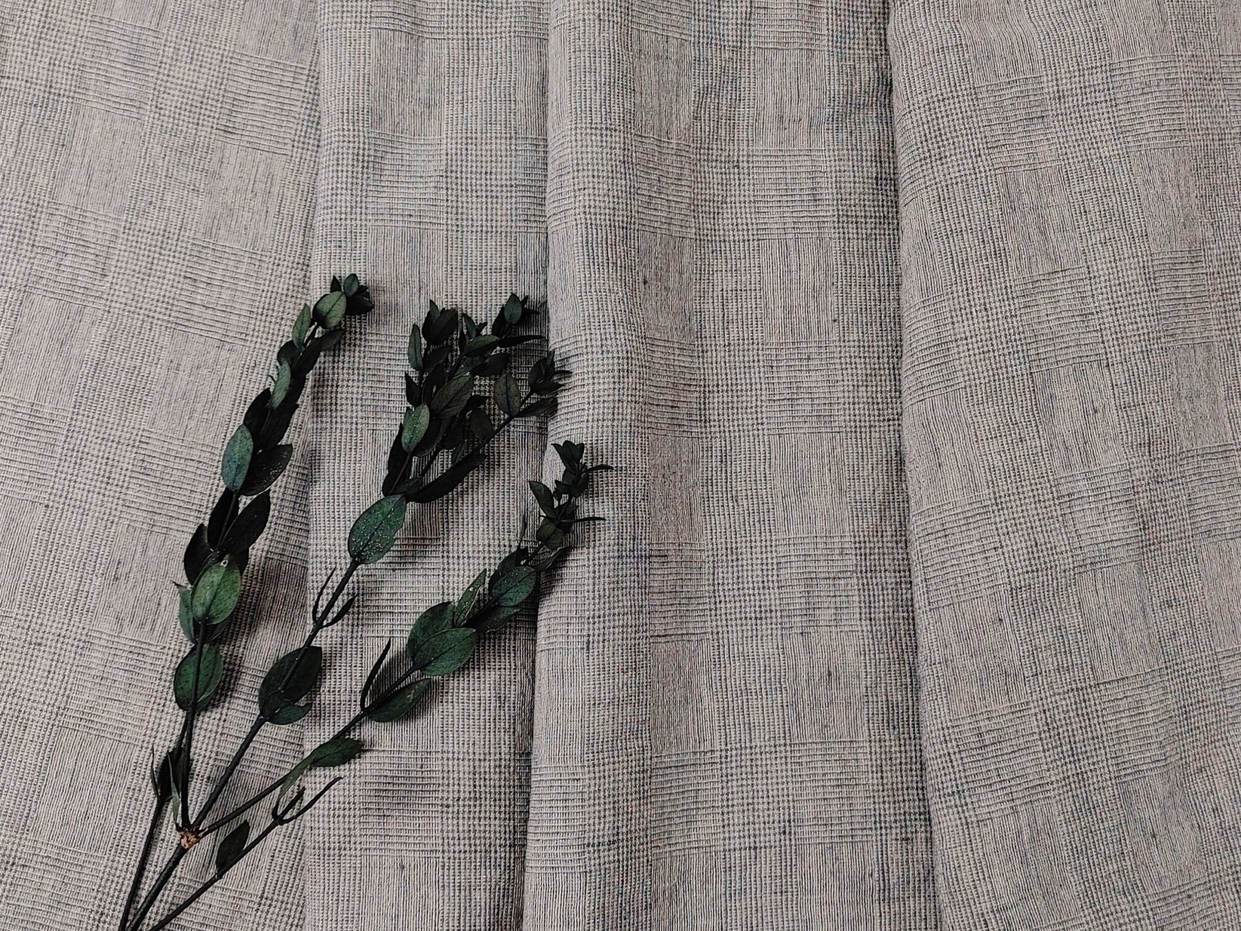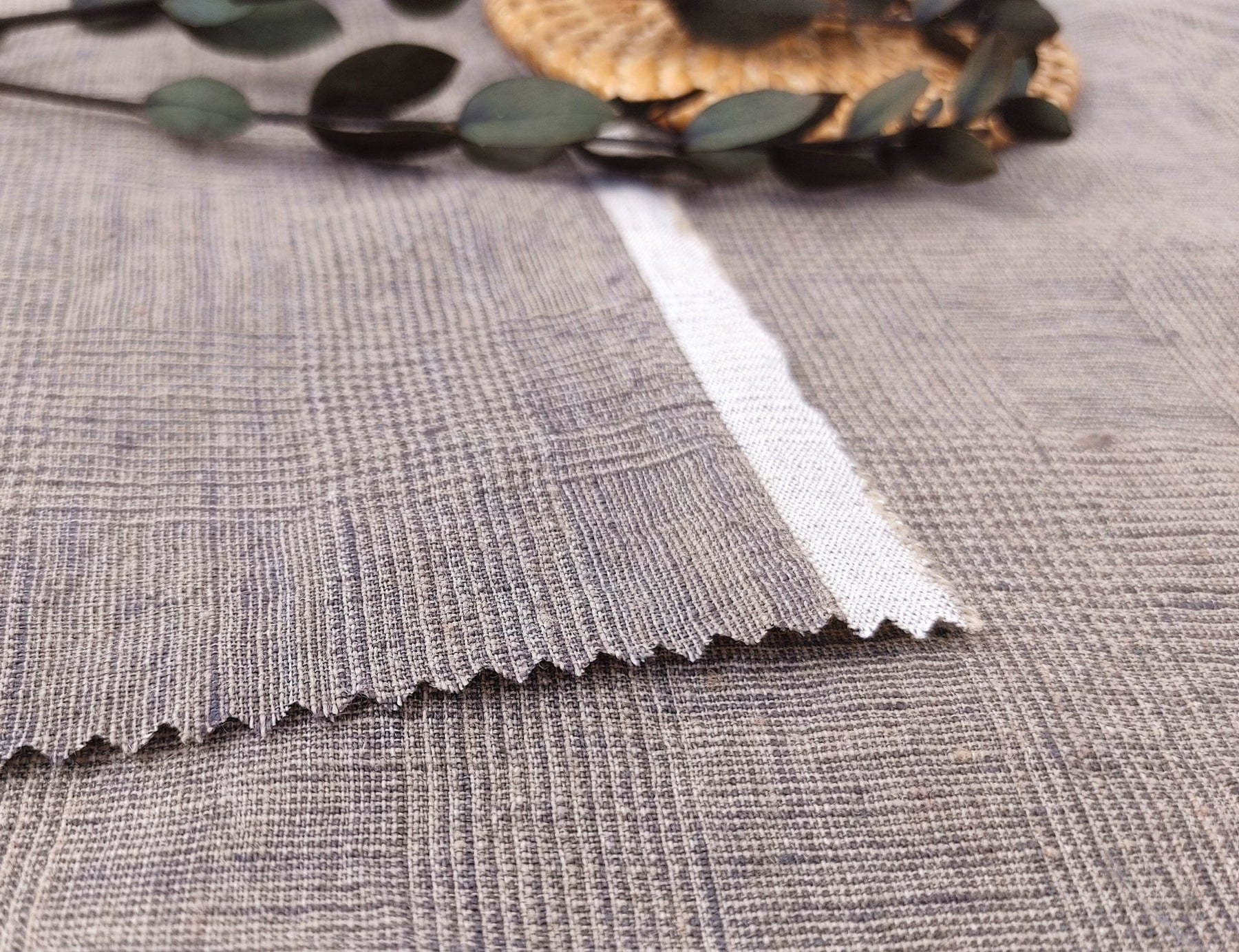 Indulge in the understated elegance of our Linen Polyester Blend Glen Plaid Fabric with Delave Effect. Crafted with meticulous attention to detail, this fabric combines 85% linen and 15% polyester for a soft and cool handfeel.