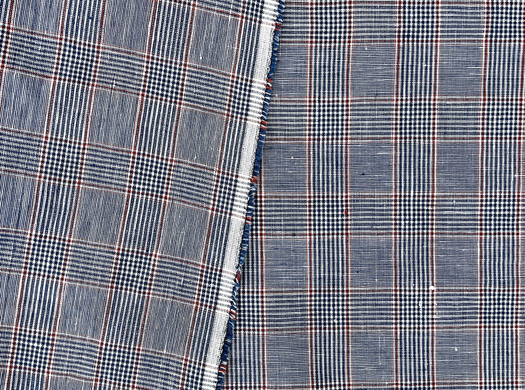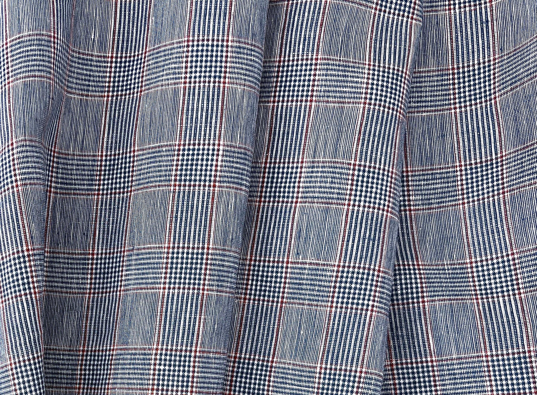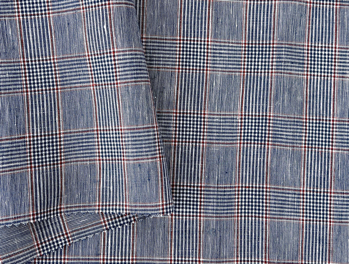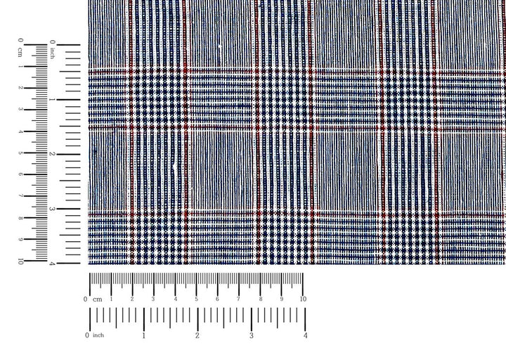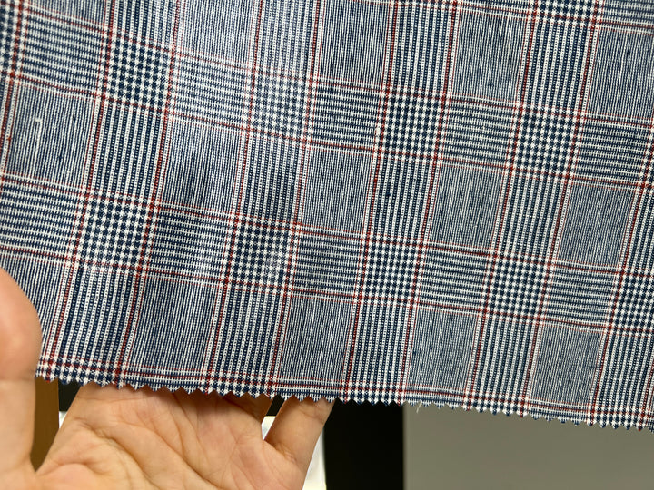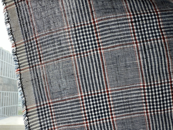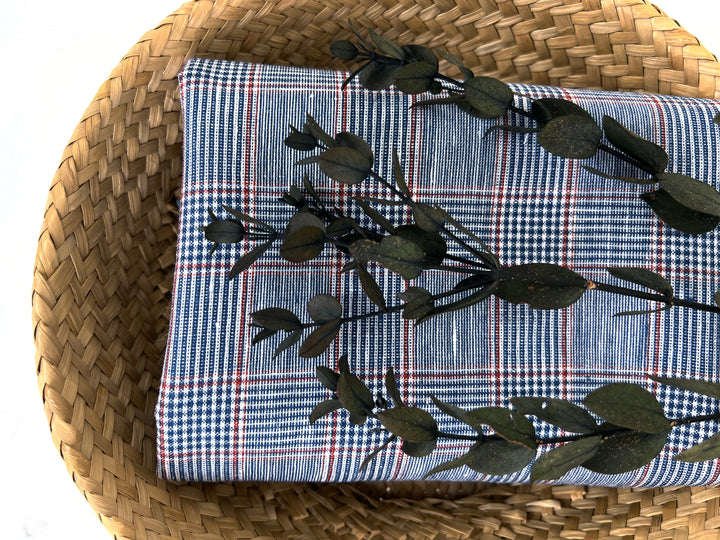 A refined linen-rayon blend fabric featuring a classic glen plaid pattern in navy and white, accented with a subtle red overcheck. The fabric is light to medium weight (170 g/sqm), making it versatile for apparel and interior projects.