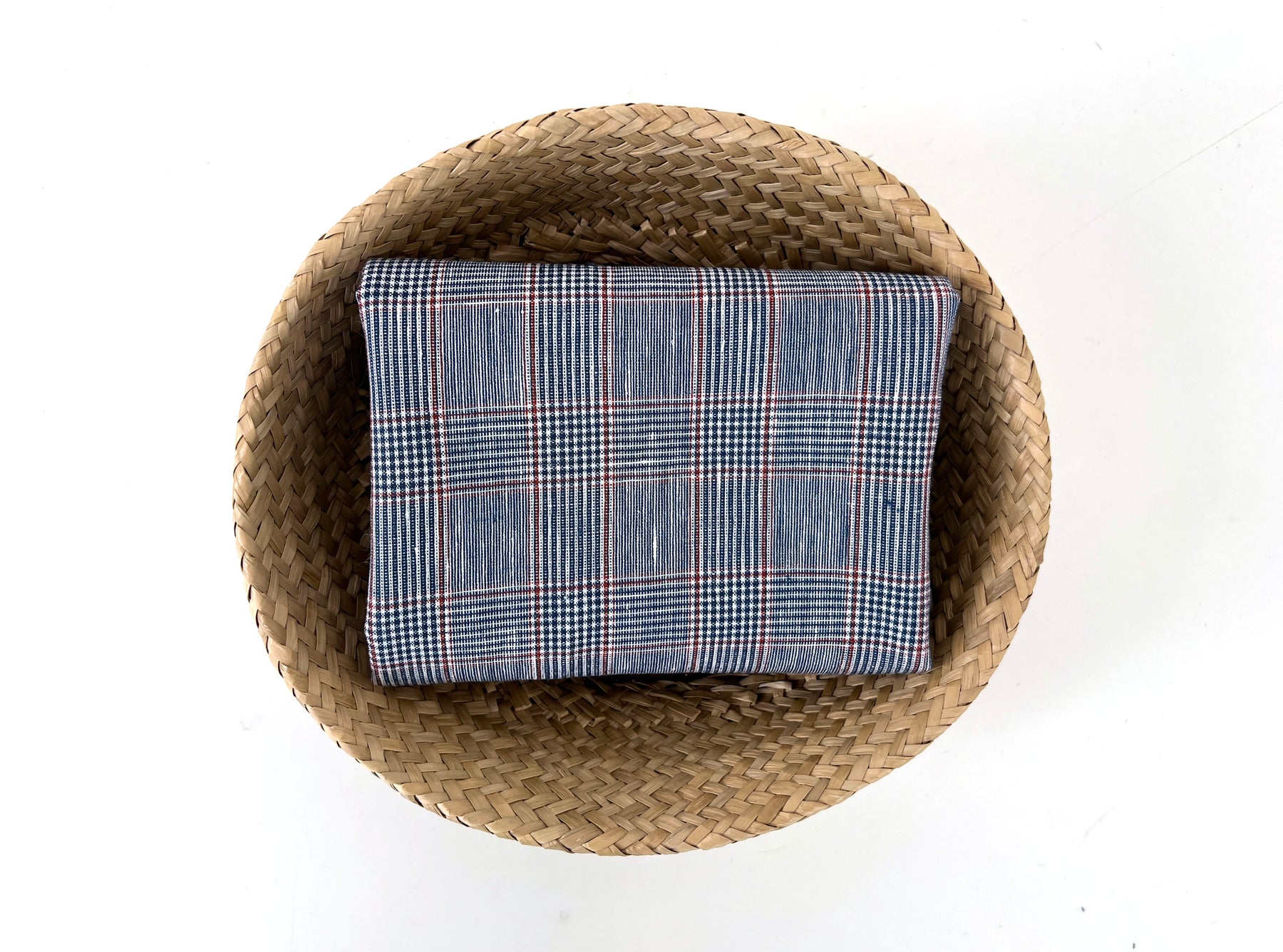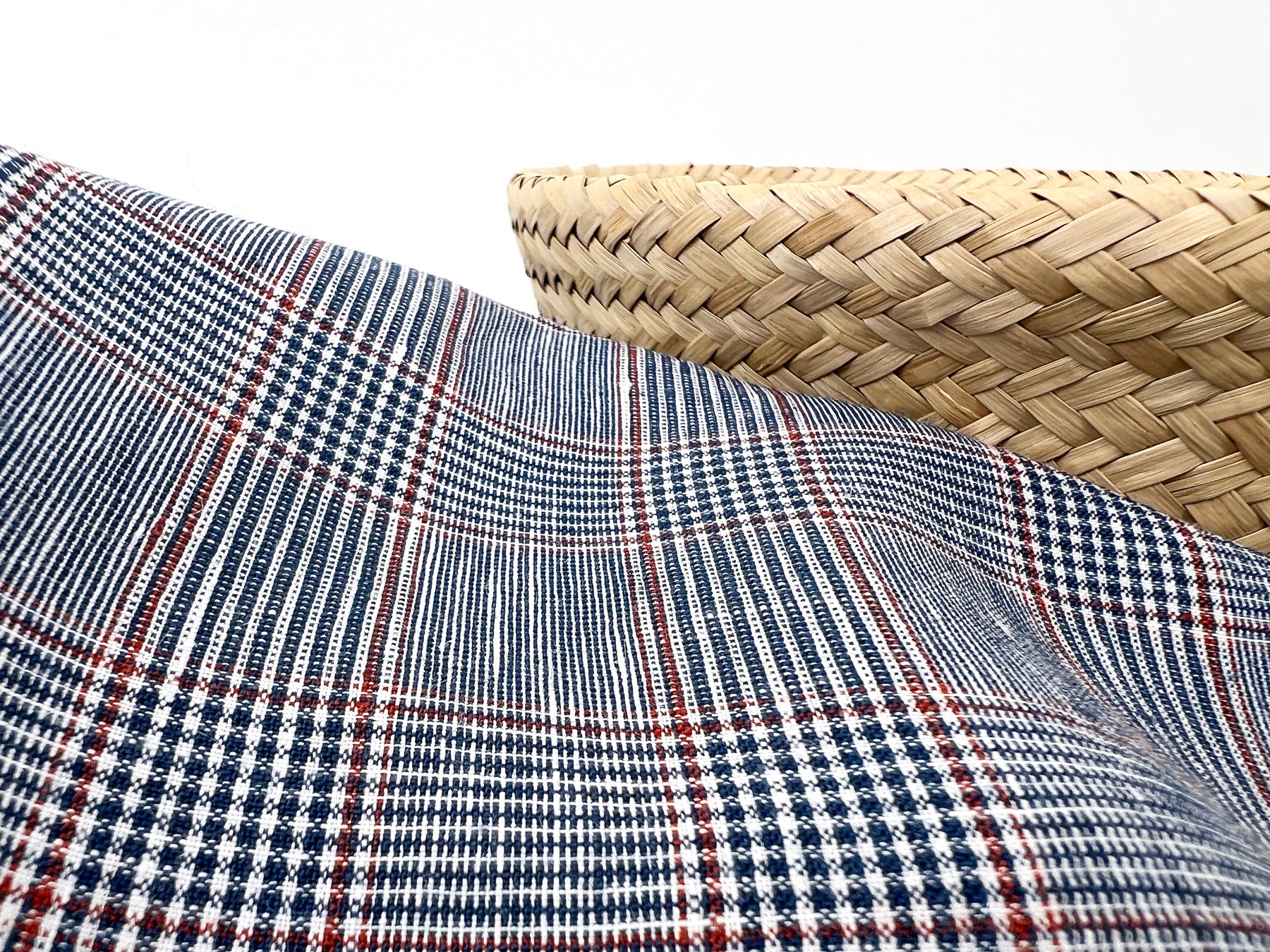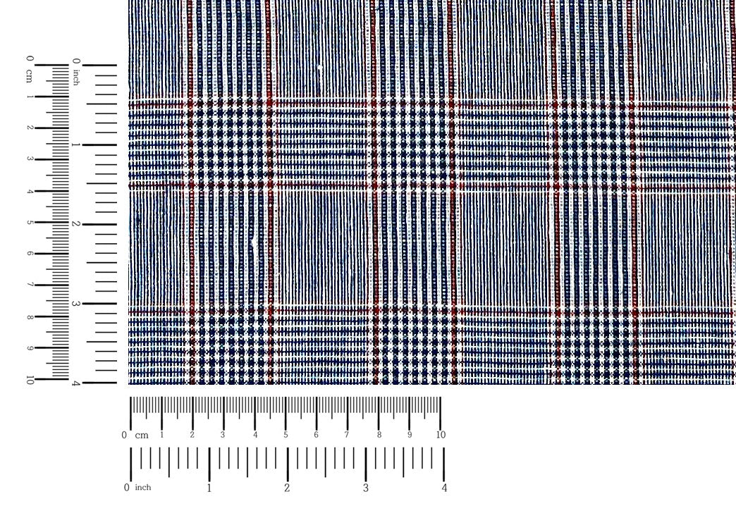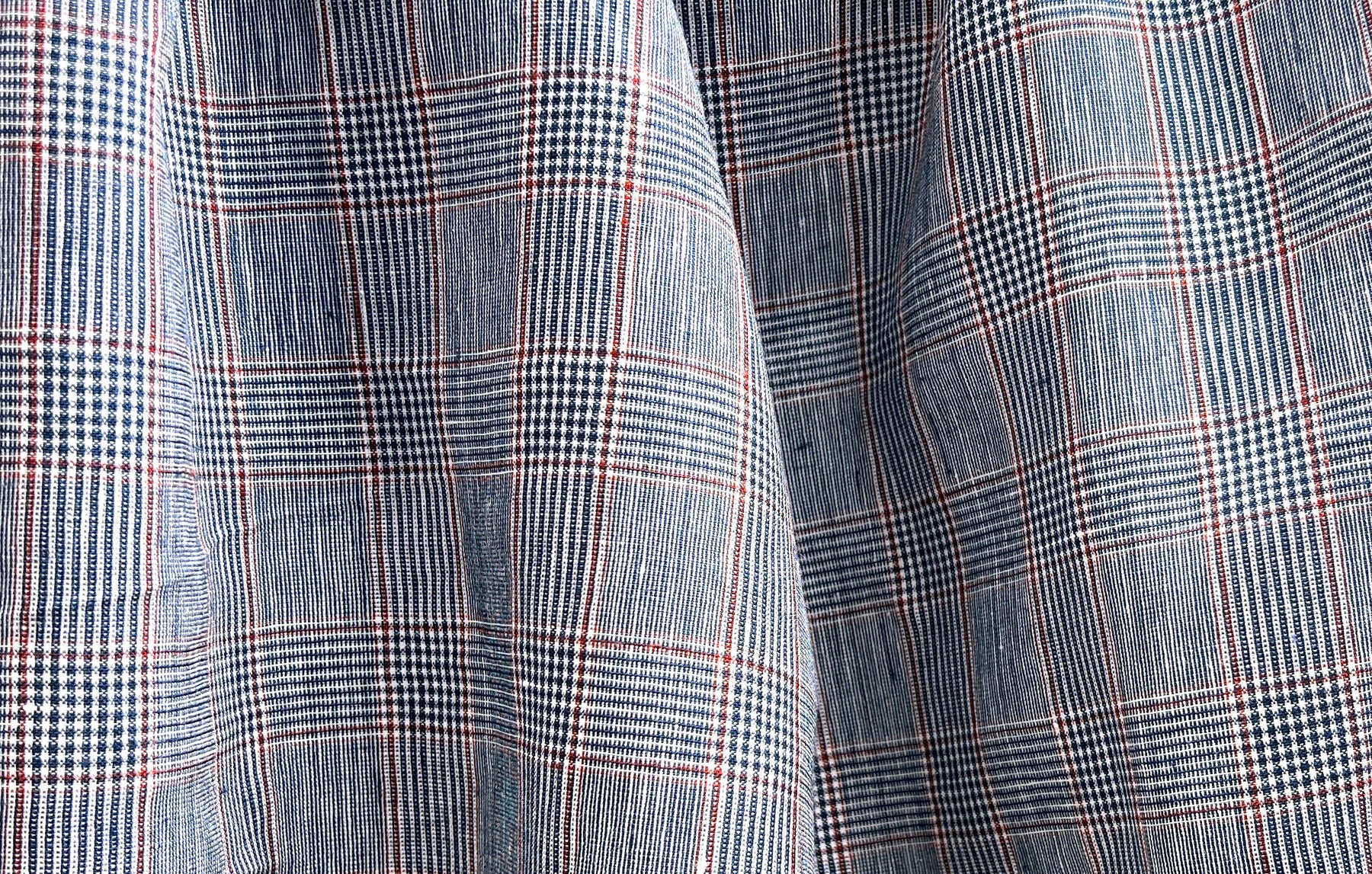 A refined linen-rayon blend fabric featuring a classic glen plaid pattern in navy and white, accented with a subtle red overcheck. The fabric is light to medium weight (170 g/sqm), making it versatile for apparel and interior projects.