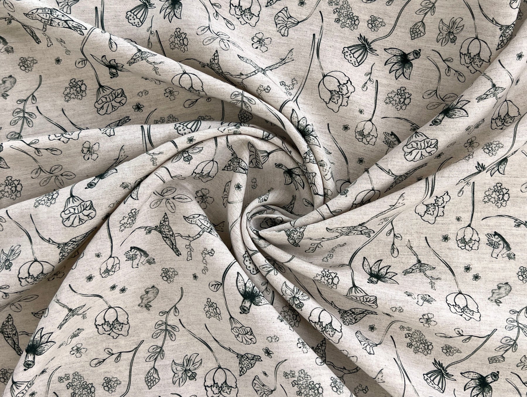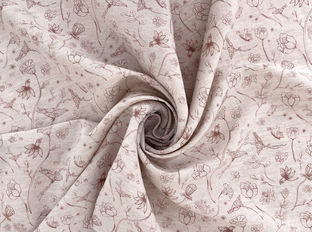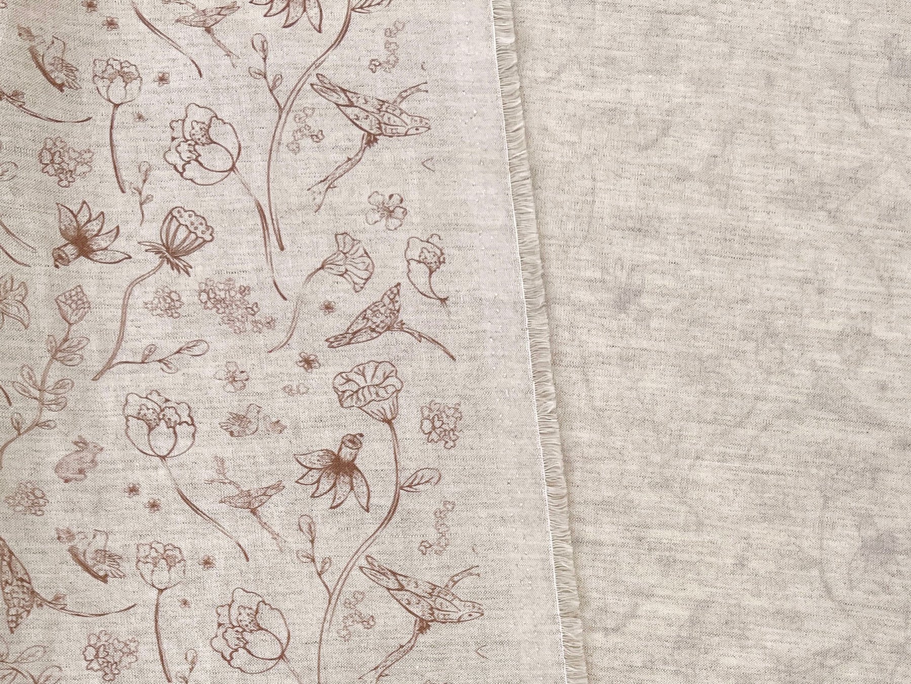 Printed on a soft natural base, this linen-rayon-silk blend fabric has a smooth, pre-washed finish and a gentle, comfortable touch. The addition of 7% silk enhances the fabric’s softness, giving it a more refined handfeel. With its light-to-medium weight, it is versatile for both apparel and interior projects—ideal for dresses, blouses, scarves, or elegant décor pieces.