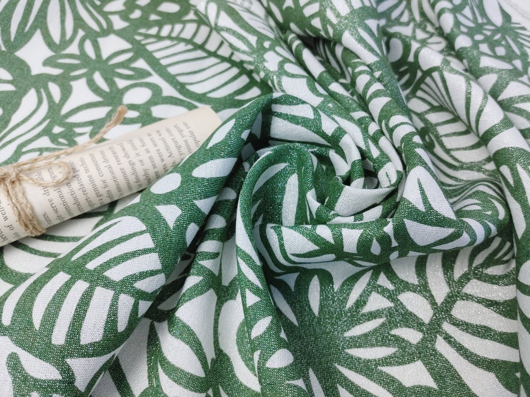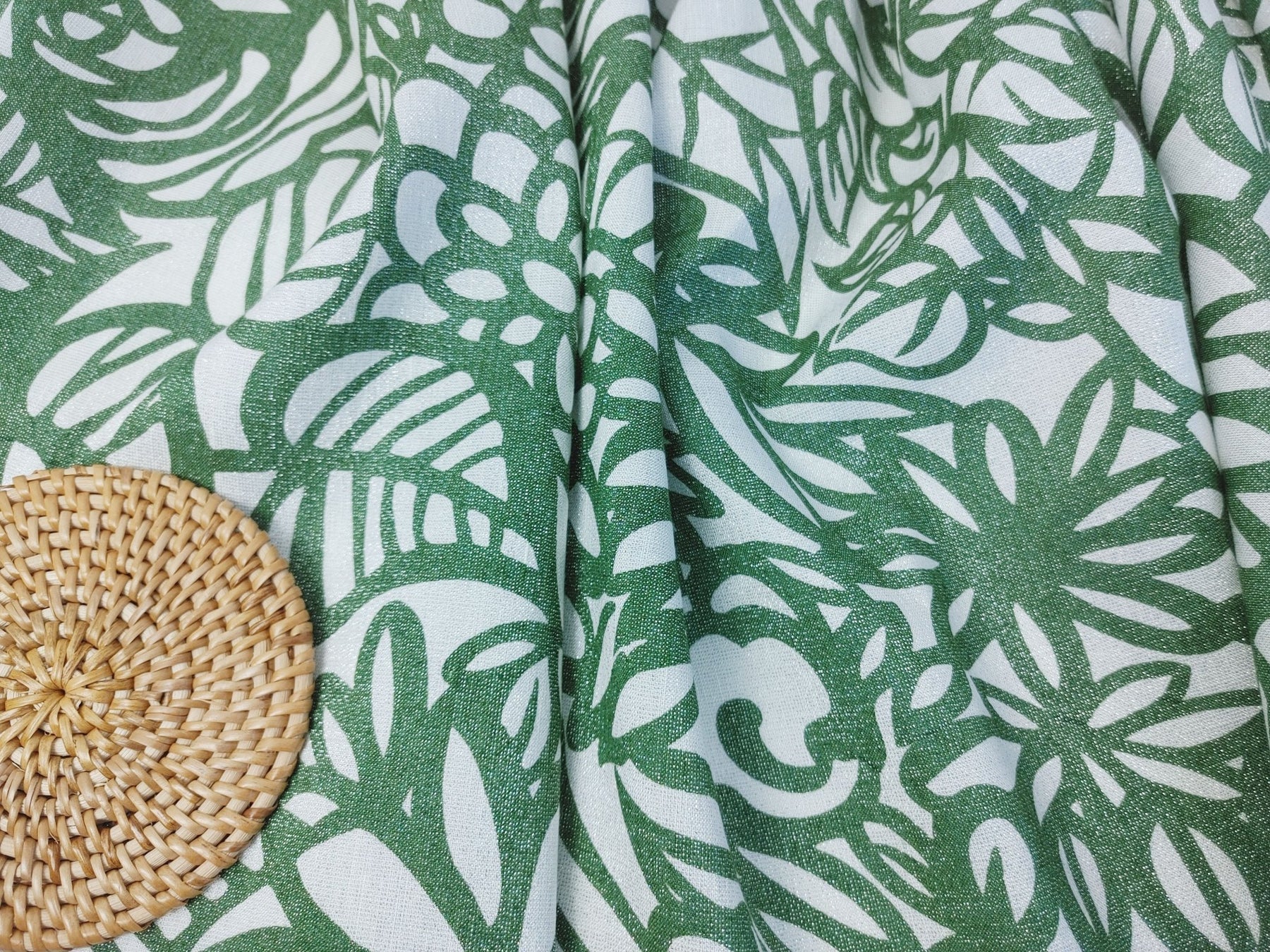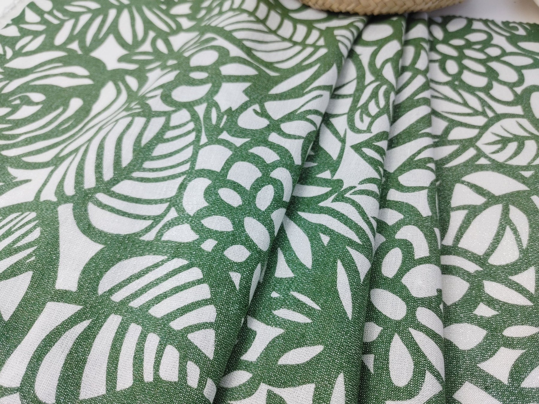 Linen Tencel Lurex Blend Fabric in Green Leaf Print effortlessly combines natural and metallic elements. The linen warp provides a solid foundation, while the weft introduces a blend of Tencel and silver-hued metallic Lurex yarn, subtly elevating the fabric. Adorned with a green leaf pattern, it exudes simple, nature-inspired charm.
