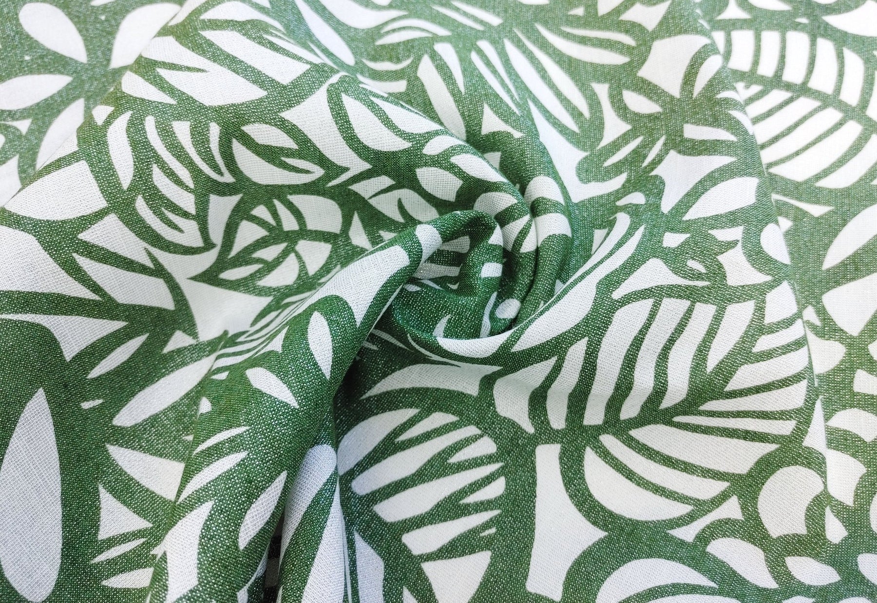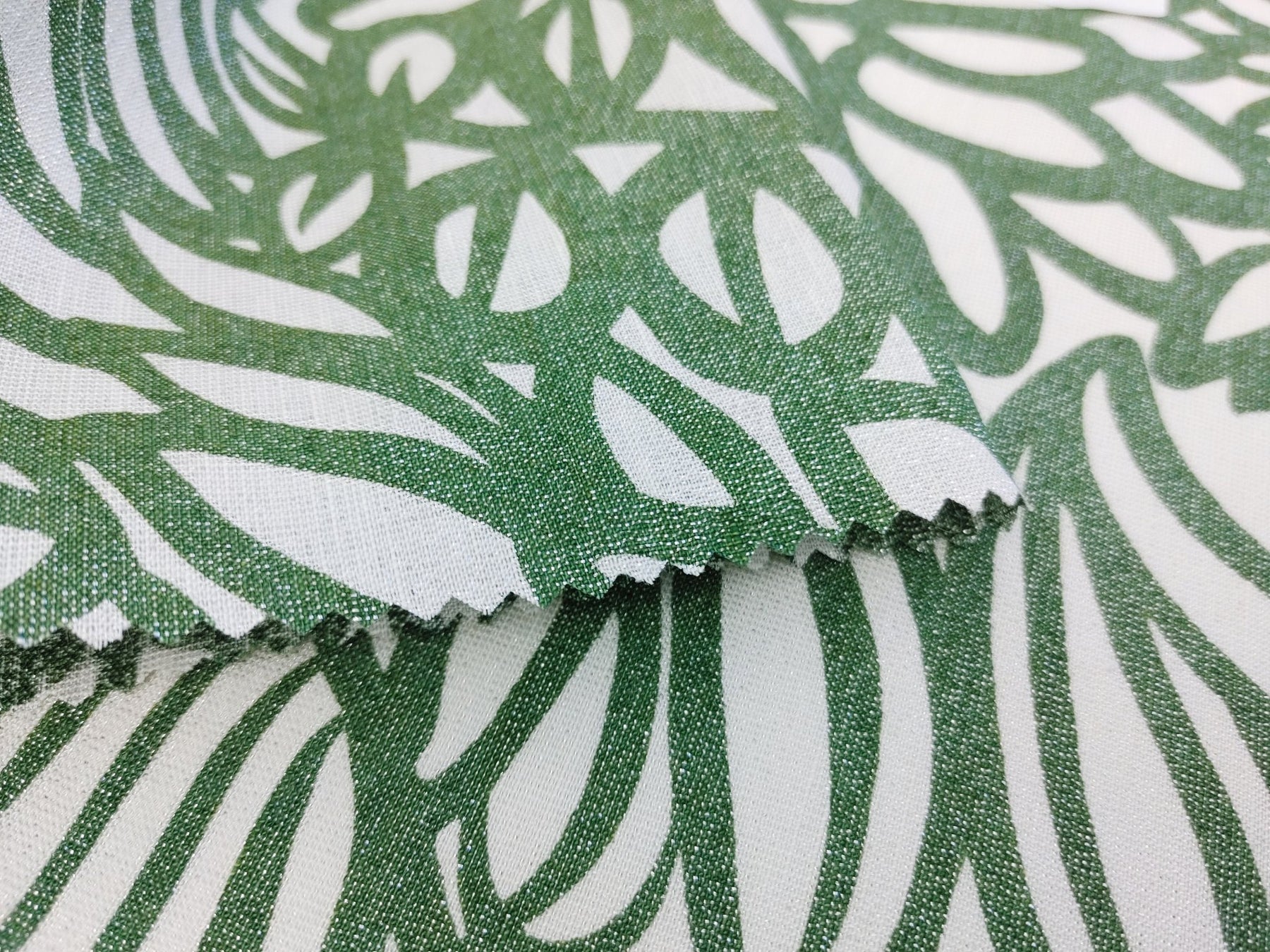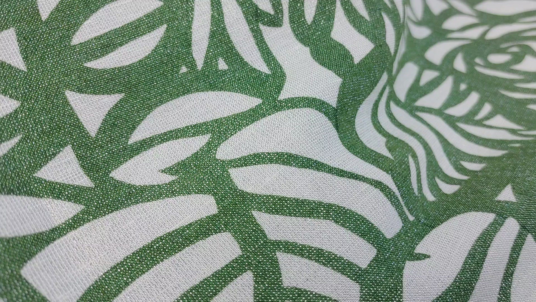 Linen Tencel Lurex Blend Fabric in Green Leaf Print effortlessly combines natural and metallic elements. The linen warp provides a solid foundation, while the weft introduces a blend of Tencel and silver-hued metallic Lurex yarn, subtly elevating the fabric. Adorned with a green leaf pattern, it exudes simple, nature-inspired charm.