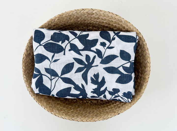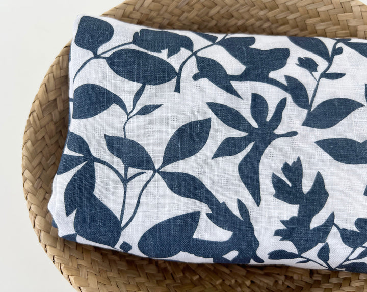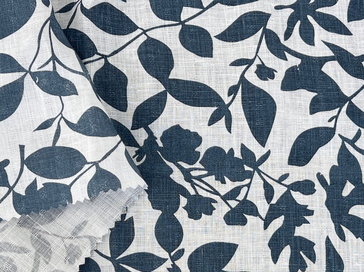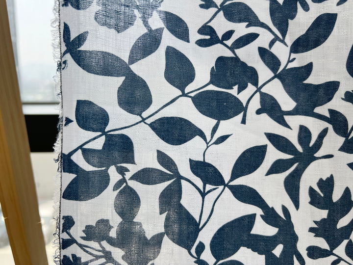 This lightweight 100% linen fabric features a navy botanical leaf print on a soft white base. The fabric is woven with a subtle dobby texture—not a plain weave—which adds depth and character to the surface. Made from fine linen yarn and pre-washed for softness, it offers a naturally breathable feel and a soft drape. The bold, nature-inspired print and refined texture make it a versatile choice for stylish garments, light curtains, or decorative home projects.
