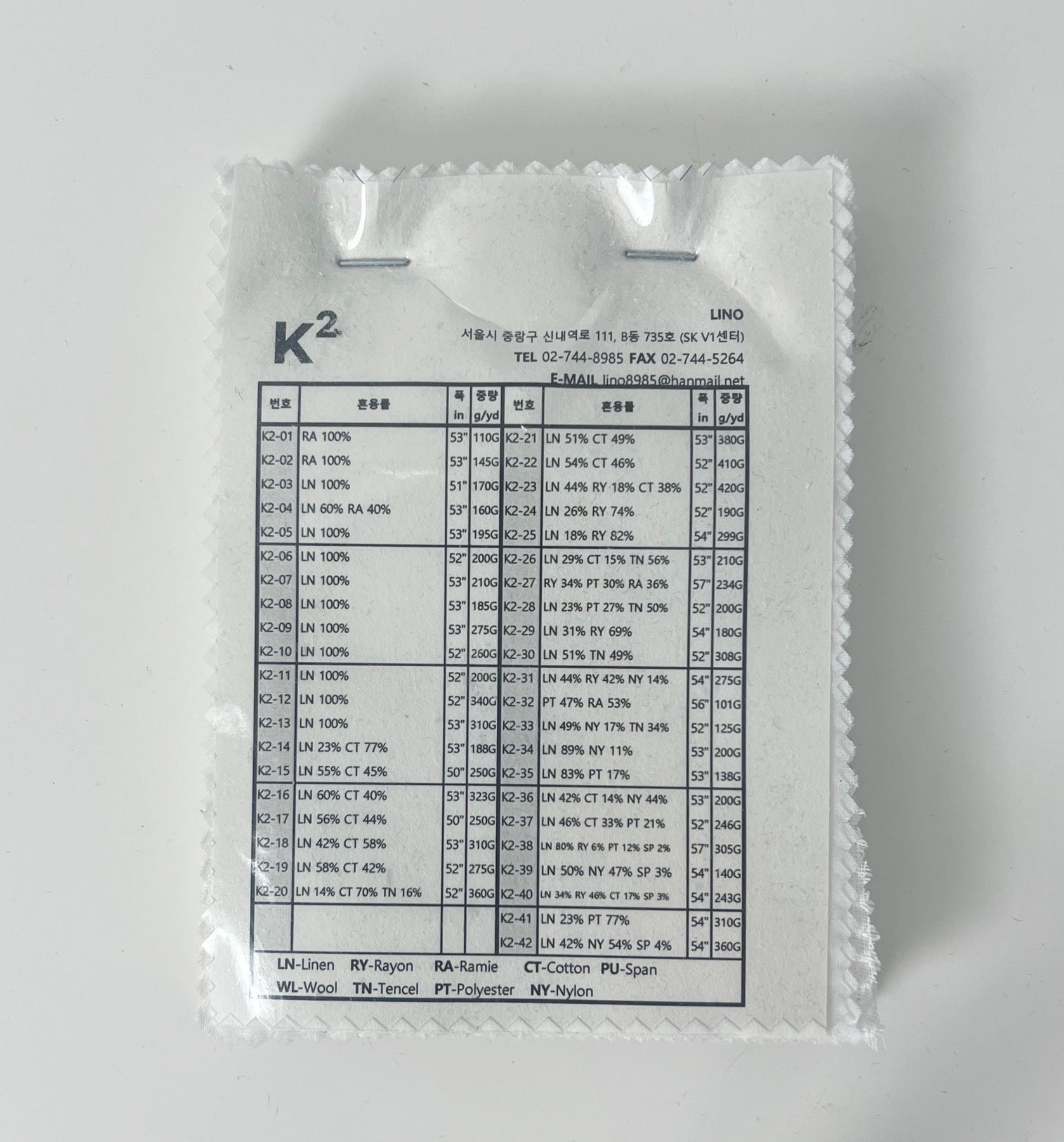 The K2 Collection offers a versatile mix of 100% linen, ramie, and linen-blend fabrics—combining linen with cotton, Tencel, nylon, wool, polyester, and more. Presented in soft off-white tones, these fabrics feature a variety of textures and handfeels, making them ideal for a wide range of creative projects. Fabric widths range from 52 to 56 inches.