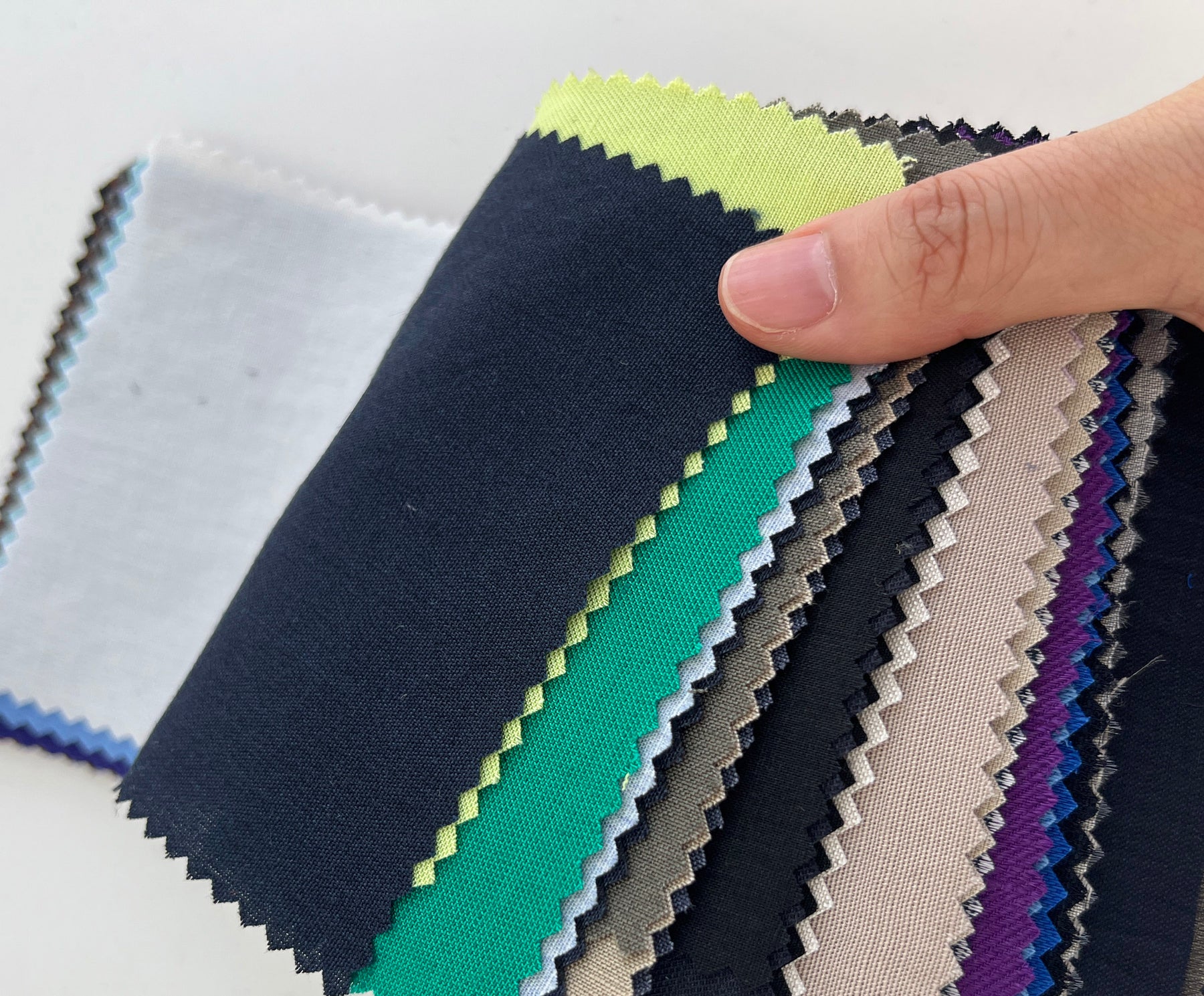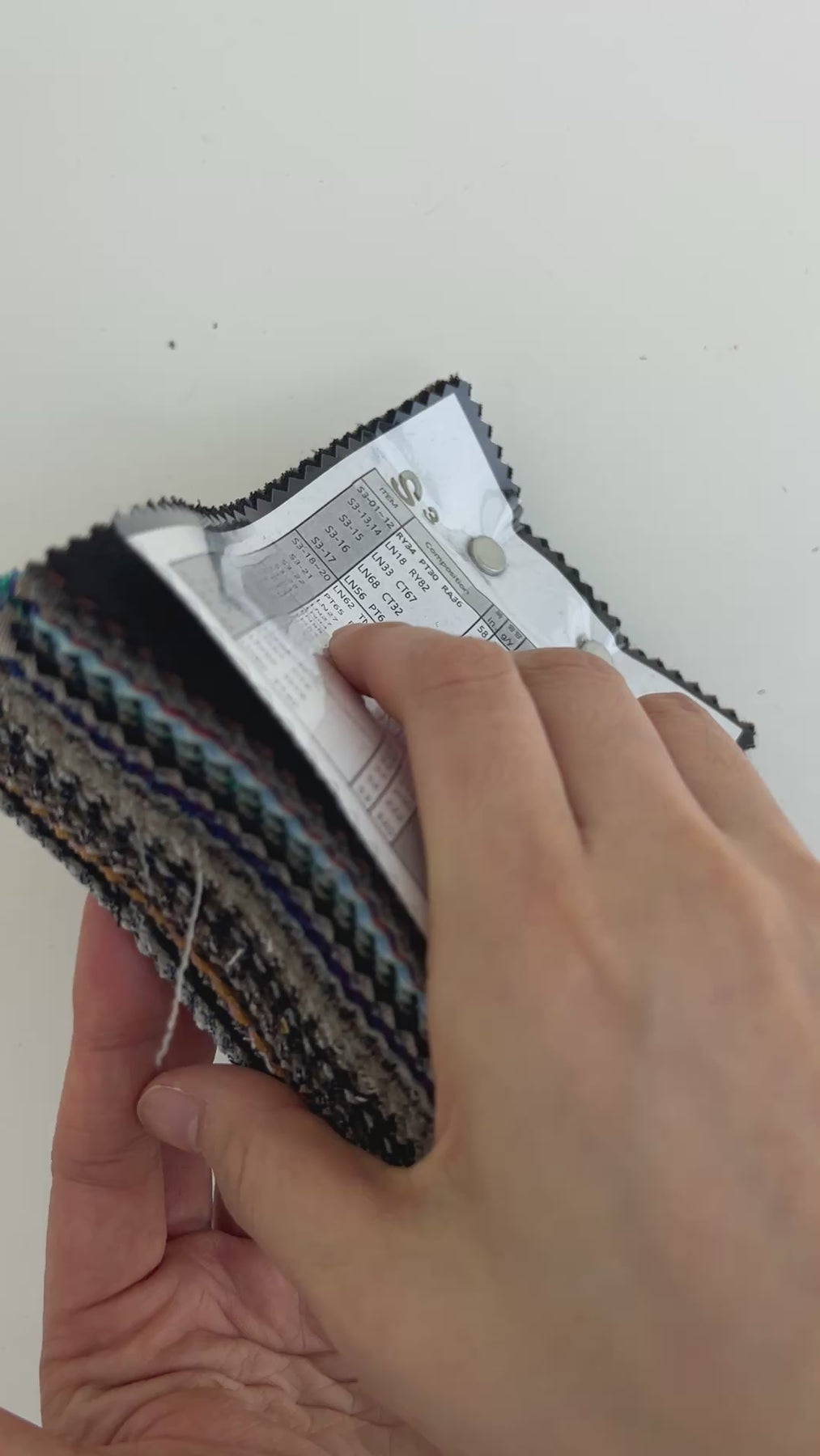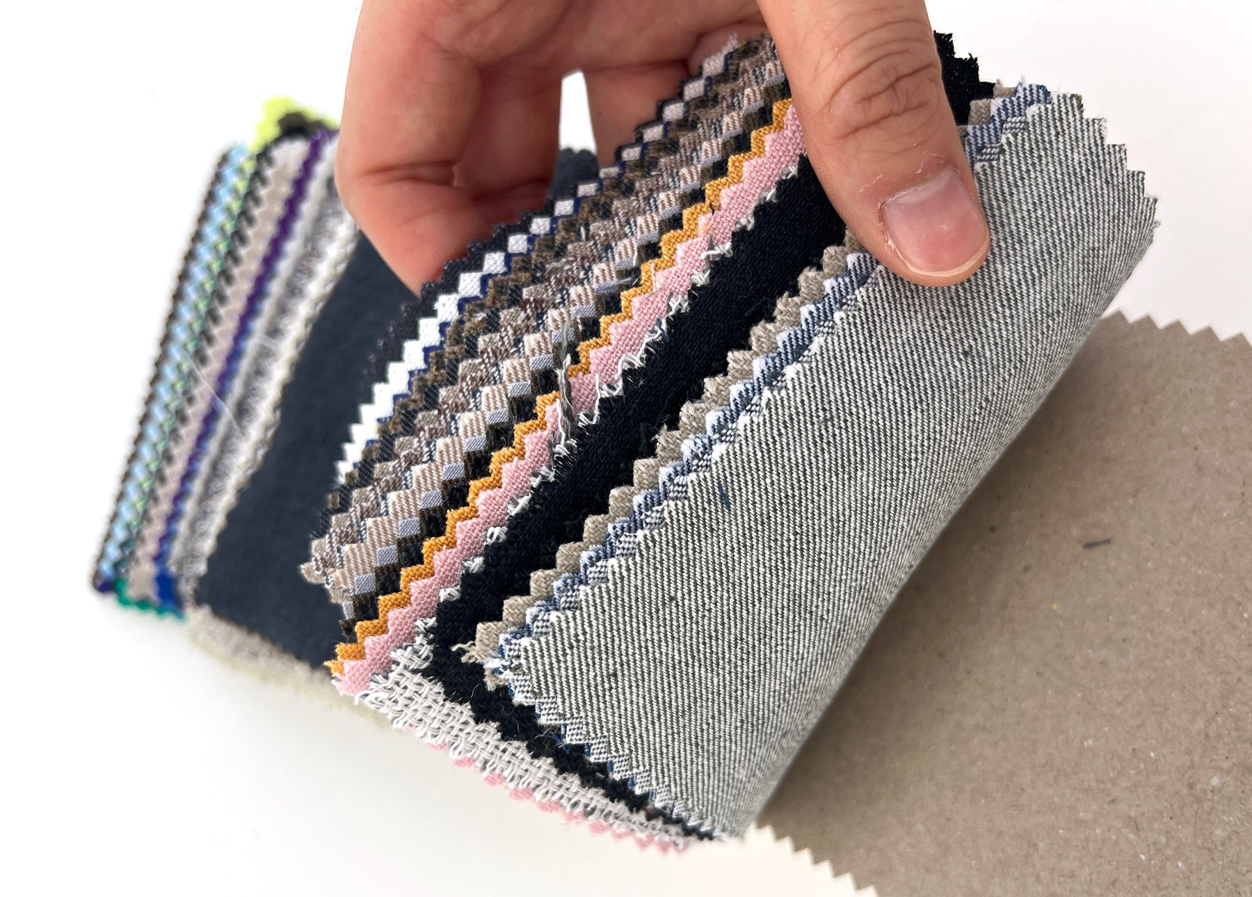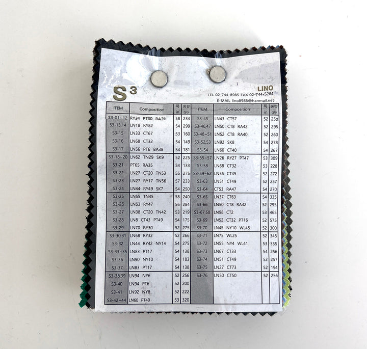 This collection includes 76 fabric swatches. Each swatch measures 11 x 15.5 cm (4.3 x 6.1 inches) and comes with a 3- to 4-digit item number sticker. You can use these numbers to search for each fabric directly on our website. Composition, width, and weight details are printed on the first page—perfect for exploring the possibilities of linen blends.