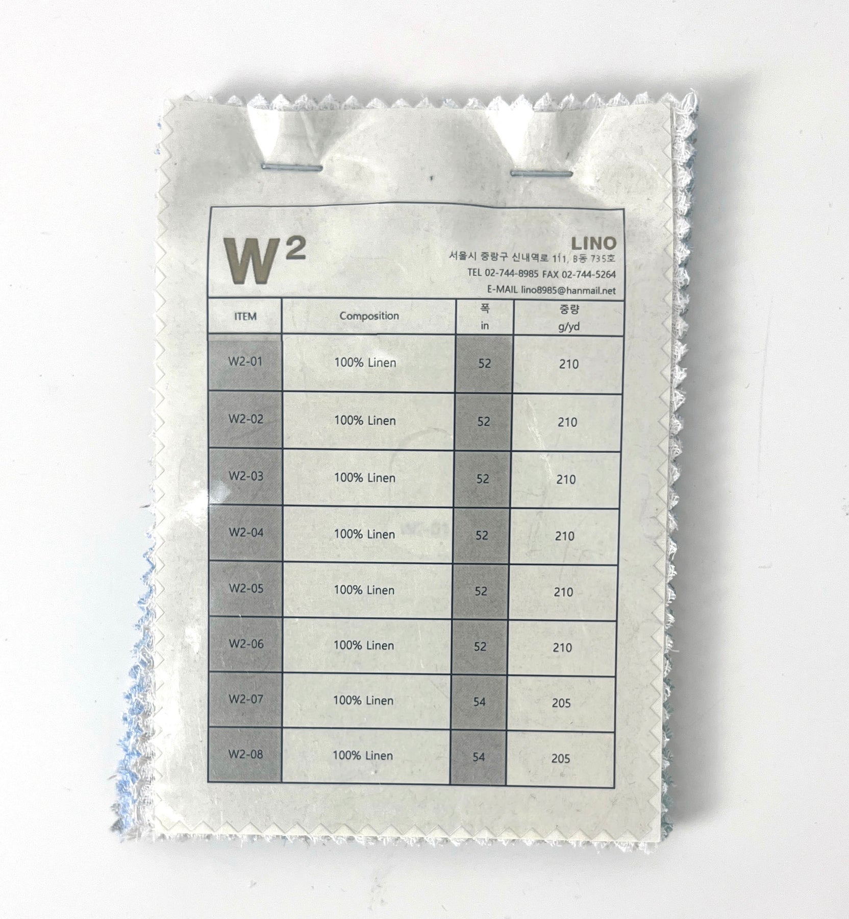 This set includes 8 swatches, each measuring 11 x 15.5 cm (4.3 x 6.1 inches), with a 3- to 4-digit item number sticker attached. These numbers can be used to easily search each fabric on our website. A printed guide on the first page provides key information such as composition, width, and weight—perfect for exploring the character and versatility of pure linen.