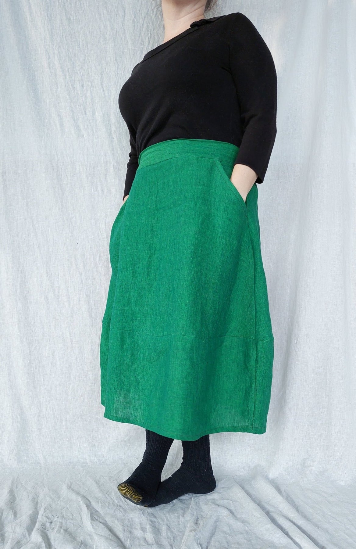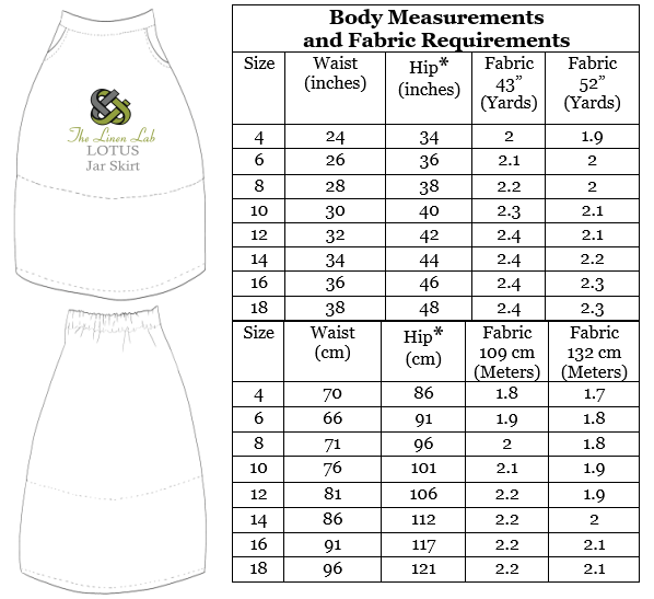 This skirt is designed to be sewn by all levels, from confident beginner to expert. The skirt features a flat front and elastic back waistband, slash pockets at the waist and a tapered lower skirt.