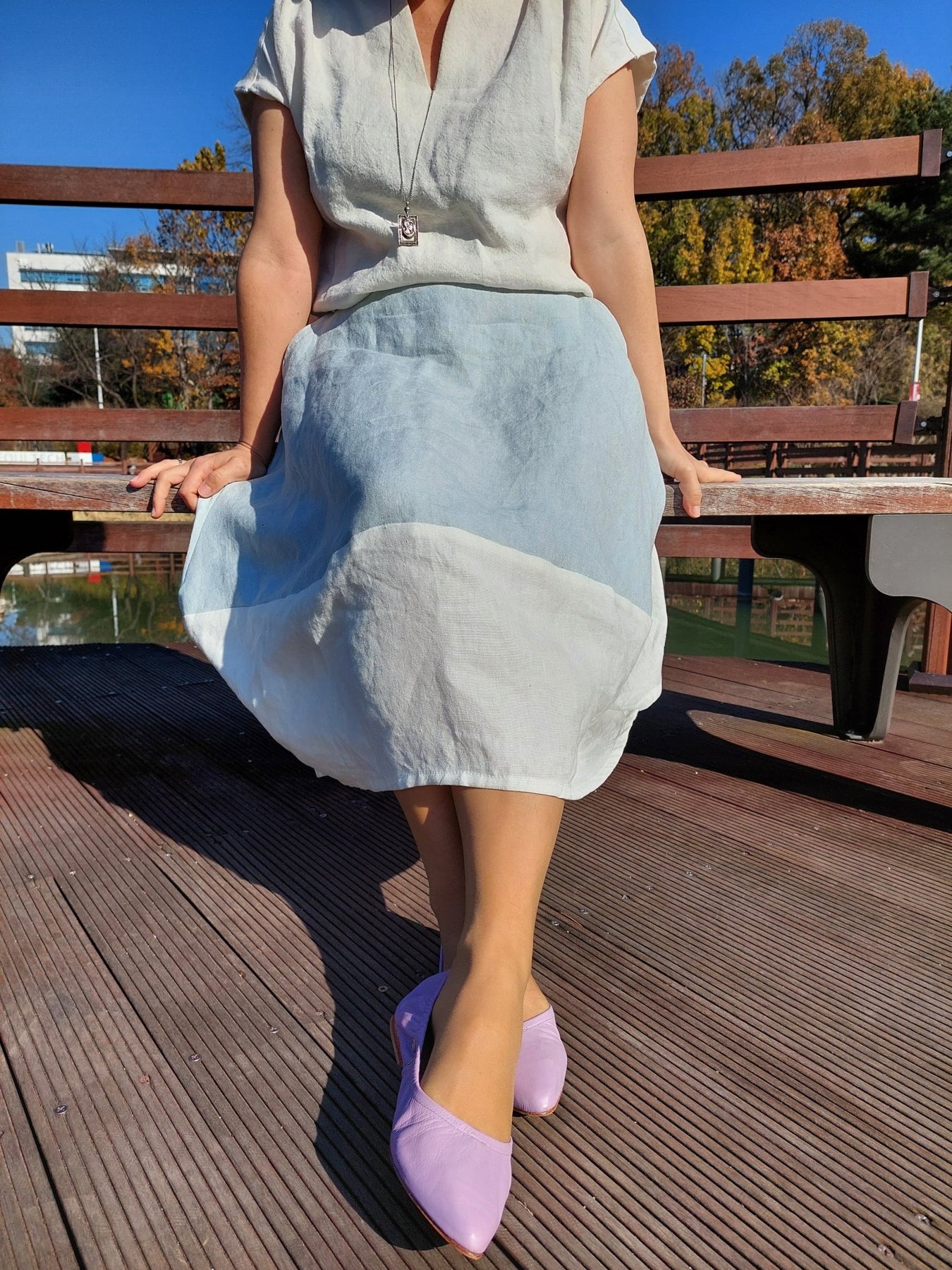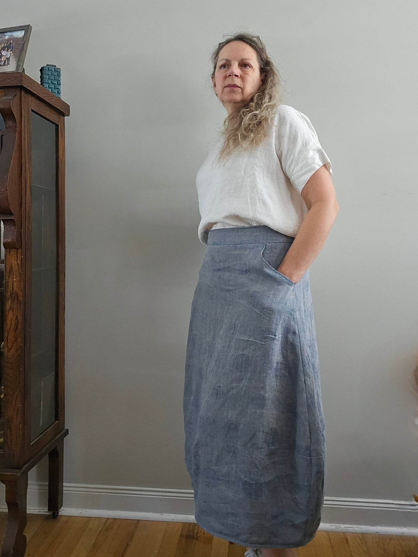 Instagram user @sewingwithlinen made a size 12 Lotus in our Linen/Silk Canvas 6555 blue and 6494 white