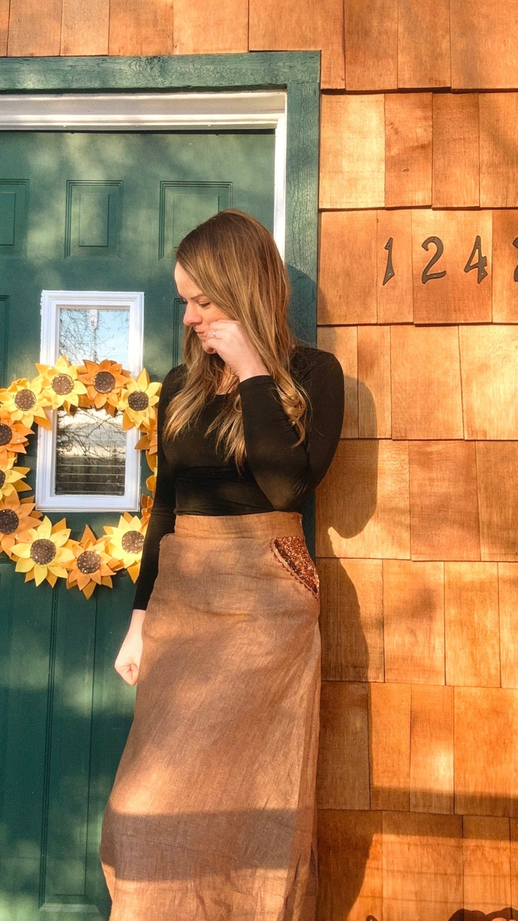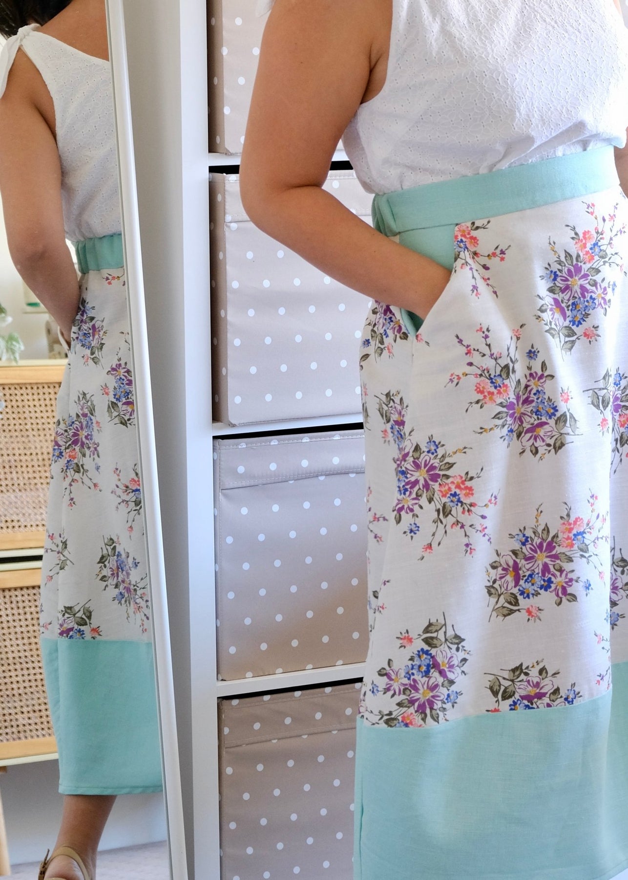 The Lotus Skirt is designed for a 160 cm/ 5'4" person to wear this so that the top and bottom skirt meet at the knee. You may change this to fit your preferences, or lengthen or shorten the skirt to match your height