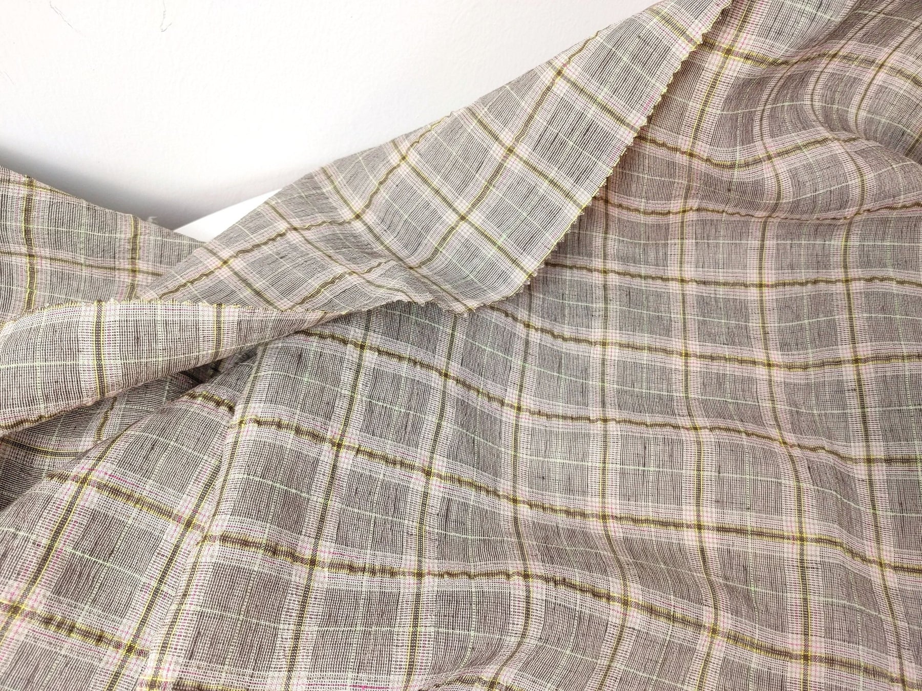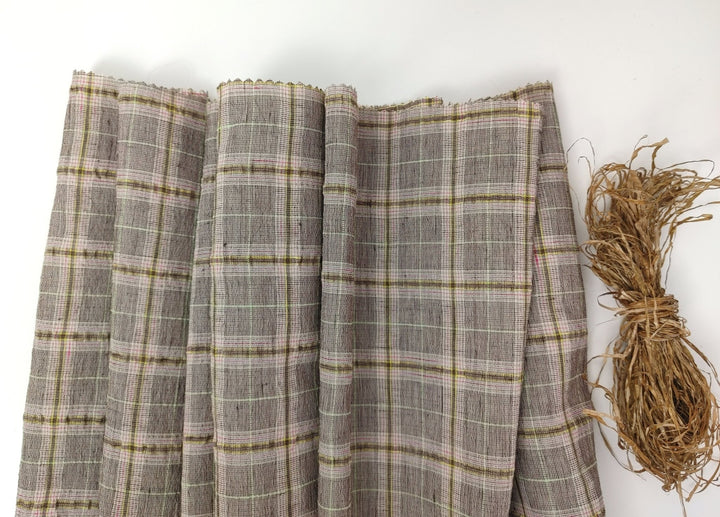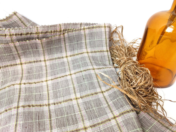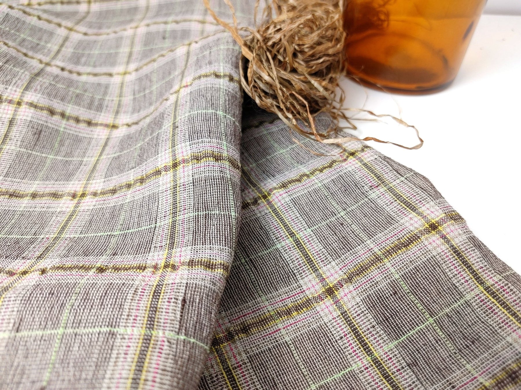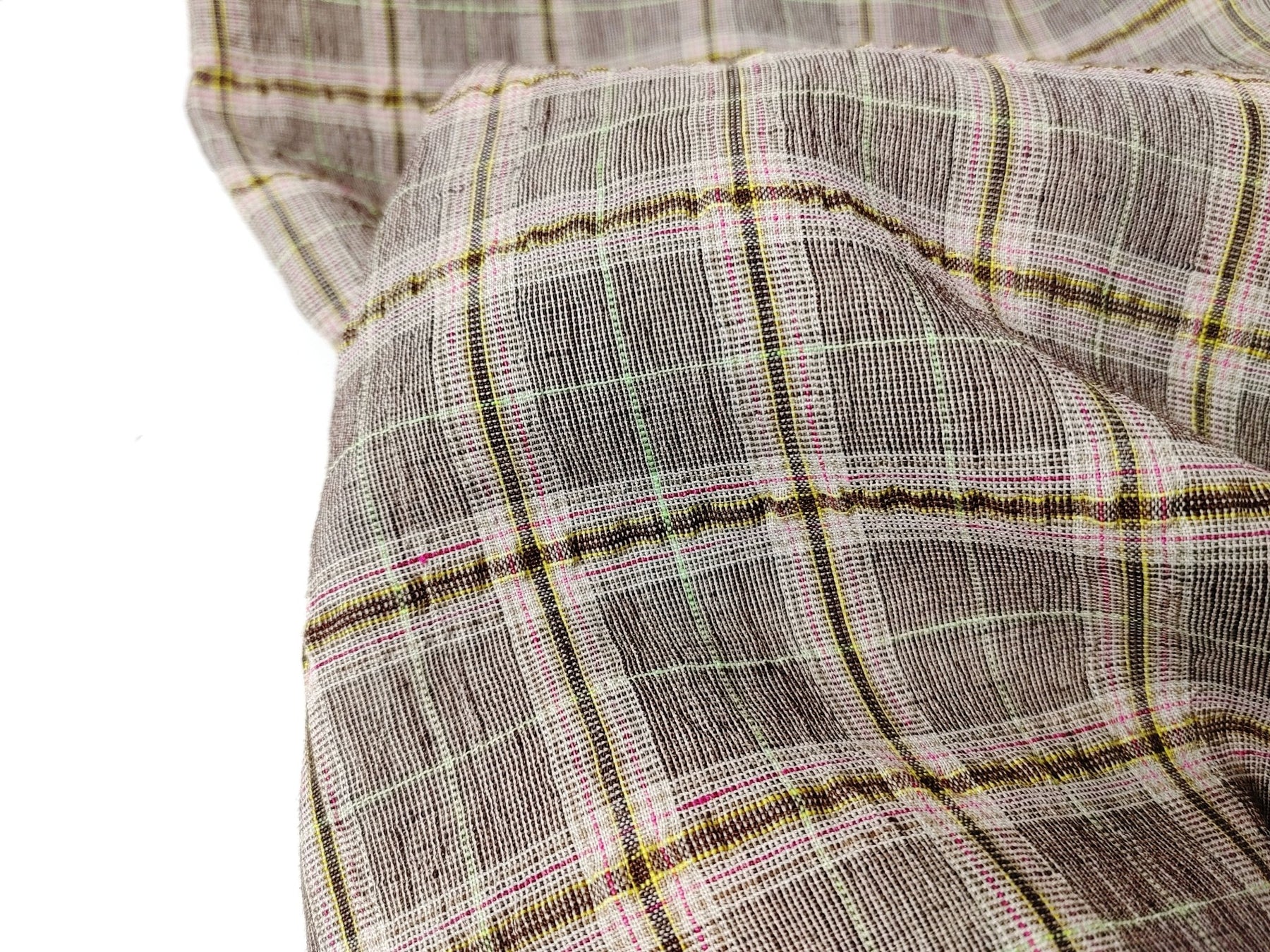 Introducing our Linen Polyester Stretch Fabric in a stylish Tartan Plaid pattern, featuring a mix of brown and yellow colors. With a composition of 60% linen, 38% polyester, and 2% PU, this lightweight fabric (125 g/sqm or 3.68 oz per square yard) incorporates a natural wrinkle effect for added texture. Pre-washed for a soft feel and offering elasticity, it's the perfect choice for comfortable and trendy creations.