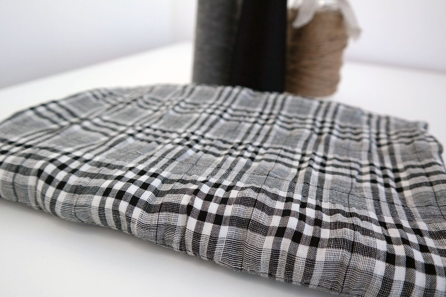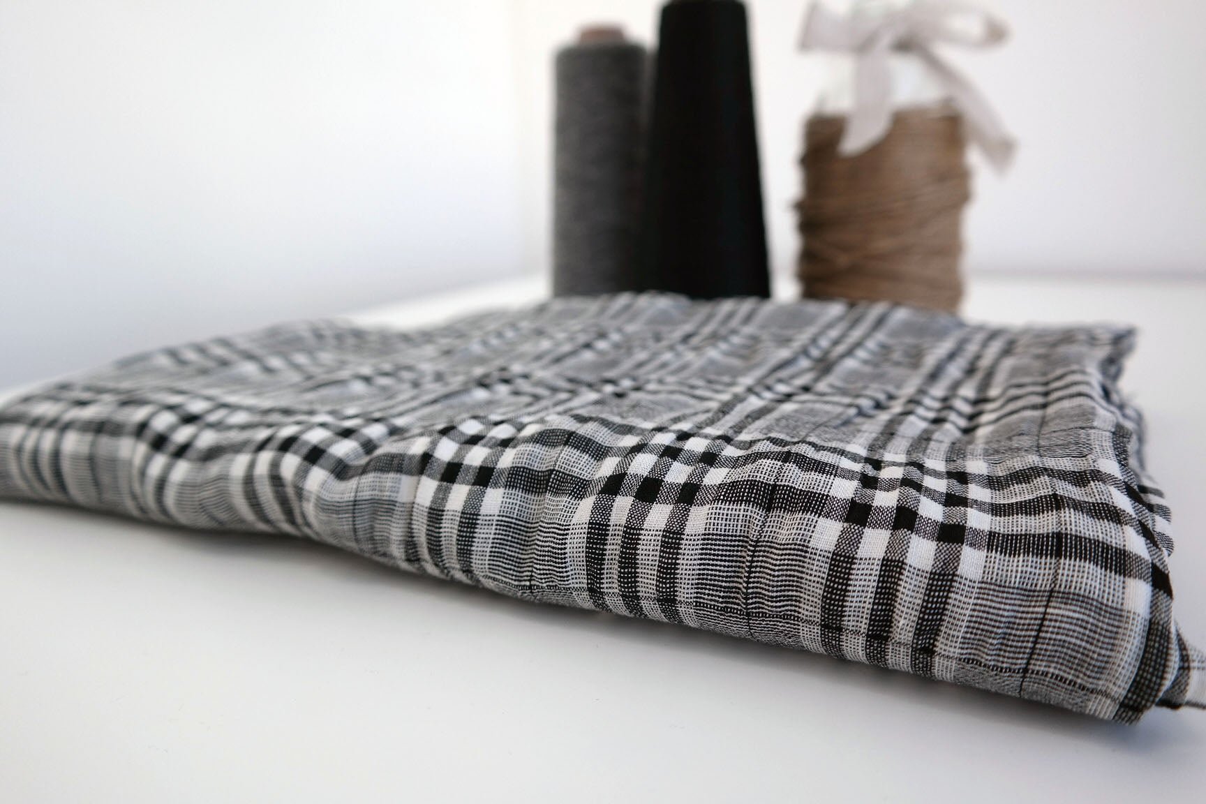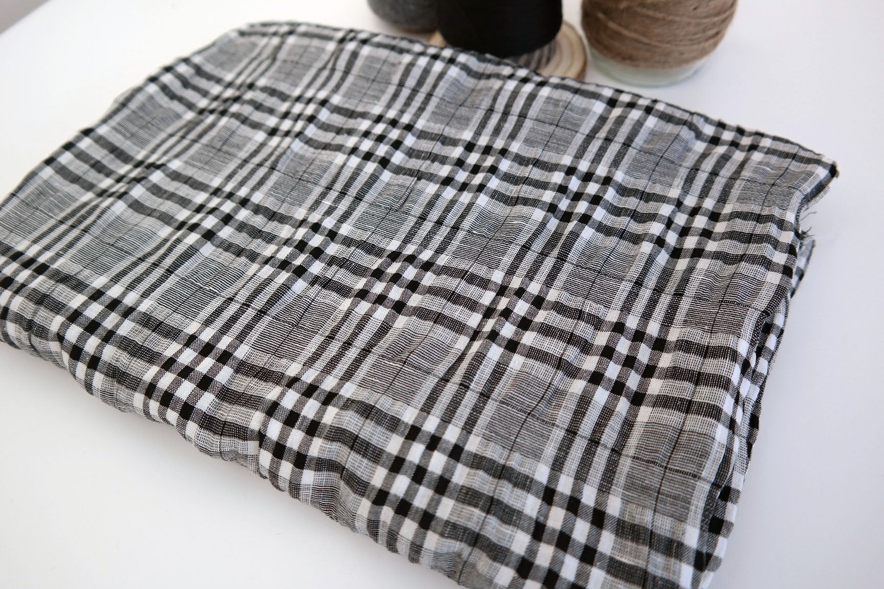 Linen Rayon Plaid Stretch Wrinkled Fabric (6713) - The Linen Lab - White and Black