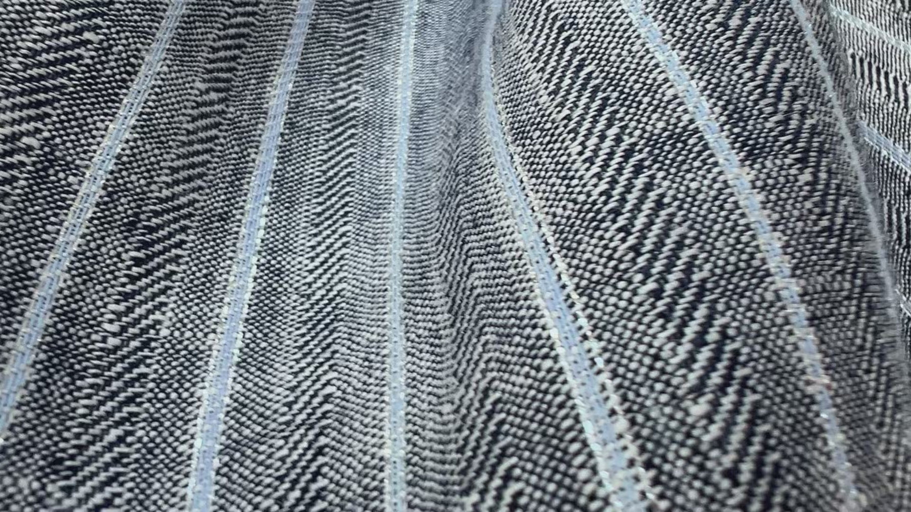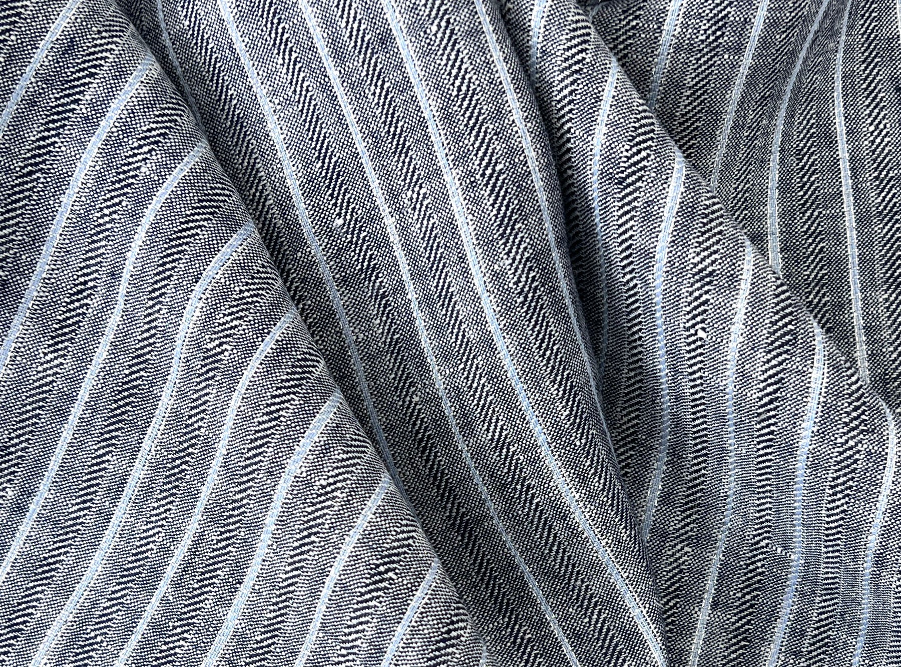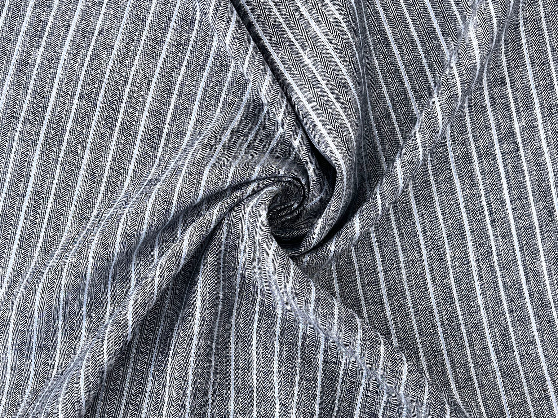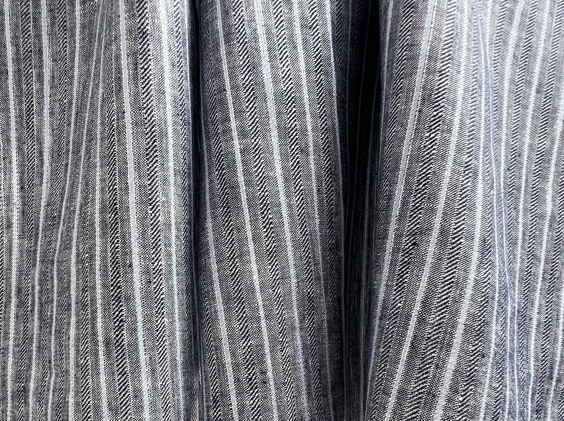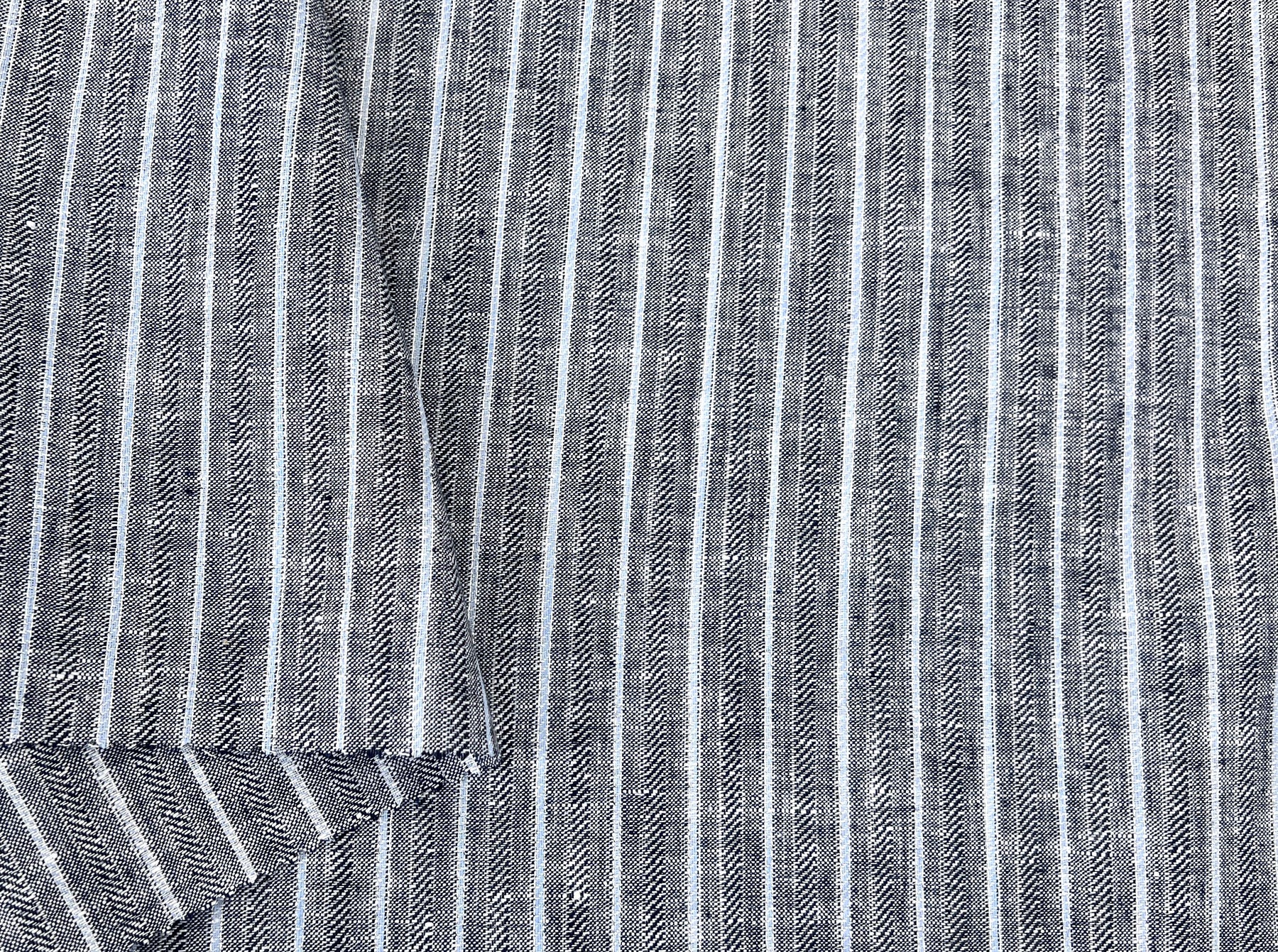 This elegant linen fabric is enhanced with subtle silver lurex yarns, adding a delicate sparkling effect to its surface. The lurex is woven in a stripe pattern with a dobby weave, giving the fabric refined texture and understated shine.
