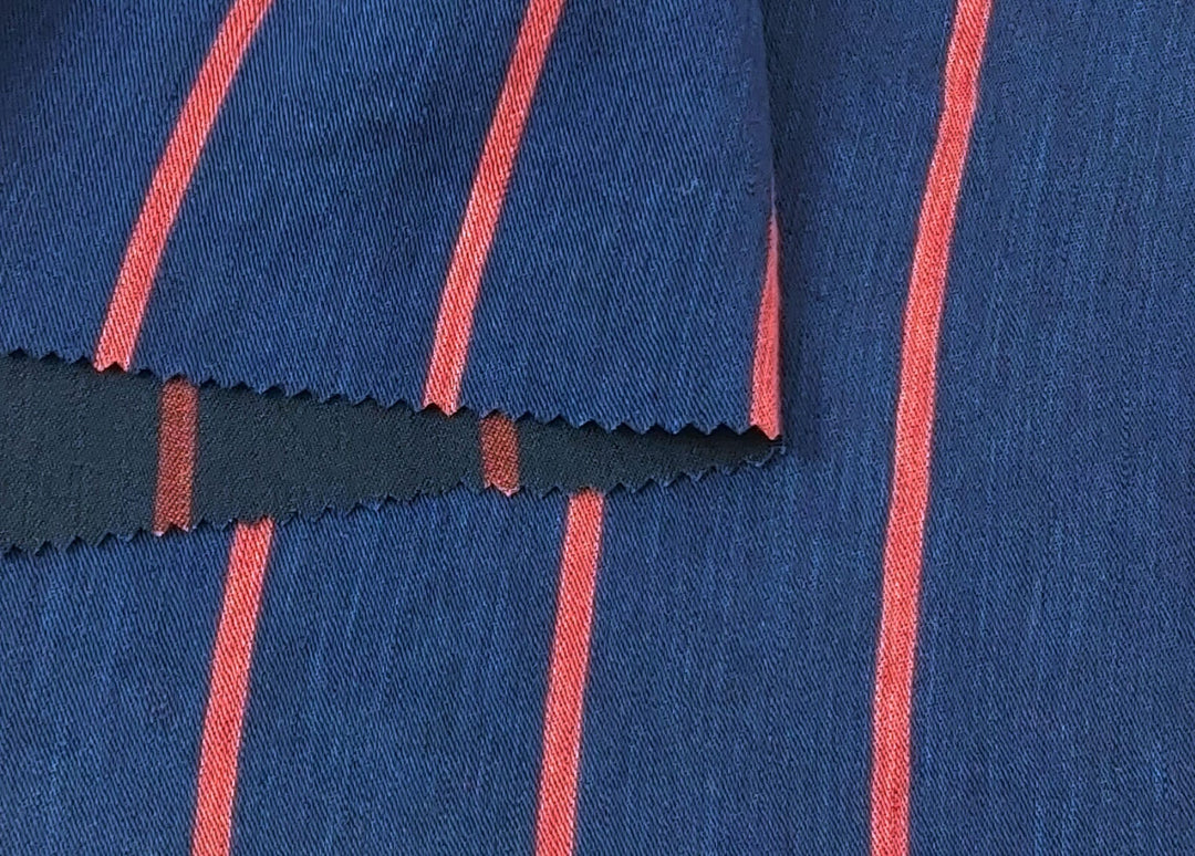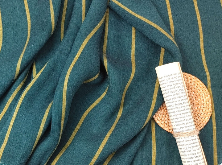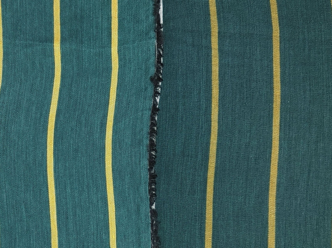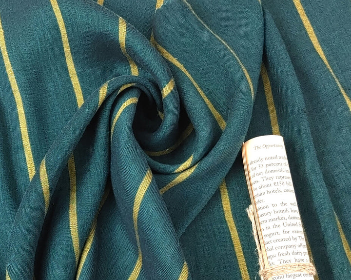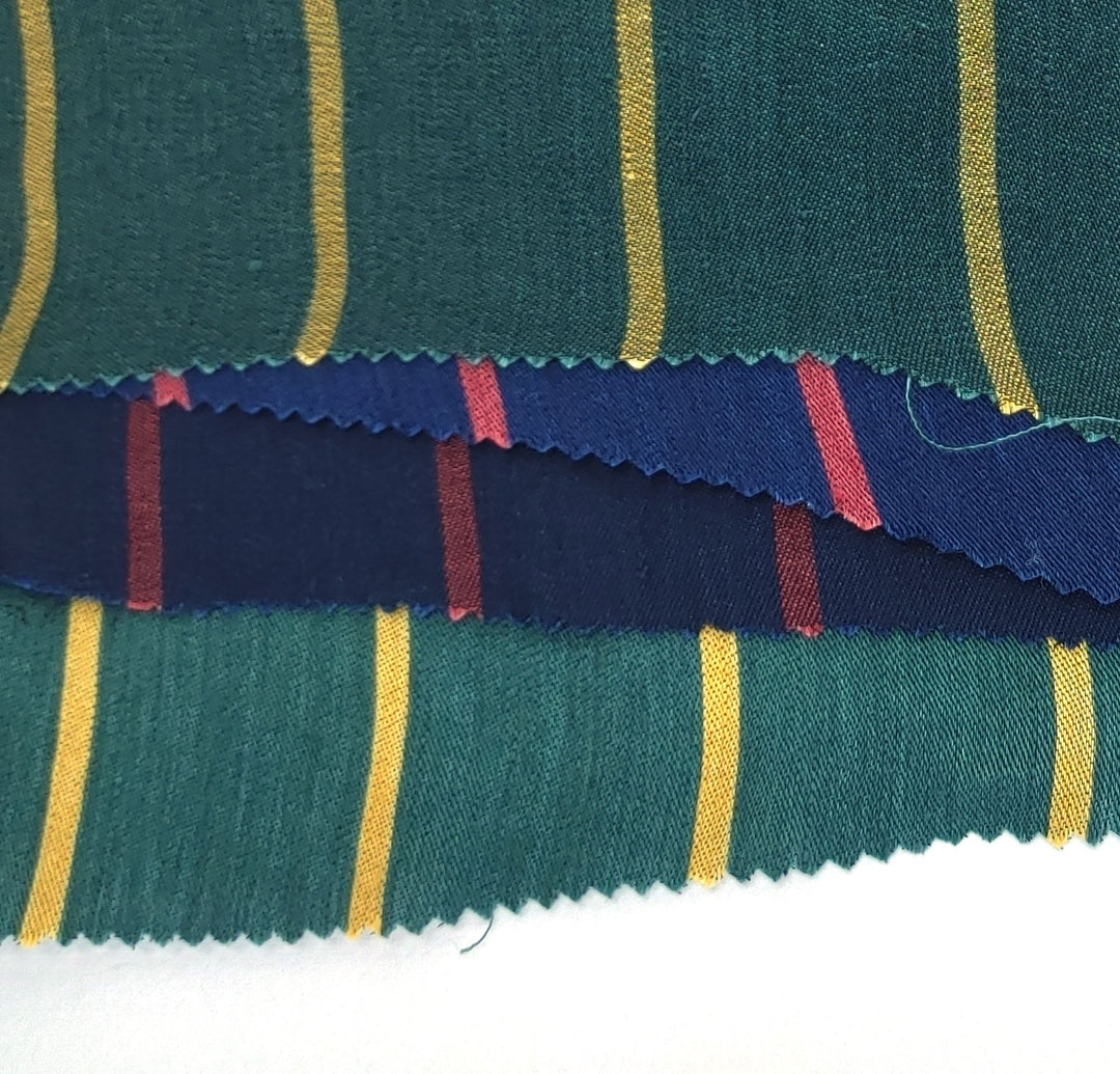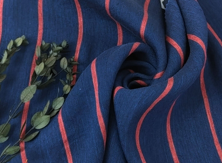 Meet our Linen Rayon Satin Stripe Fabric, a blend of classic charm and modern allure. The warp, woven with yarn-dyed linen, ensures lasting color and a touch of natural drape. The weft introduces a contemporary twist with high-twist black rayon filament yarn, offering both sheen and durability.