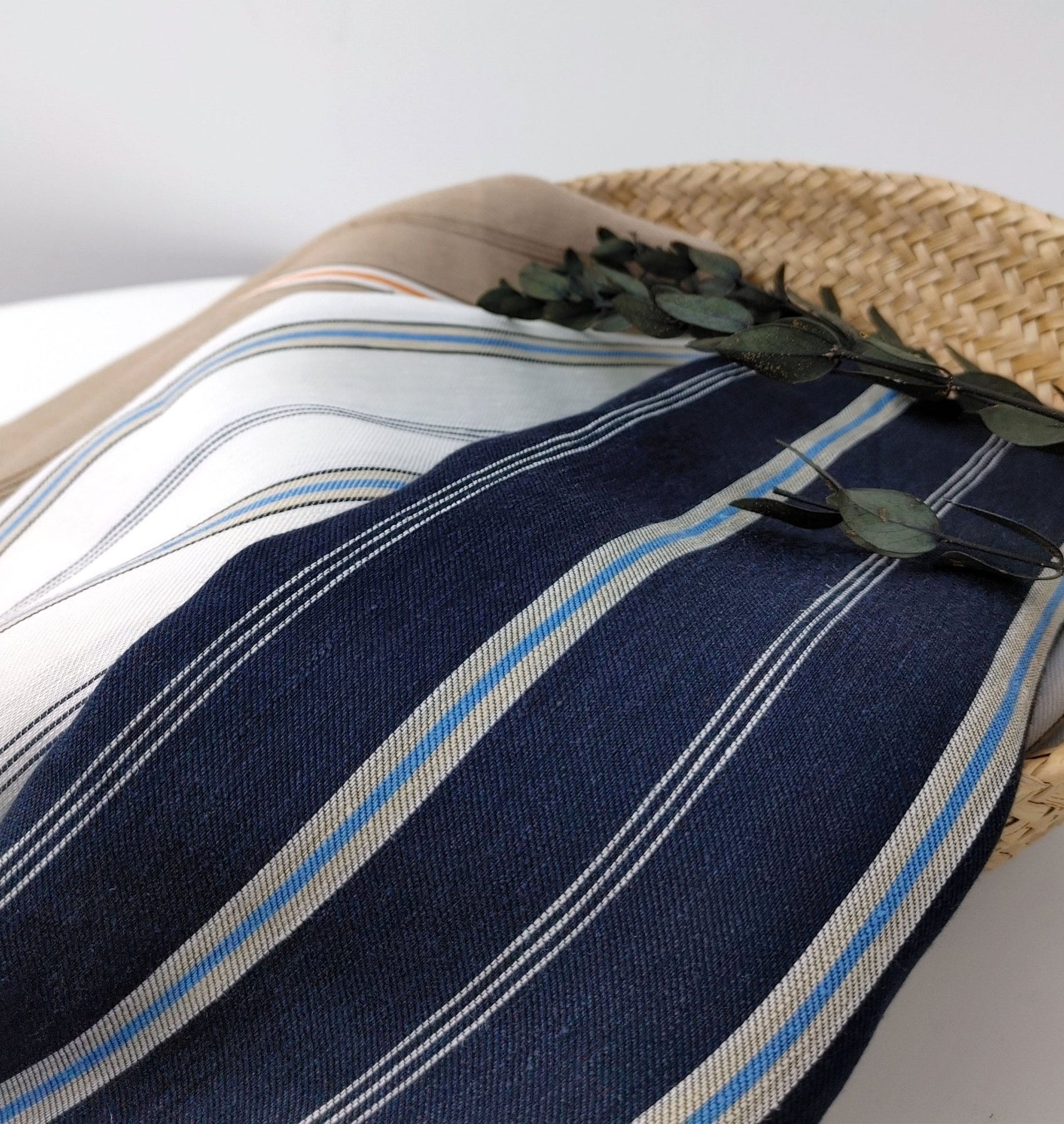 Introducing a fabric that seamlessly combines style and luxury: Linen Rayon Twill with a captivating stripe pattern and a very subtle glossy effect. The warp features high-quality linen, while the weft is composed of high-twisted rayon filament yarn, providing a nuanced sheen to the fabric.