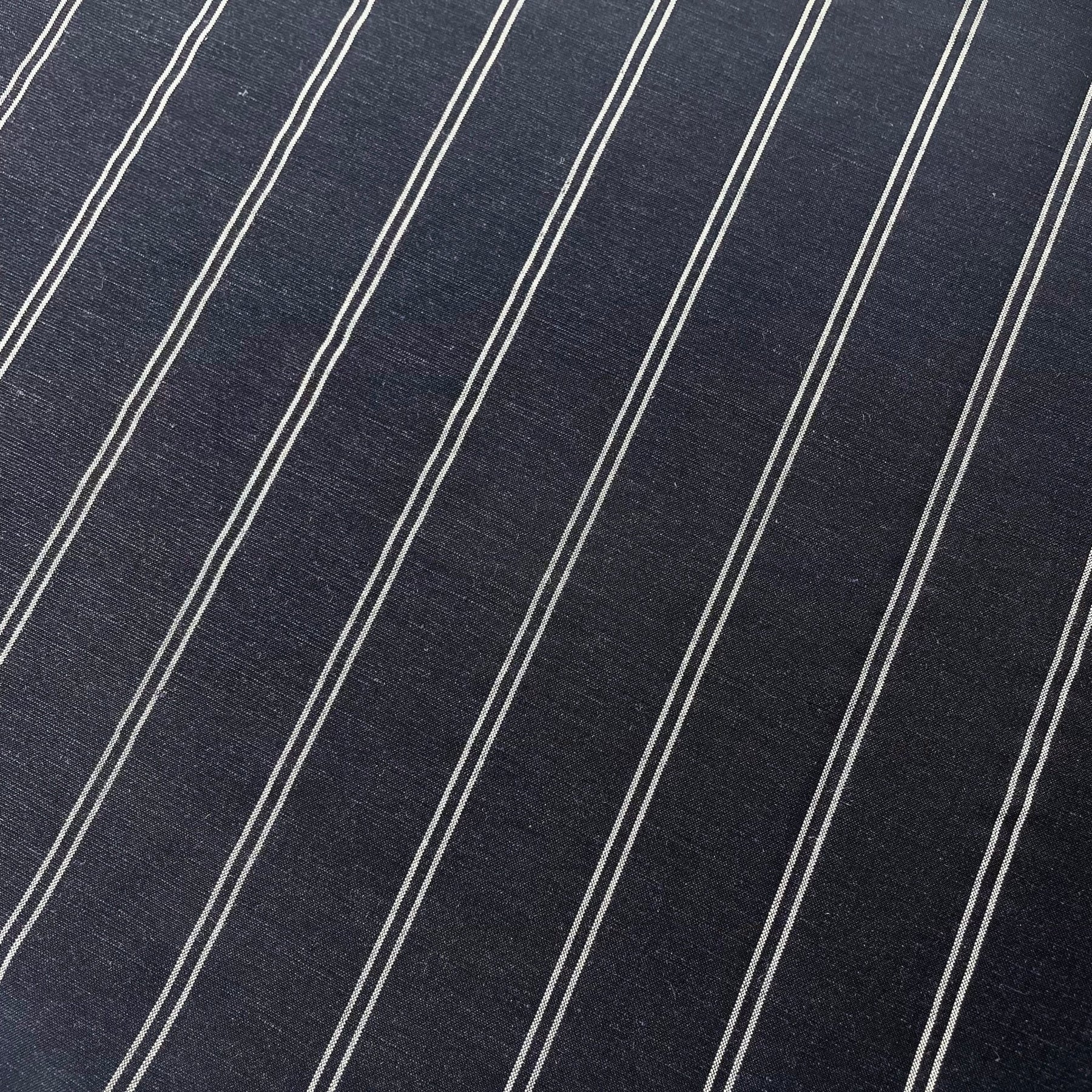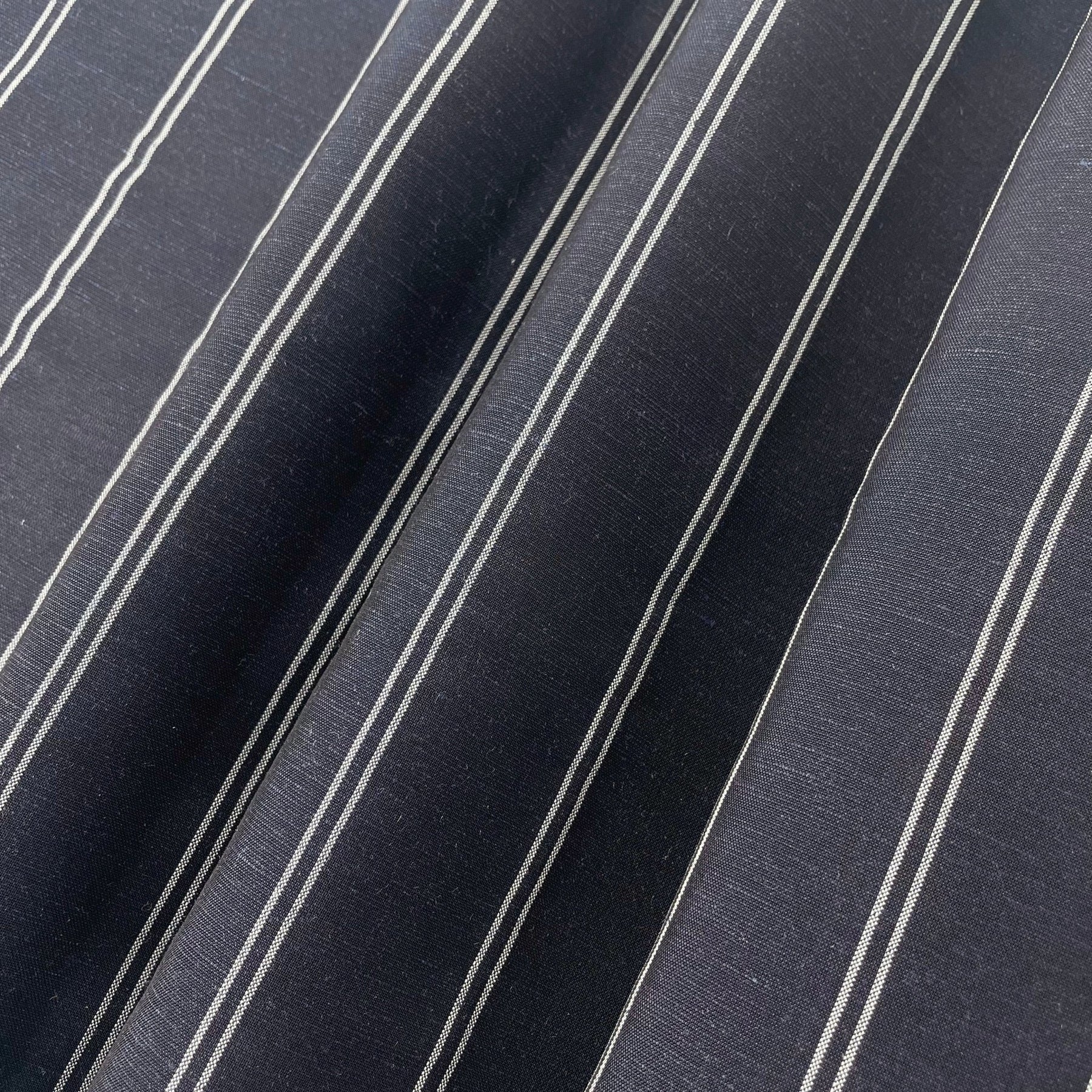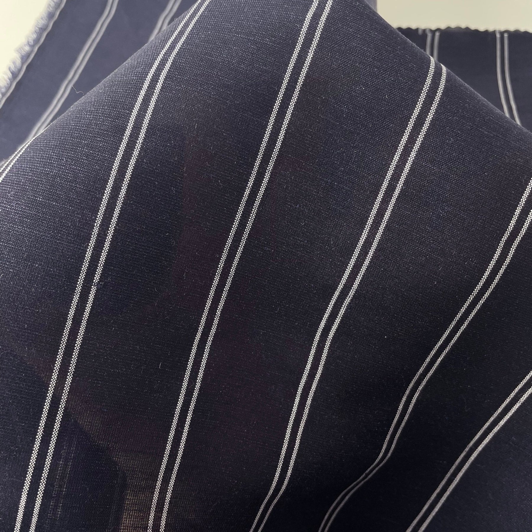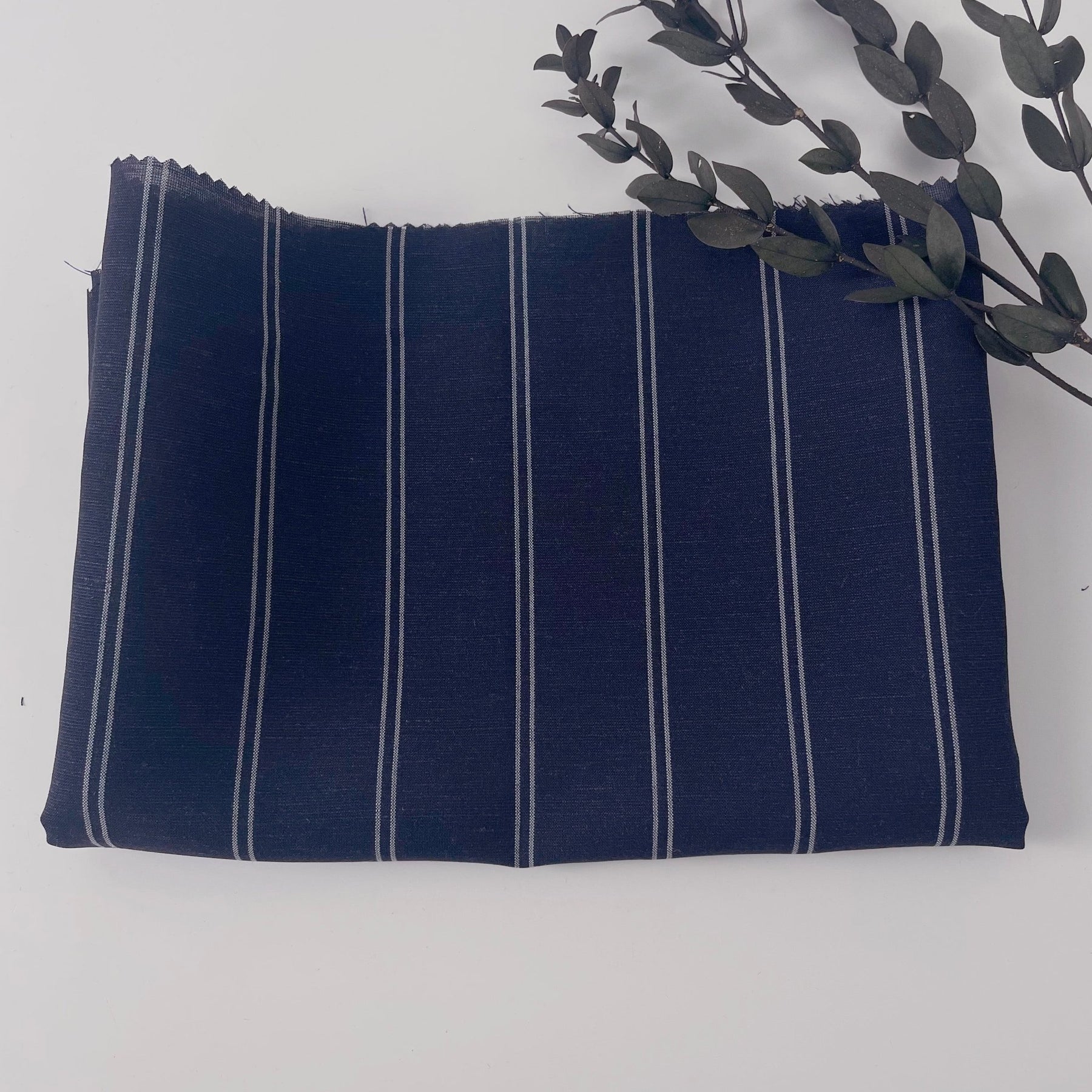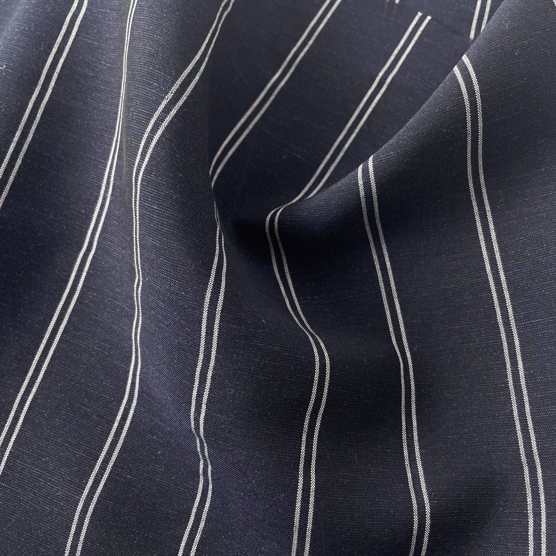This fabric is composed of Linen, Tencel, and Rayon and features a thin white 2-pin stripe. It has a high density and provides a crisp and cool sensation to the touch.