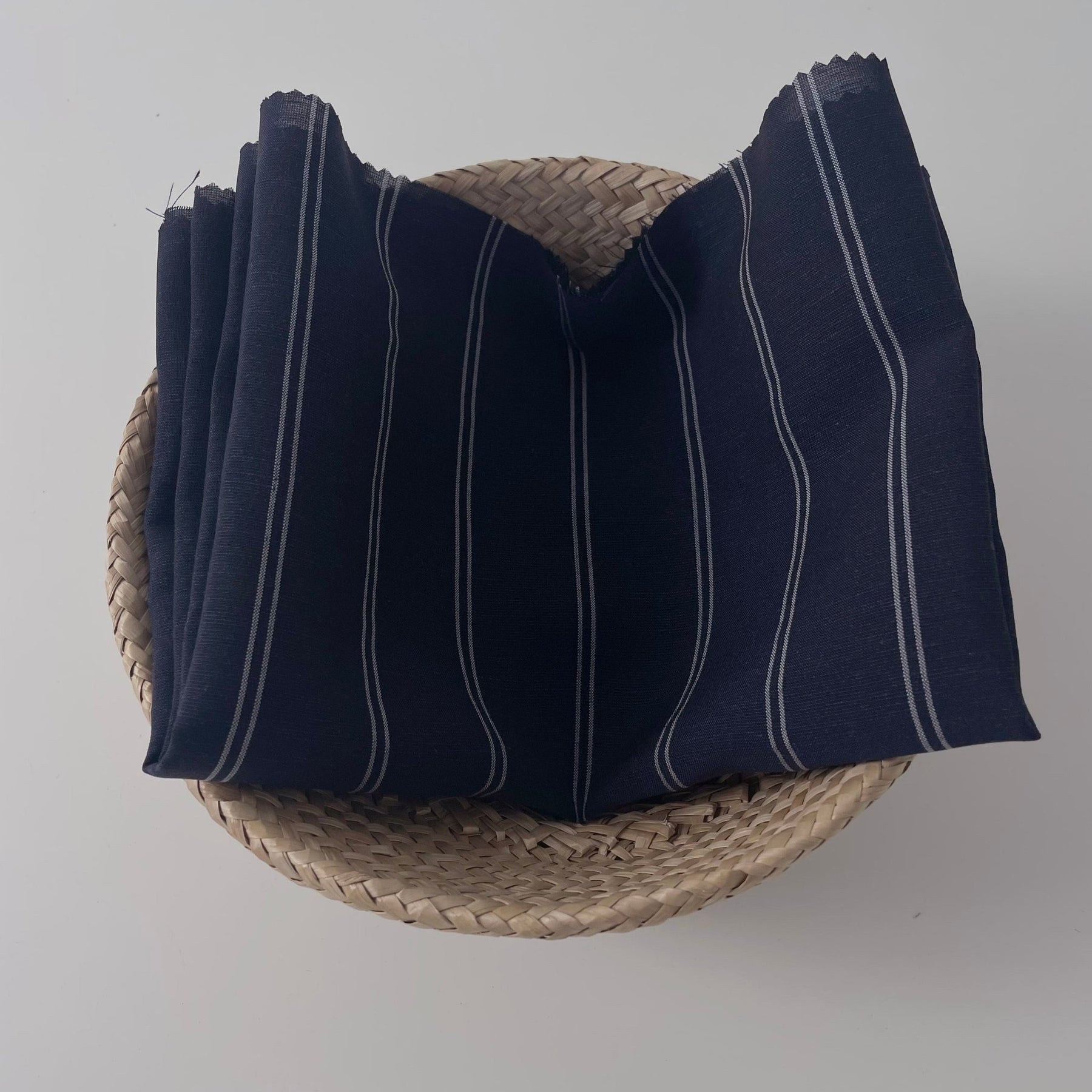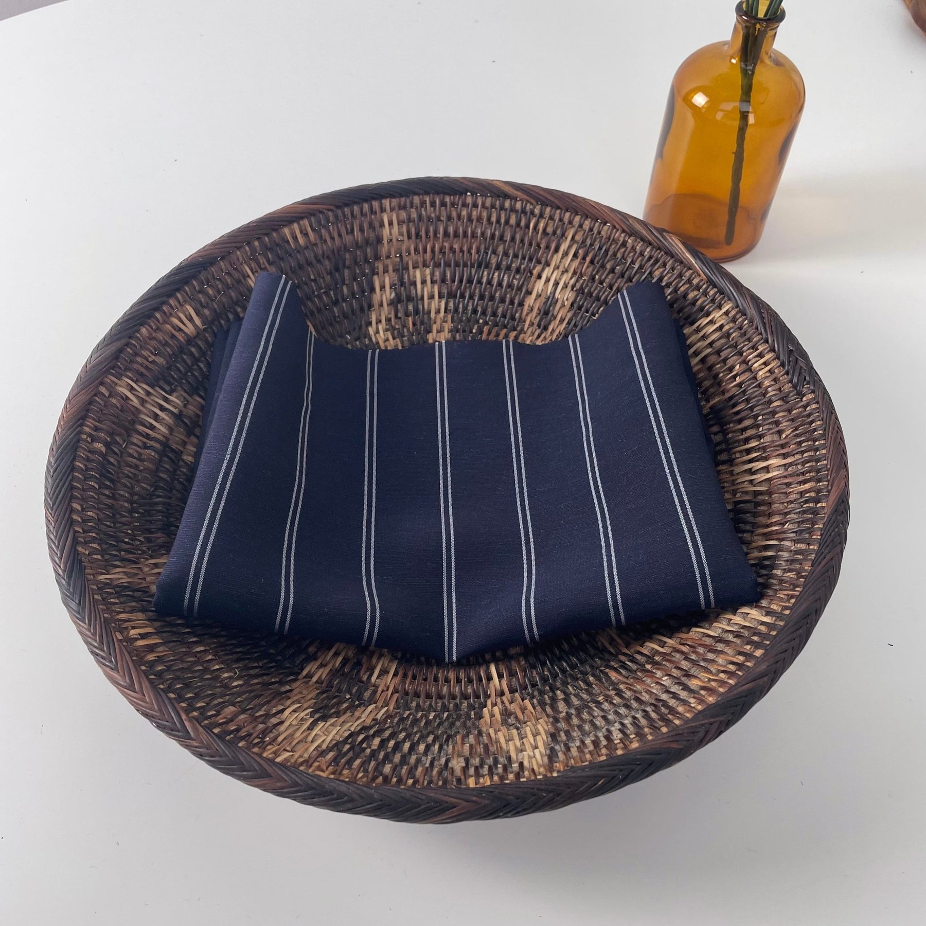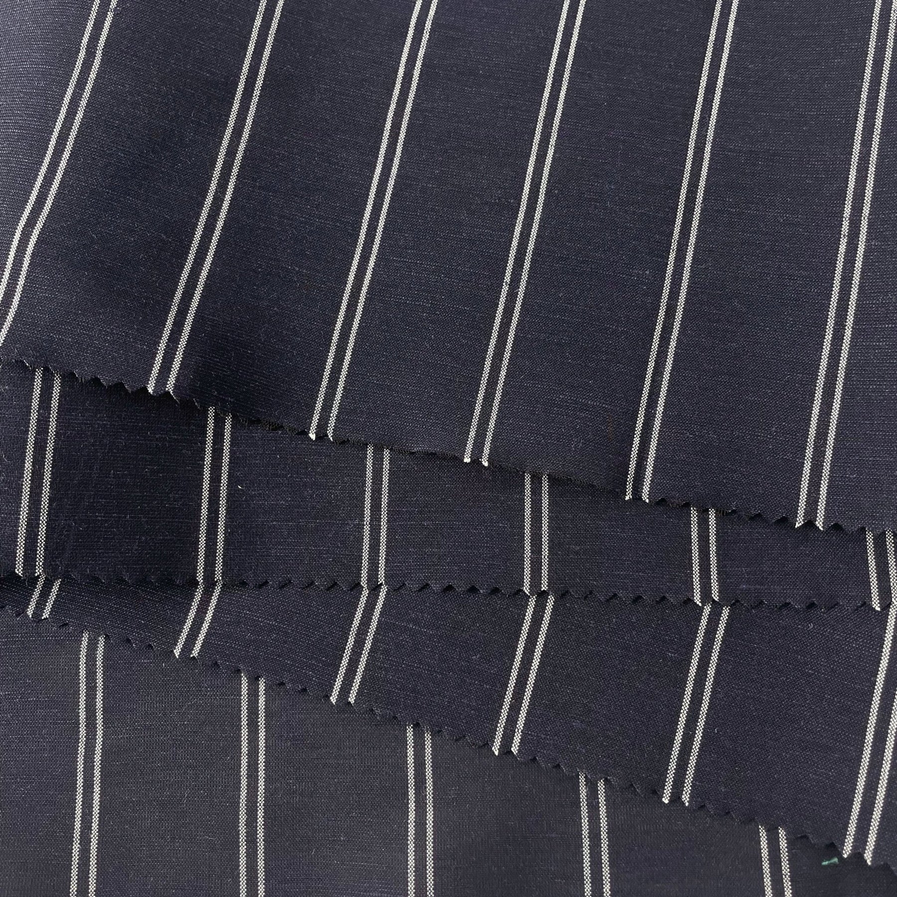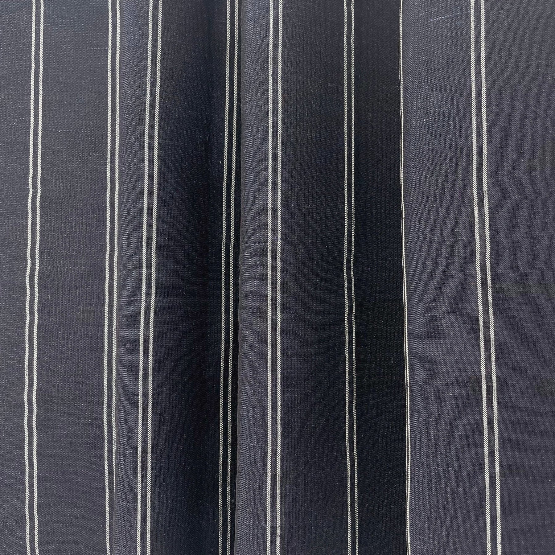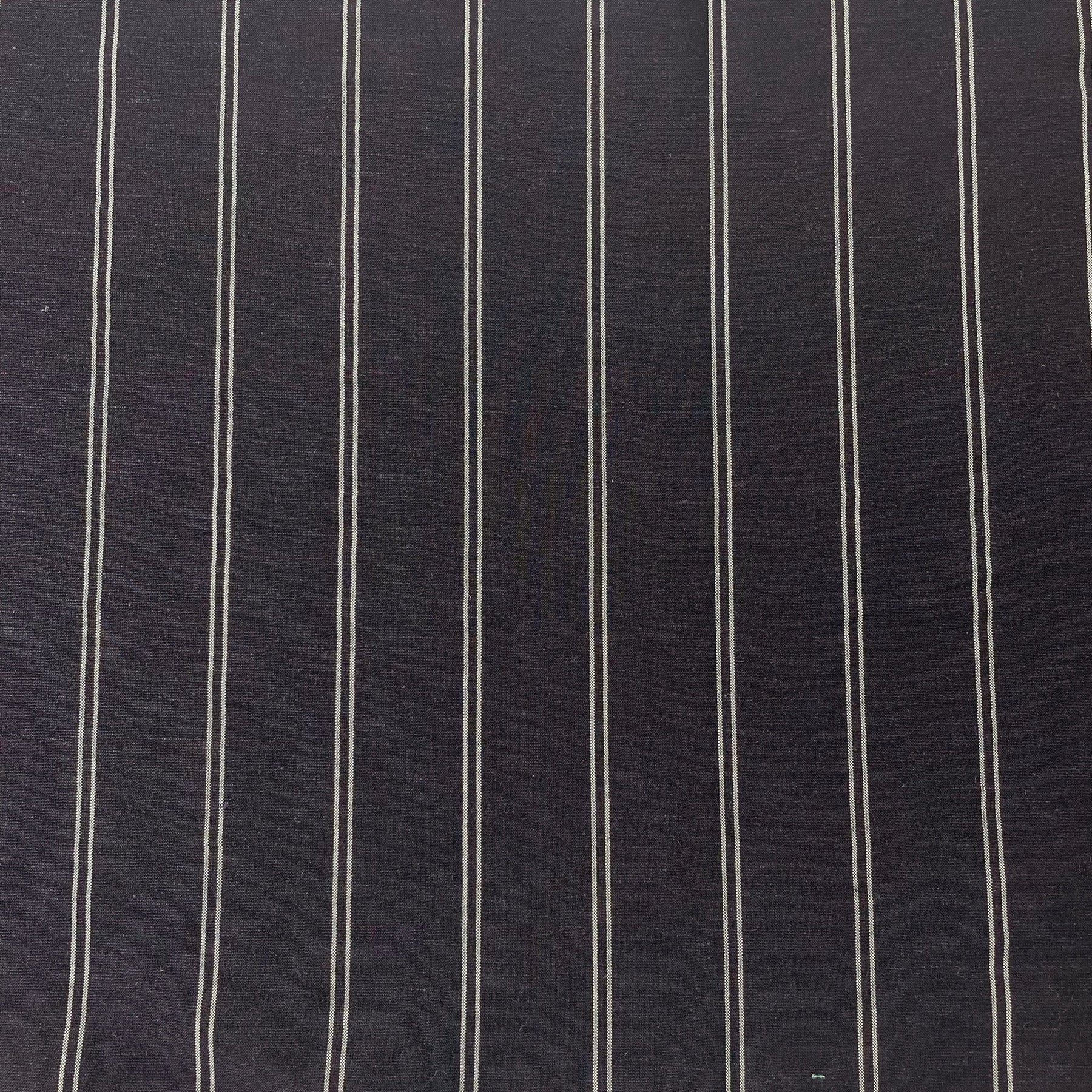 This fabric is composed of Linen, Tencel, and Rayon and features a thin white 2-pin stripe. It has a high density and provides a crisp and cool sensation to the touch.
