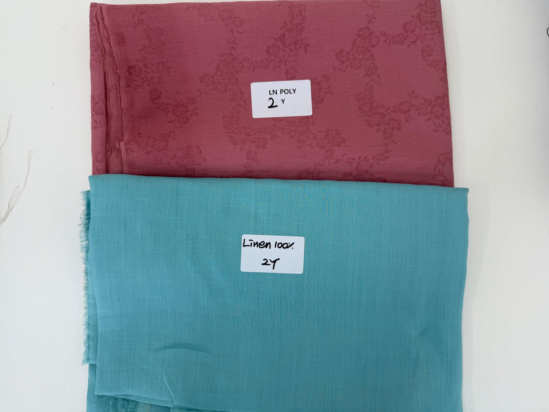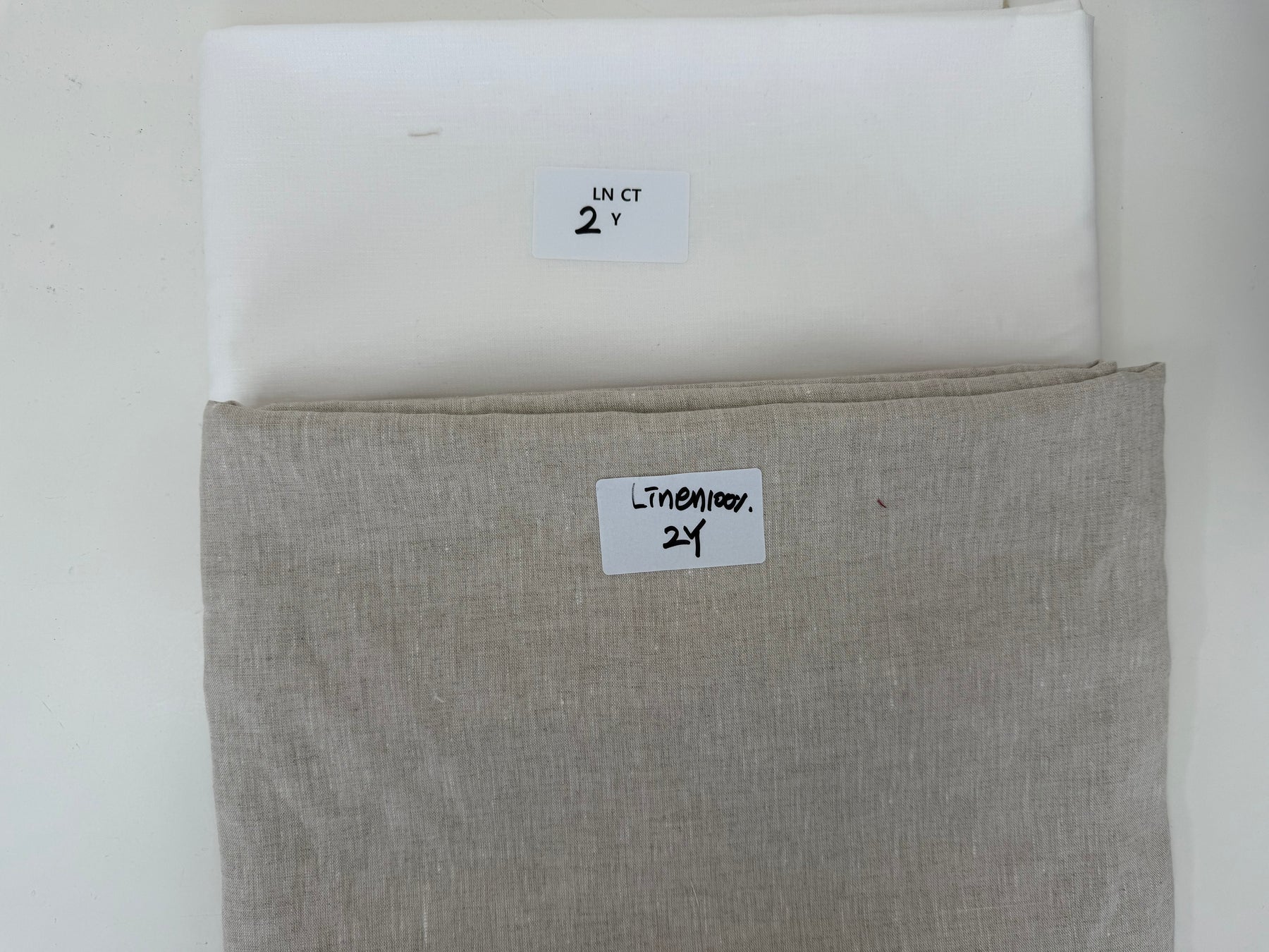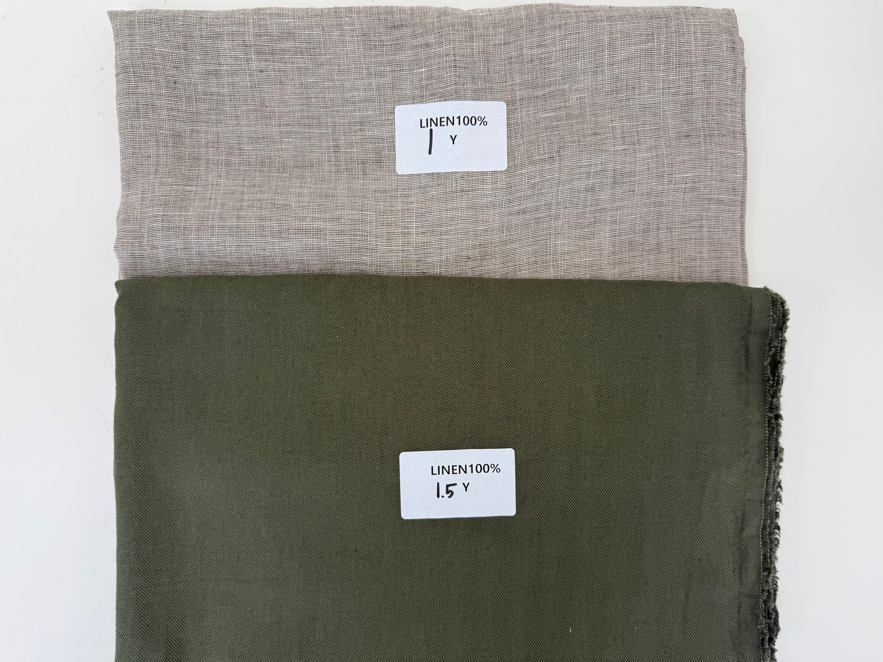 Total 23y, 13 fabrics Get creative with our Linen Fabric Surprise Box! Inside, you'll find  kinds of fabric, including 100% Linen, Linen/Cotton, Linen/Nylon/Cotton, Linen/Rayon Each pieces ranges from 1 ~ 3 yards, giving you a total of 23 yards of fabric to work with.