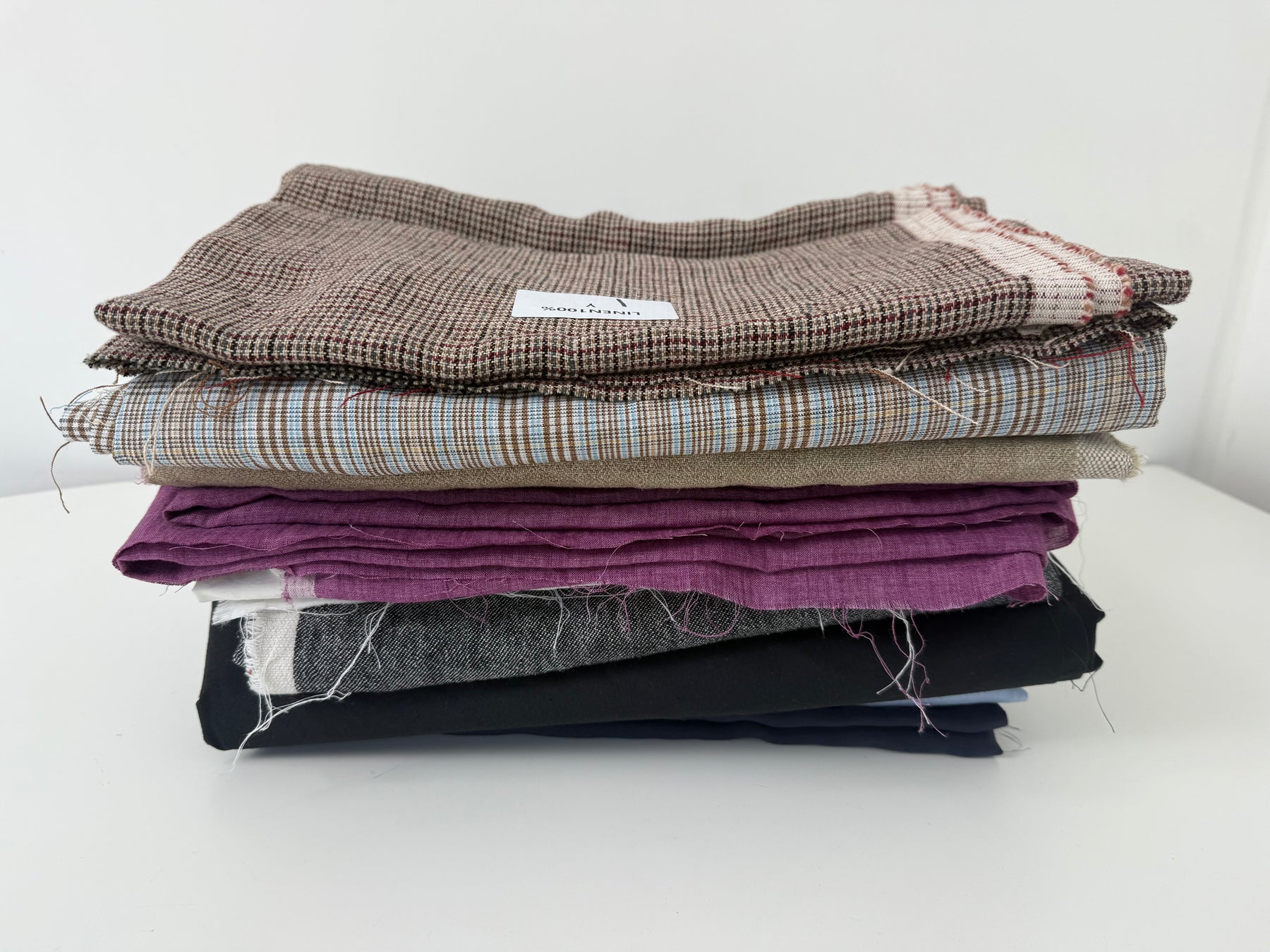 Total 24.5y, 13 fabrics Get creative with our Linen Fabric Surprise Box! Inside, you'll find  kinds of fabric, including 100% Linen, Linen/Cotton, Linen/Nylon/Cotton, Linen/Rayon Each pieces ranges from 1 ~ 3 yards, giving you a total of 24.5 yards of fabric to work with.