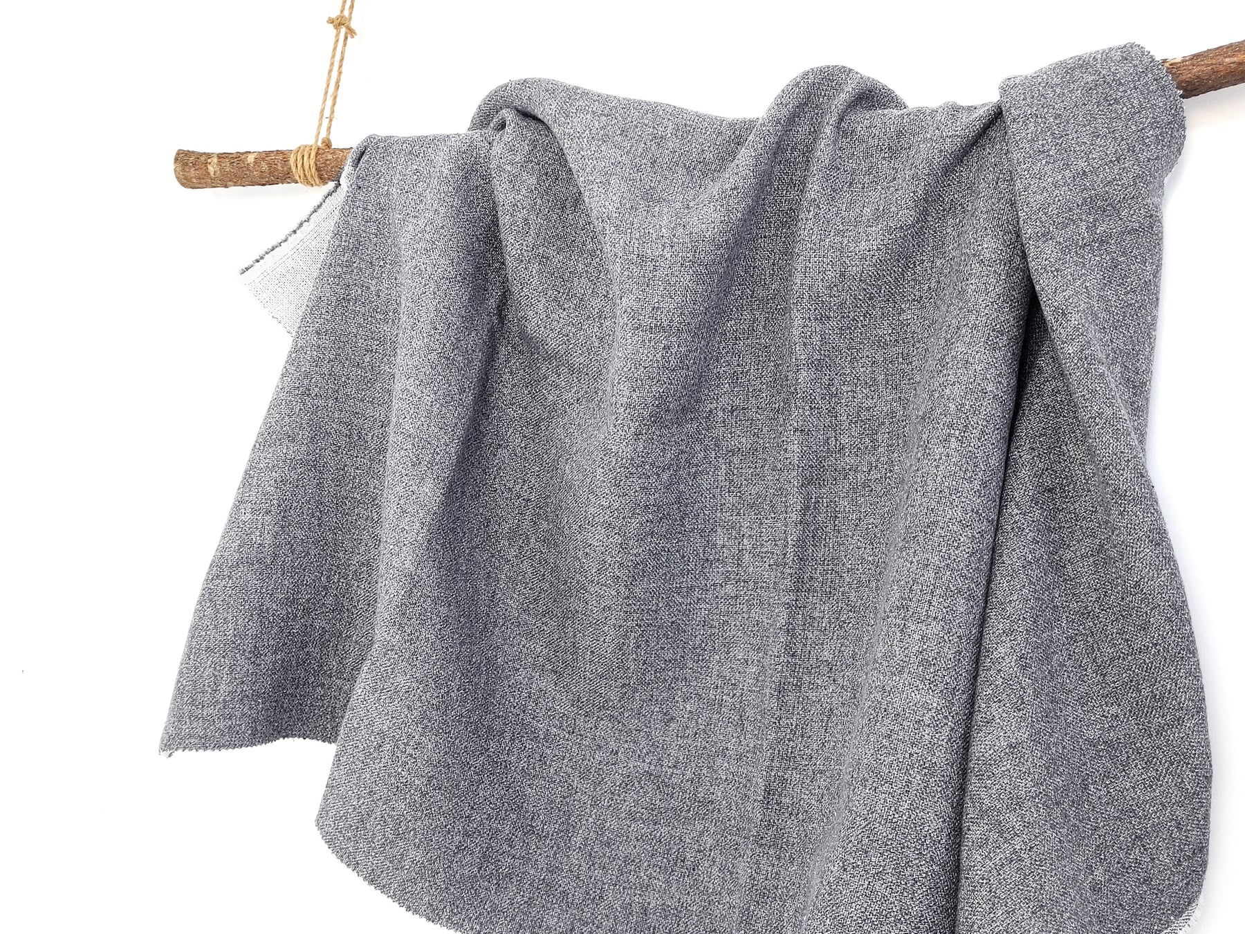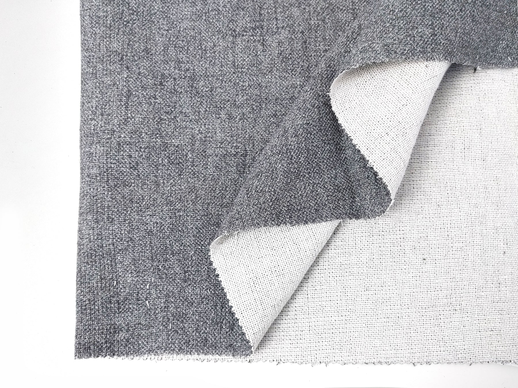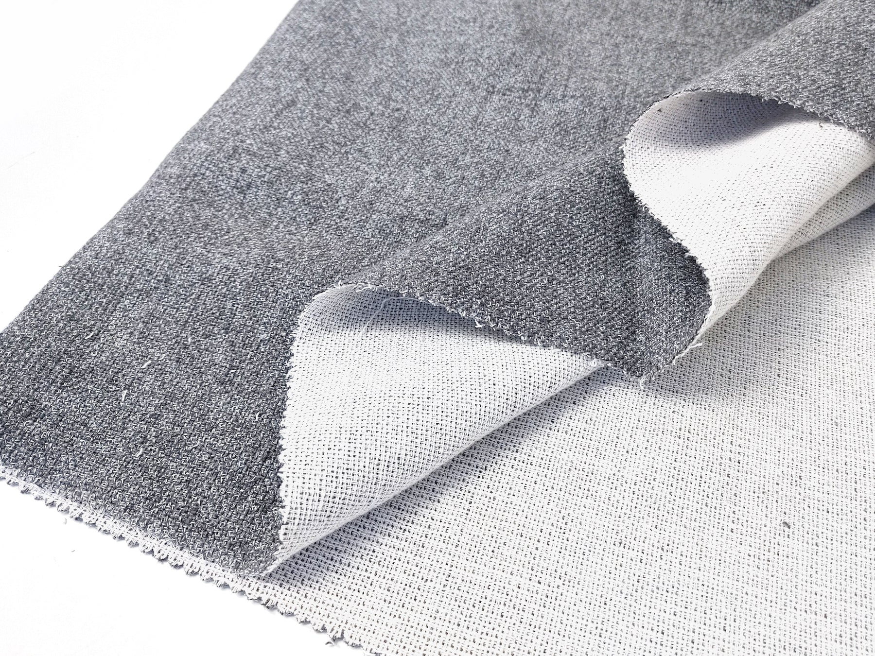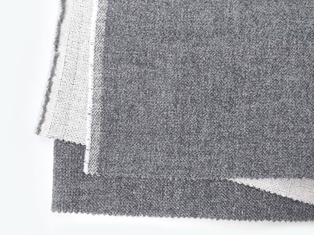 This double-face fabric offers a unique combination of textures and tones. The face side is a sophisticated grey, created by twisting 100% linen grey yarn with a linen-polyester blend yarn for added durability and character. The back side, in contrast, is a soft ivory made from 100% cotton.