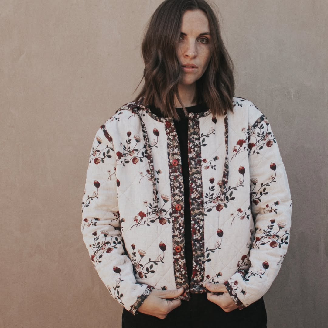 This fabric is a wrinkled linen/rayon blend with a floral design inspired by her grandmother's home.