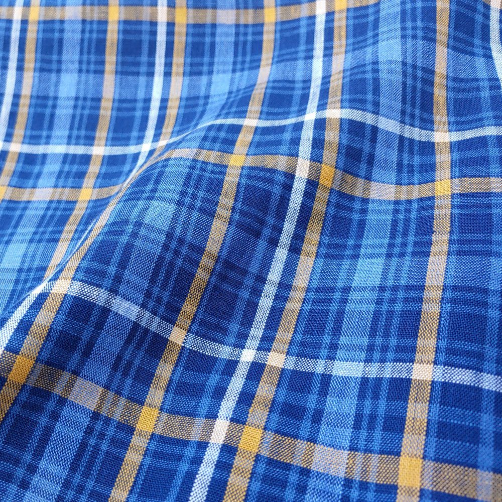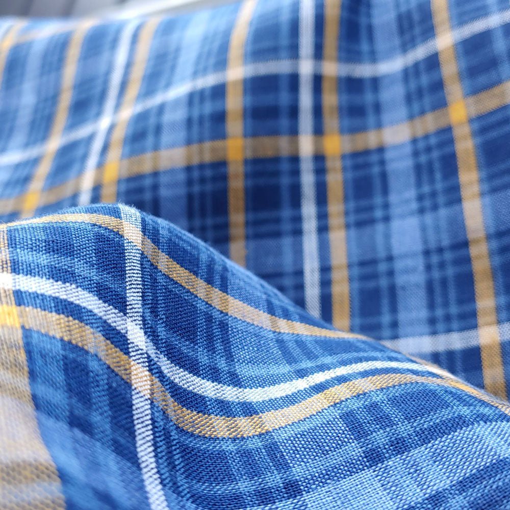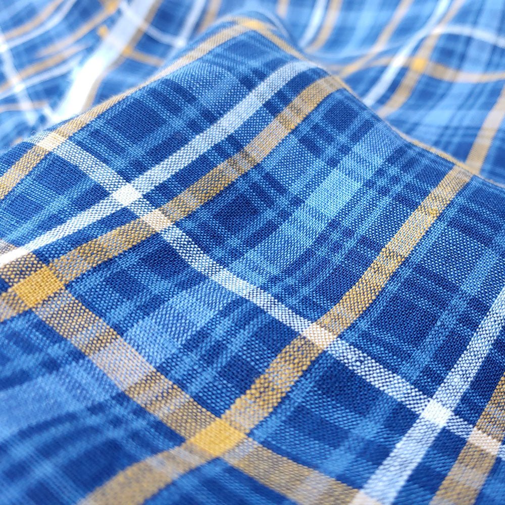 The blue check plaid design adds a touch of classic style to the fabric, making it perfect for a range of projects, from clothing to home decor. With a weight of 187 g/sqm or 5.5 oz per square yard, this fabric is just the right thickness to provide structure and stability, while still remaining comfortable to wear.