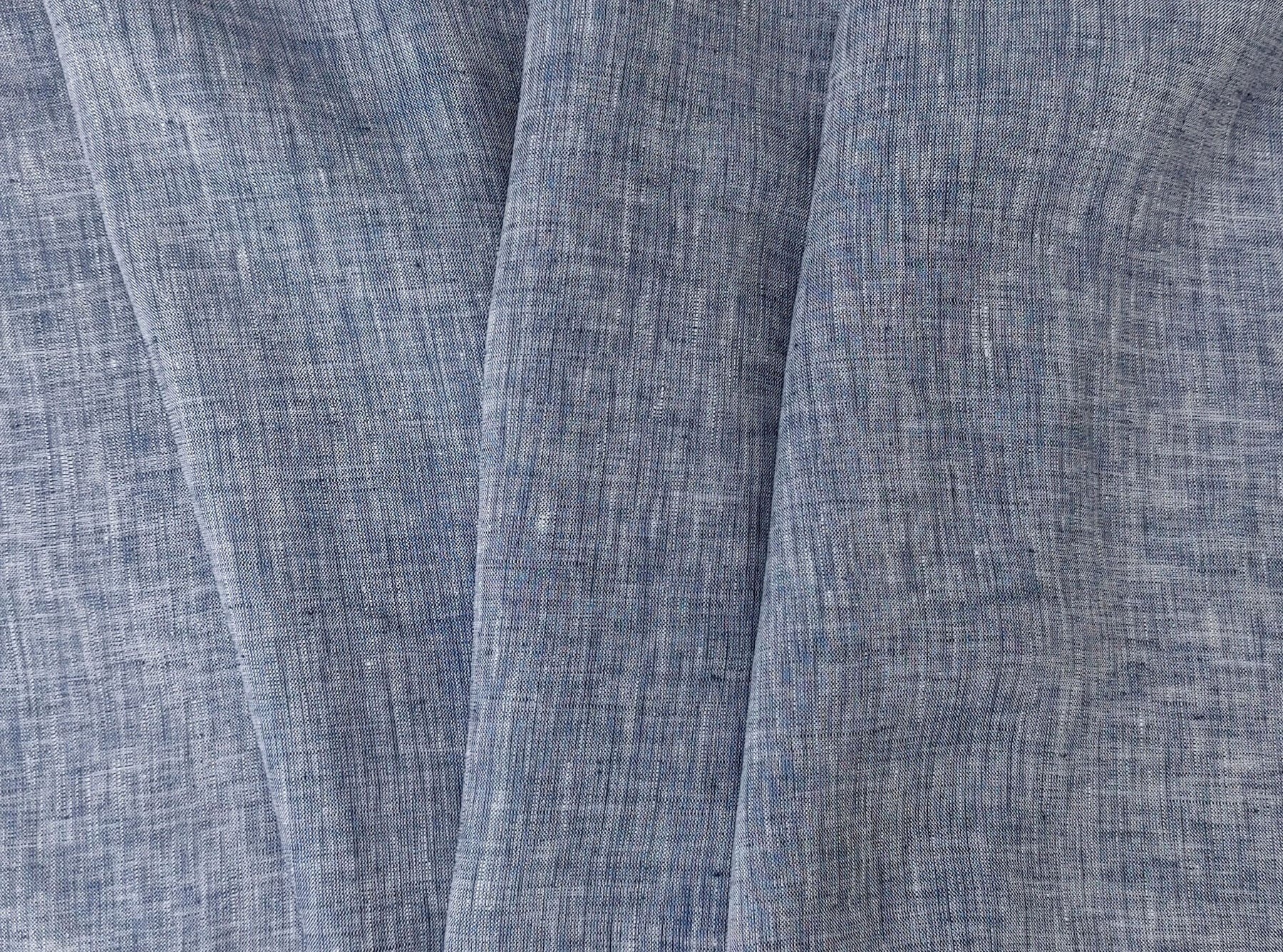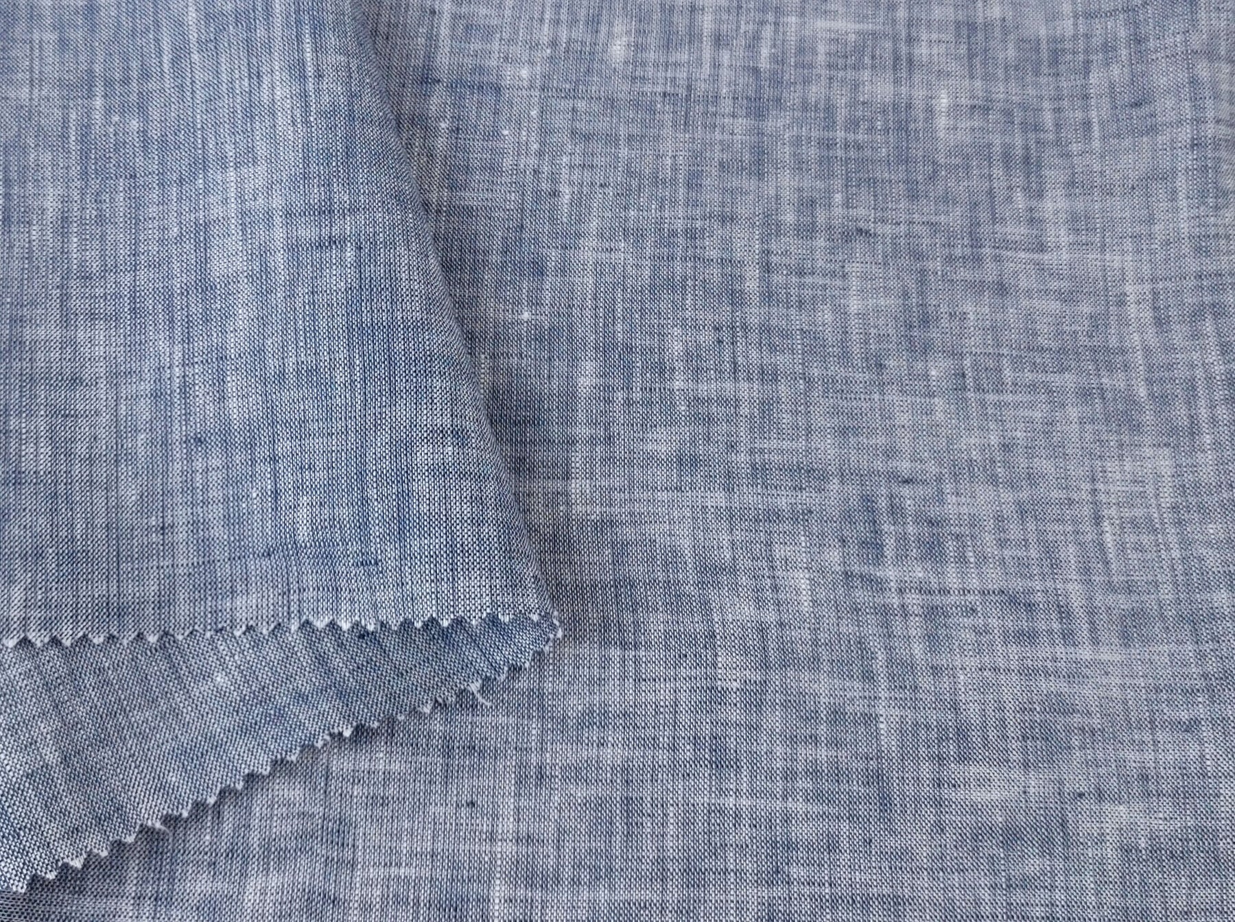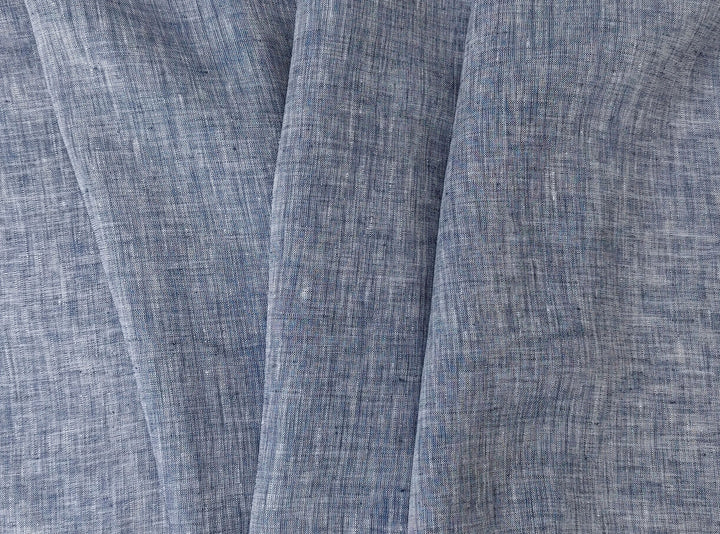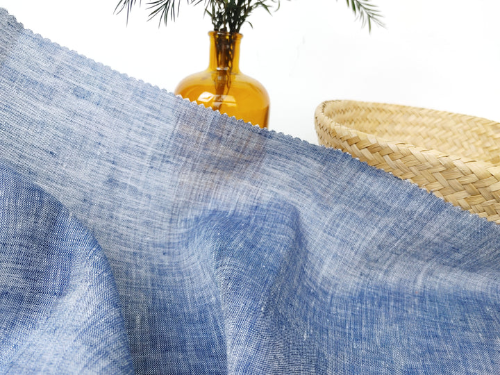 This 100% linen fabric features a blue chambray color, with a white warp and blue weft. Lightweight at 130 g/sqm (3.84 oz per square yard), it has a soft handfeel and no elasticity. With a width of 52 inches (132 cm), it's suitable for a variety of garments and textile projects that require a breathable and natural fabric.