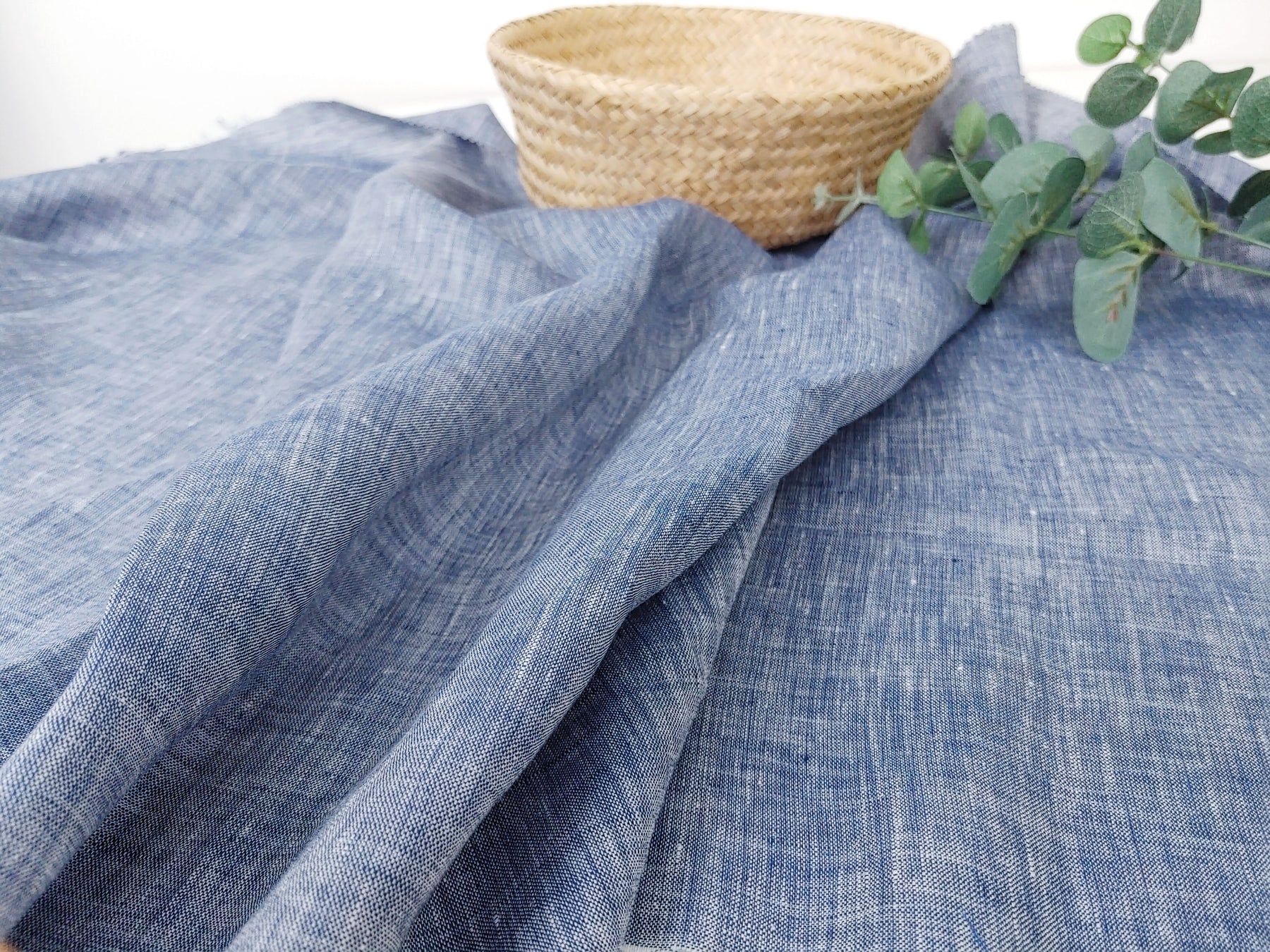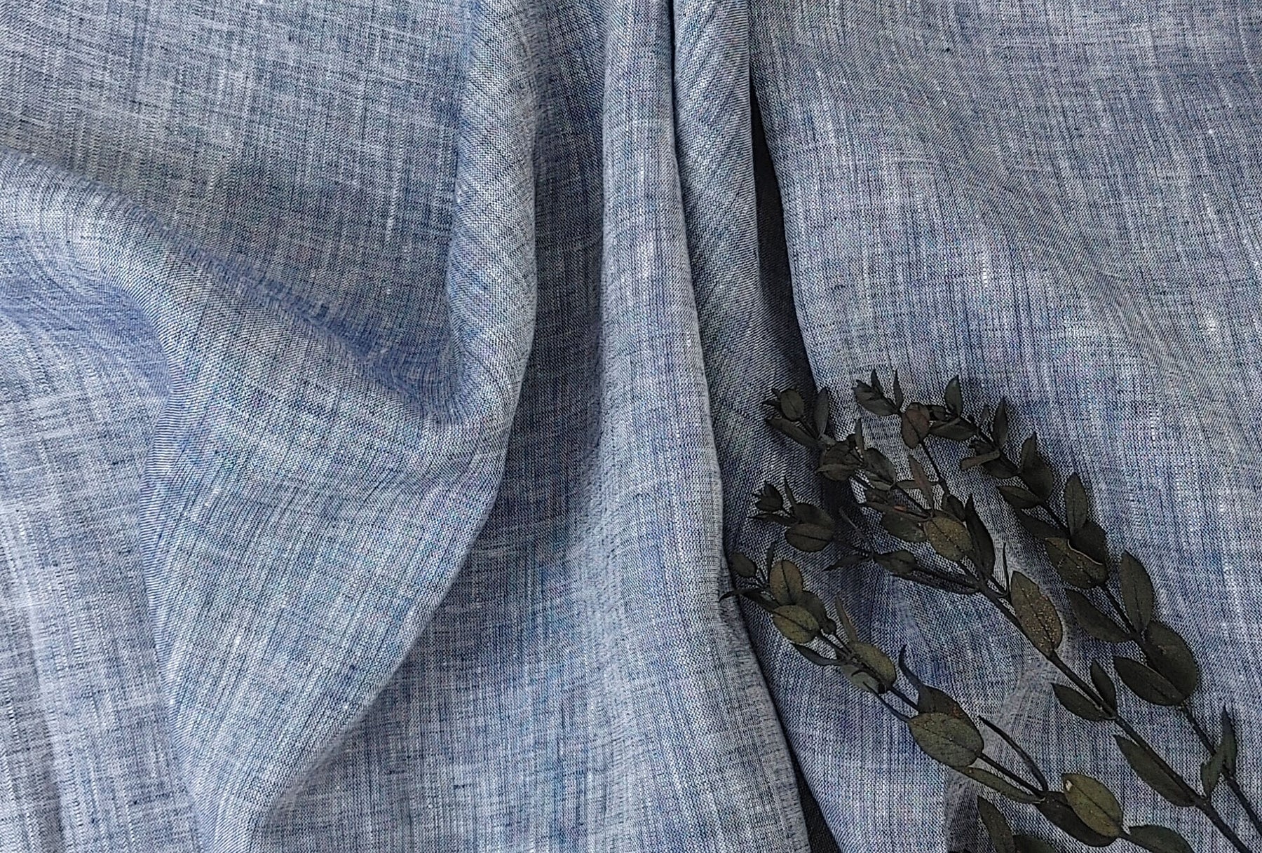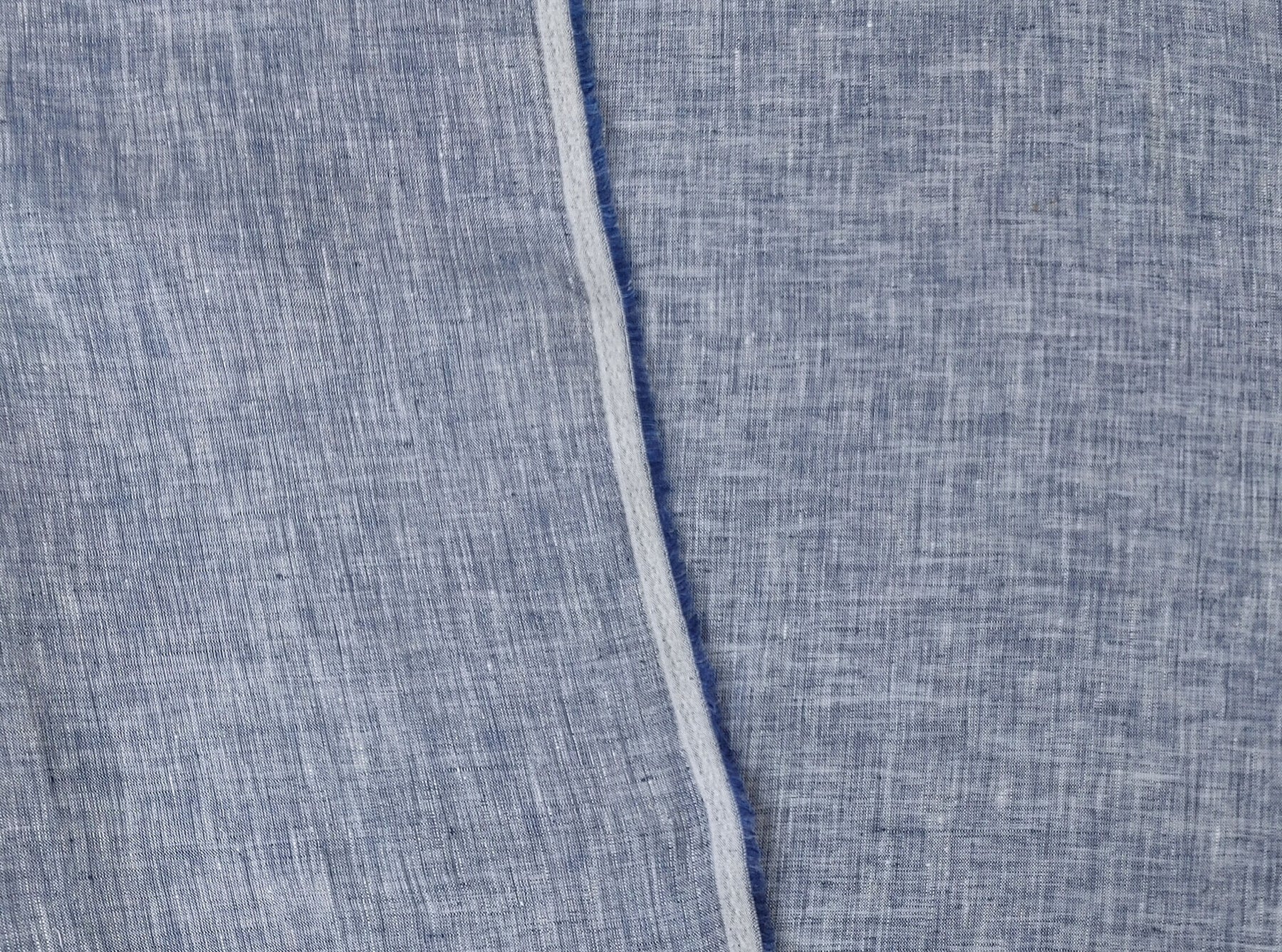 This 100% linen fabric features a blue chambray color, with a white warp and blue weft. Lightweight at 130 g/sqm (3.84 oz per square yard), it has a soft handfeel and no elasticity. With a width of 52 inches (132 cm), it's suitable for a variety of garments and textile projects that require a breathable and natural fabric.